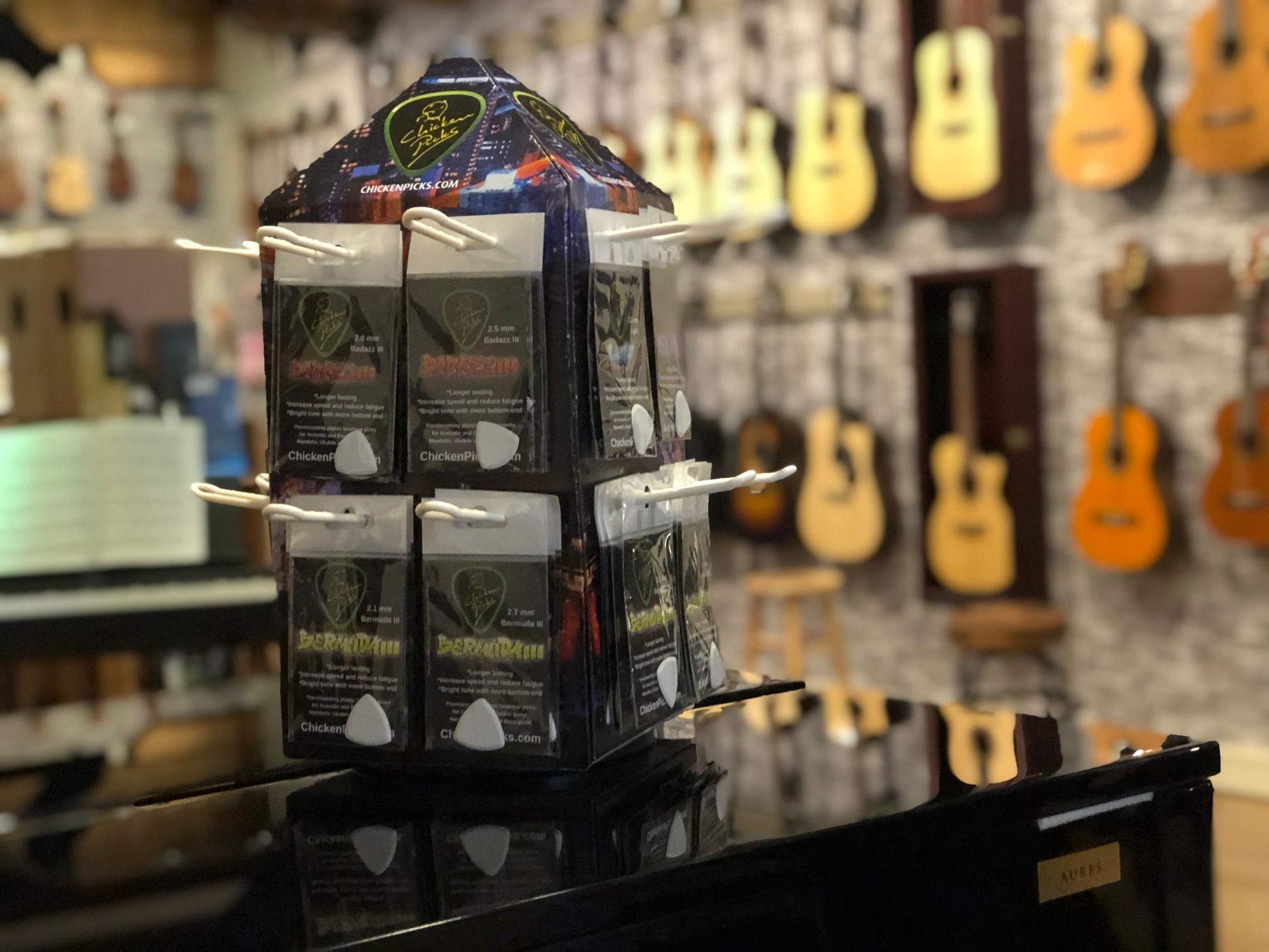 2 x ChickenPicks Bermuda IIIP 2.1 mm guitar picksThe SOUND is much more SOLID because these picks have more MASS. Not those plinky thin-, annoying- and unwanted clacky overtones, but a more pronounced loud-, clear- and BRIGHT tone with lots of BOTTOM-END.Your guitar never sounded so full and you never played fast and picked accurately that easy.The thickness of the body, coupled with the texture of these picks make it very easy to hold while at the same time, avoiding the need to grip too firmly.The thermosetting plastic is very rigid (not bending at all), eliminating any pick drag thereby allowing YOU to control YOUR sound.The material also helps avoiding chipped edges, and ensuring months, if not years, of uninhibited, uninterrupted playability. Due to the material and beveled edges ChickenPicks guitar picks are very adaptive to pinch harmonics, which have never been easier to create. The beveled edges allow the pick to glide on and off the strings effortlessly making it easier to play (as compared to a conventional thick- or heavy pick.
