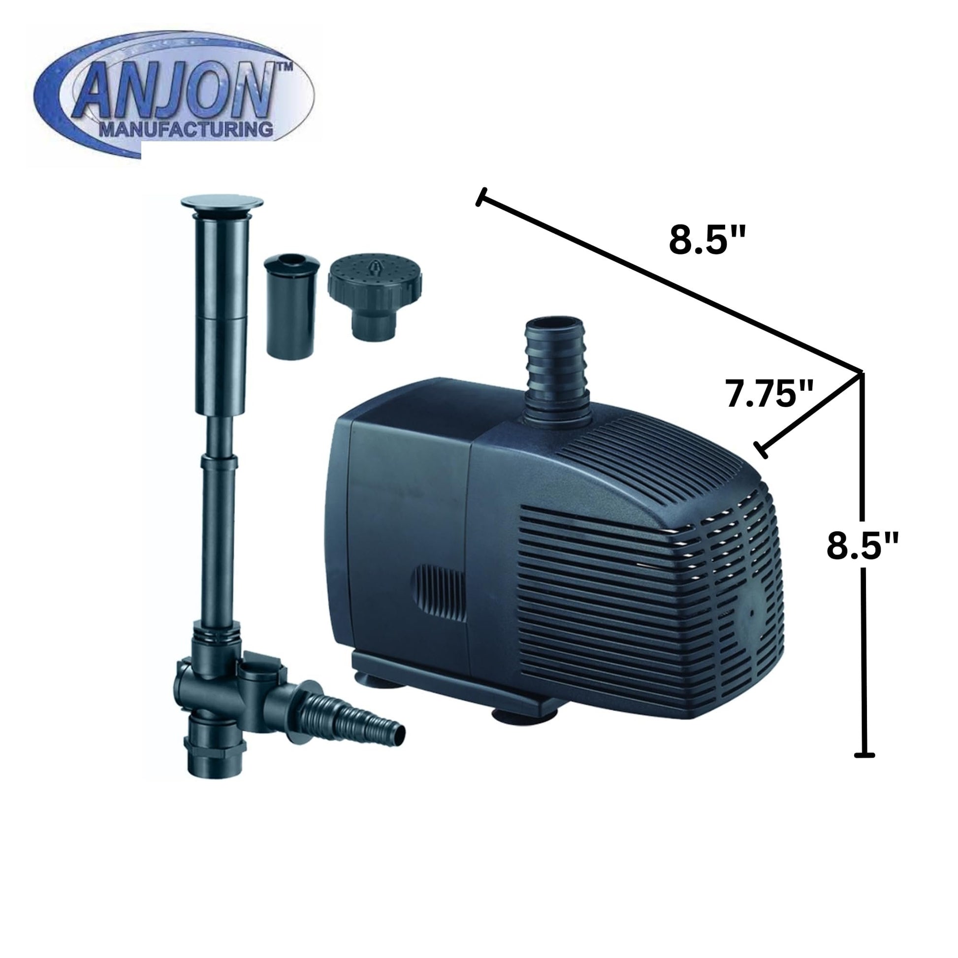 ANJON MANUFACTURING LF-950 Little Frog Fountain Pump 950 GPHComes with 3 different nozzles to create unique display patterns with an included diverter valve to flow water to a spitter or small waterfallMaintenance free design, with epoxy encapsulated motors and stainless-steel impeller shaftNear silent operation for years of trouble-free operationEnergy efficient. Adjustable flow, pre-filter: 12� power cordBacked by a 1-Year Manufacturer�s Warranty!