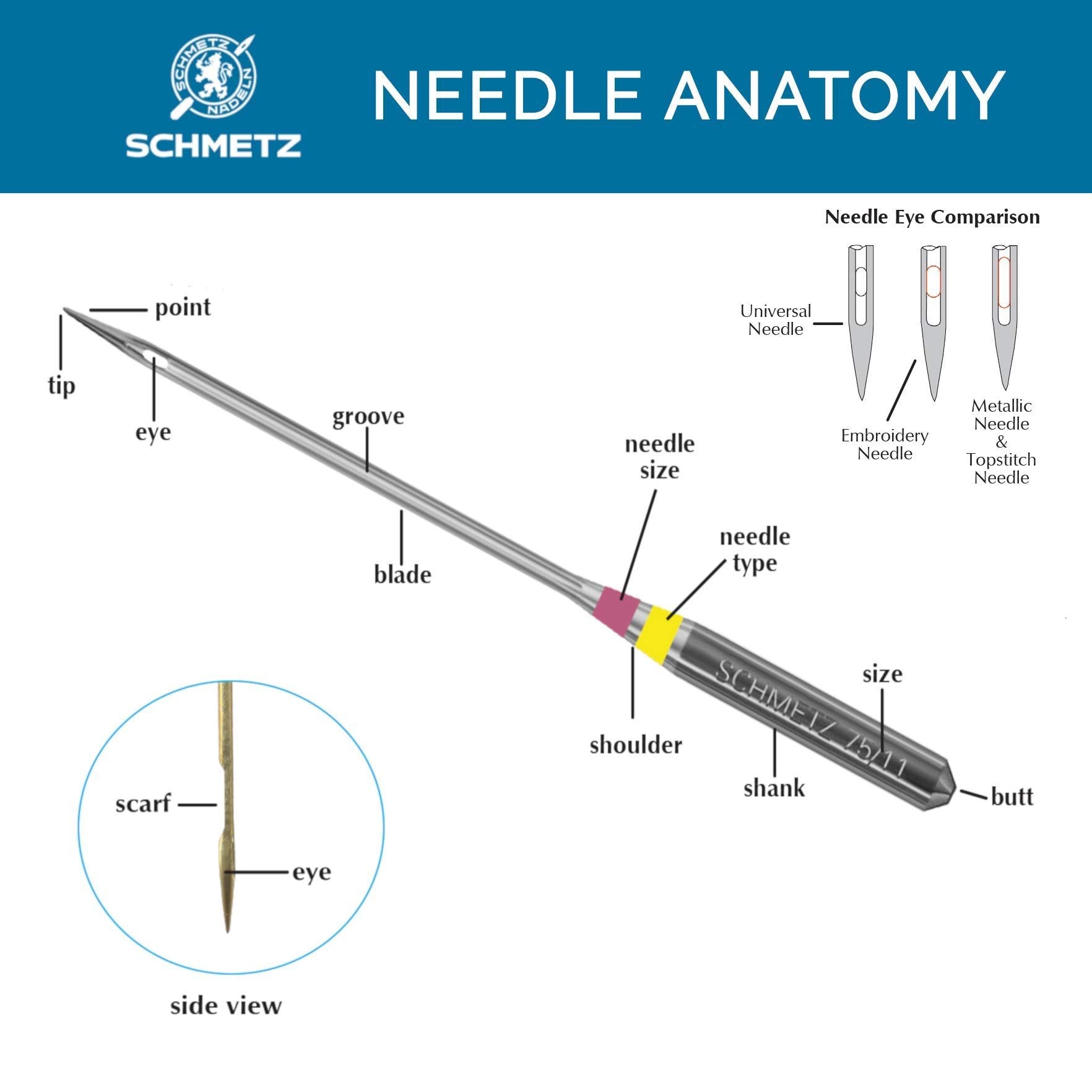 There is a new needle in town . . . SCHMETZ Chrome Professional Grade needles! Power Quilters, Embroidery Enthusiasts and Stitch Mavens are sewing faster and more intensely than ever. New home sewing machines are built to sew faster than ever - 1000 stitches/minute and more. SCHMETZ Chrome Professional Grade is the perfect sewing partner. Chrome will stay cool longer with less stitch distortion. For years Chrome has been the needle choice by industry professionals, and now SCHMETZ Chrome is available for our home sewing machines.Schmetz Chrome Needles resist heat and wearChrome aids the thread to pass through the needle eye with less friction and less heat build-up. Chrome also allows the needle to pass through the fabric with less resistance.50 Schmetz Chrome Embroidery needlesChrome plated. Light ball point, wide eye and groove.Use with rayon, polyester and other specialty embroidery threads. The special scarf, widened groove and enlarged eye protect fragile threads and guard against excess friction allowing trouble-free embroidery and decorative stitching.