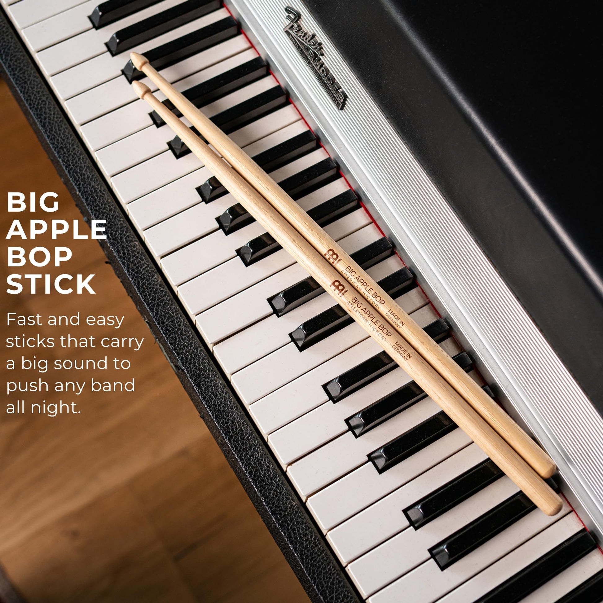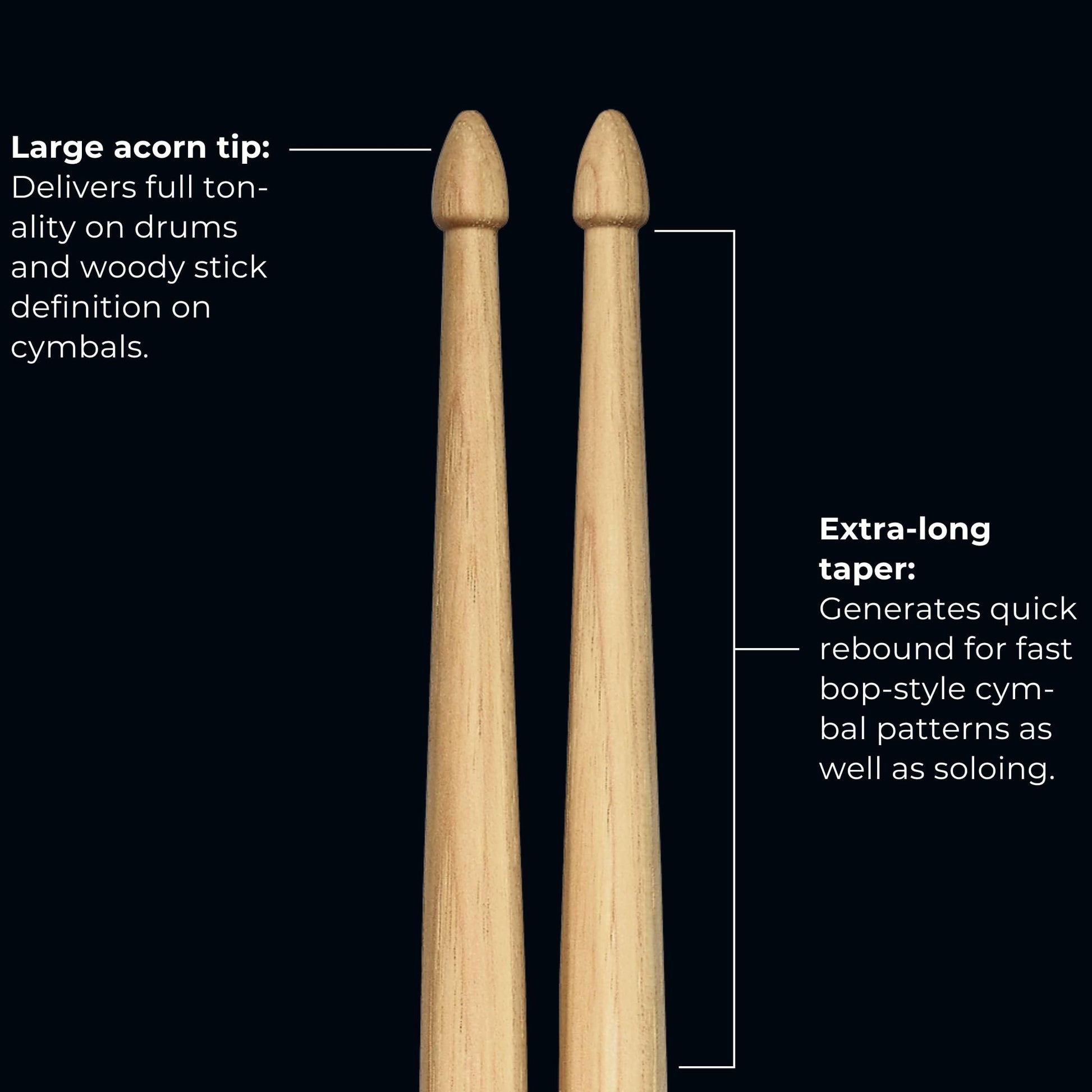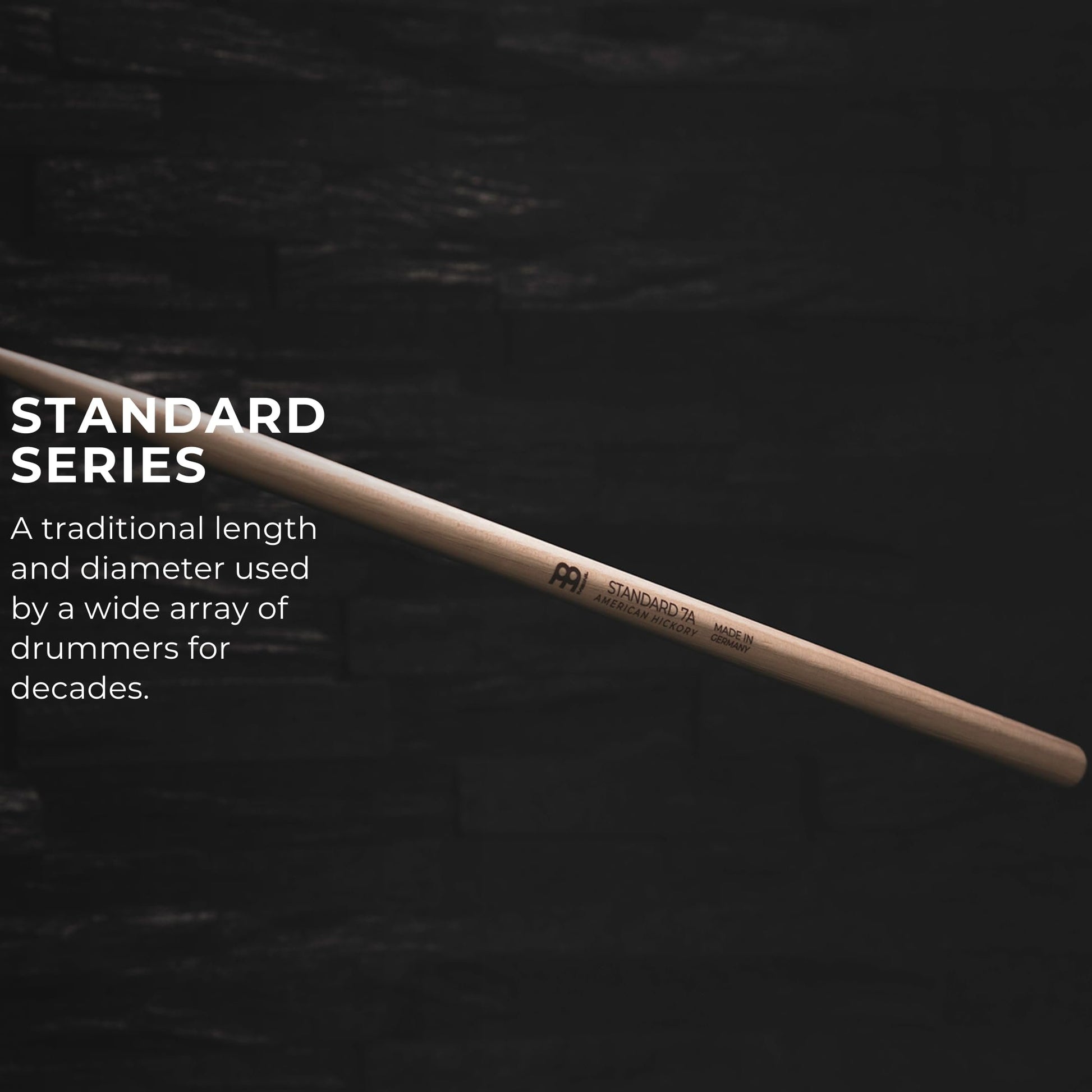 Meinl Stick & Brush Drumsticks, Standard 7A - American Hickory with Acorn Shape Wood Tip - MADE IN GERMANY SB100ALWAYS FEELS THE SAME: raw wood dowels are pre-sorted by weight and density before becoming drumsticks; this ensures a narrower weight range for your go-to sticks, so they always feel the way you expectWHY IT MATTERS: there's no adjusting to a different weight when you buy a new pair; having this consistent of a feel with your drumsticks helps you stay focused while performing and practicingSTANDARD 7A SPECS: 16" long, 0.535" diameter, acorn shape wood tip, medium taperZOOM IN: the classic acorn shape wood tip brings out a bright and full sound on cymbals; get definition along with a supportive wash that's present through all dynamics without taking overOF NOTE: a medium length taper keeps this stick incredibly well-centered and balanced, giving you even rebound that’s easy to controlCATCH UP QUICK: these drumsticks are made in Germany from premium United States hickory for strength and durability; hickory is our strongest wood type and is great for all-around useTHE BOTTOM LINE: Meinl Standard Series drumsticks have a traditional feel used by a wide array of drummers for decades