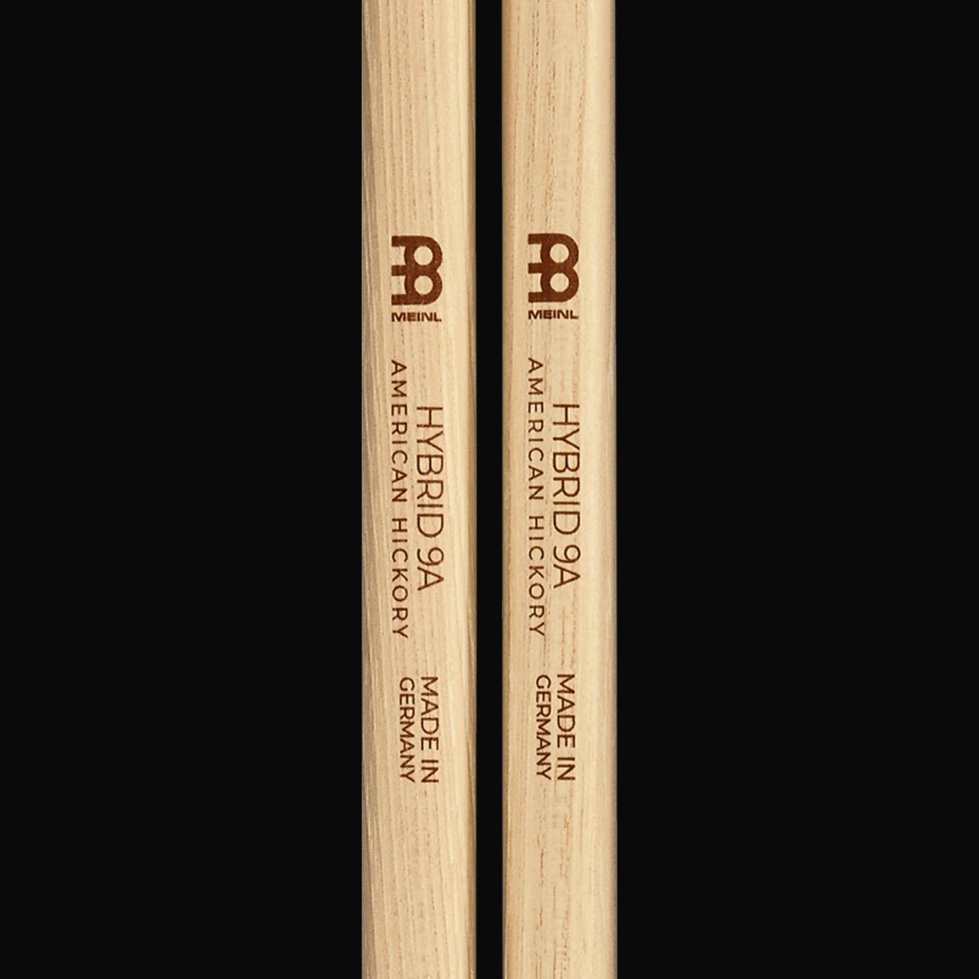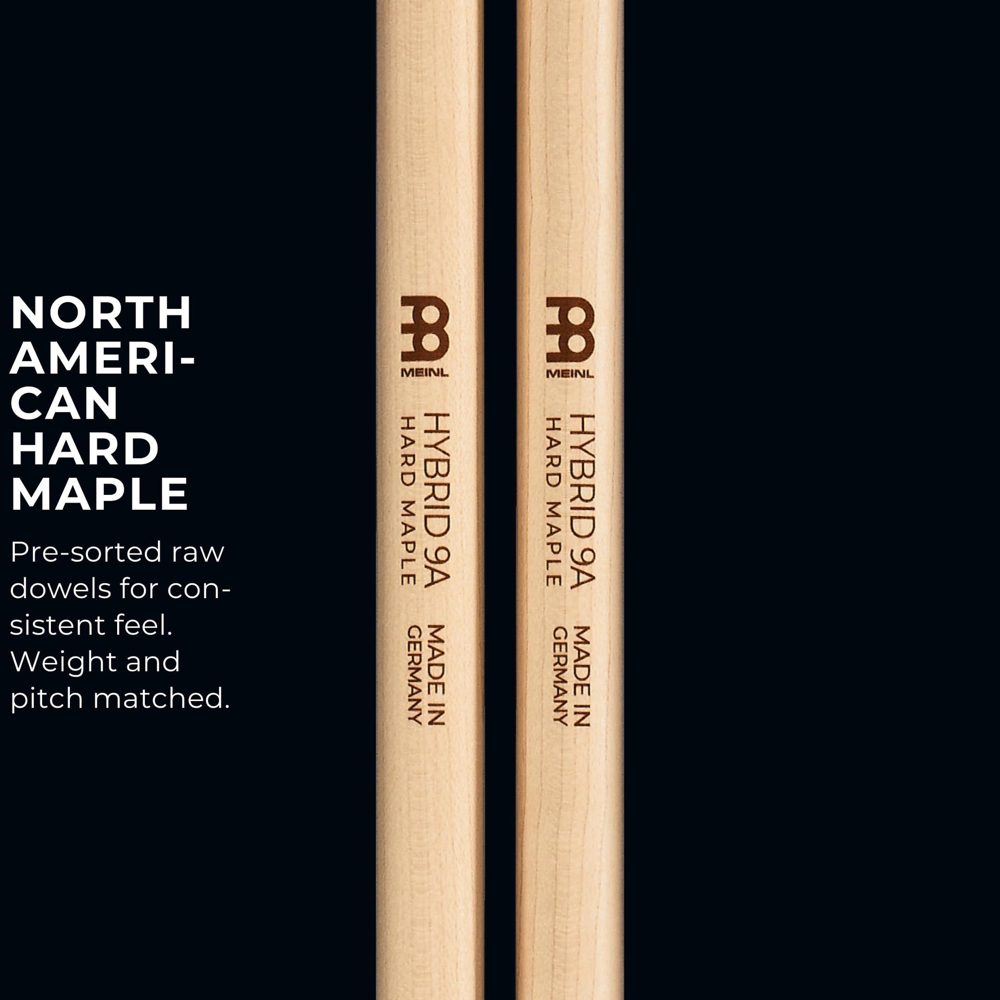 Meinl Stick & Brush Hard Drumsticks, Hybrid 9A — North American Maple with Acorn/Barrel Shape Wood Tip — Made in Germany (SB137)ALWAYS FEELS THE SAME: raw wood dowels are pre-sorted by weight and density before becoming drumsticks; this ensures a narrower weight range for your go-to sticks, so they always feel the way you expectWHY IT MATTERS: there's no adjusting to a different weight when you buy a new pair; having this consistent of a feel with your drumsticks helps you stay focused while performing and practicingHYBRID 9A SPECS: 16.25" long, 0.580" diameter, Hybrid wood tip; the extra 0.25" of reach gives you a little more power and balance when going for further out surfaces on your kitZOOM IN: the tip starts as an acorn shape, then it's trimmed down to the classic barrel size for a hybrid design that produces dark and smooth articulation on cymbalsOF NOTE: our Hybrid sticks have a two-step taper that slopes short and fast from the neck into a long, gradual taper to the body/shaft; this gives you a slight forward-heavy feel, and the two tapers work together for easy dynamic controlCATCH UP QUICK: these drumsticks are made in Germany from premium North American hard maple; maple is much lighter than hickory with a delicate touch and greater control for low volume musicTHE BOTTOM LINE: a few unique specs like the hybrid tip, extra reach, and two-step taper make Meinl Hybrid drumsticks able to cross genres so you can express yourself with diverse styles