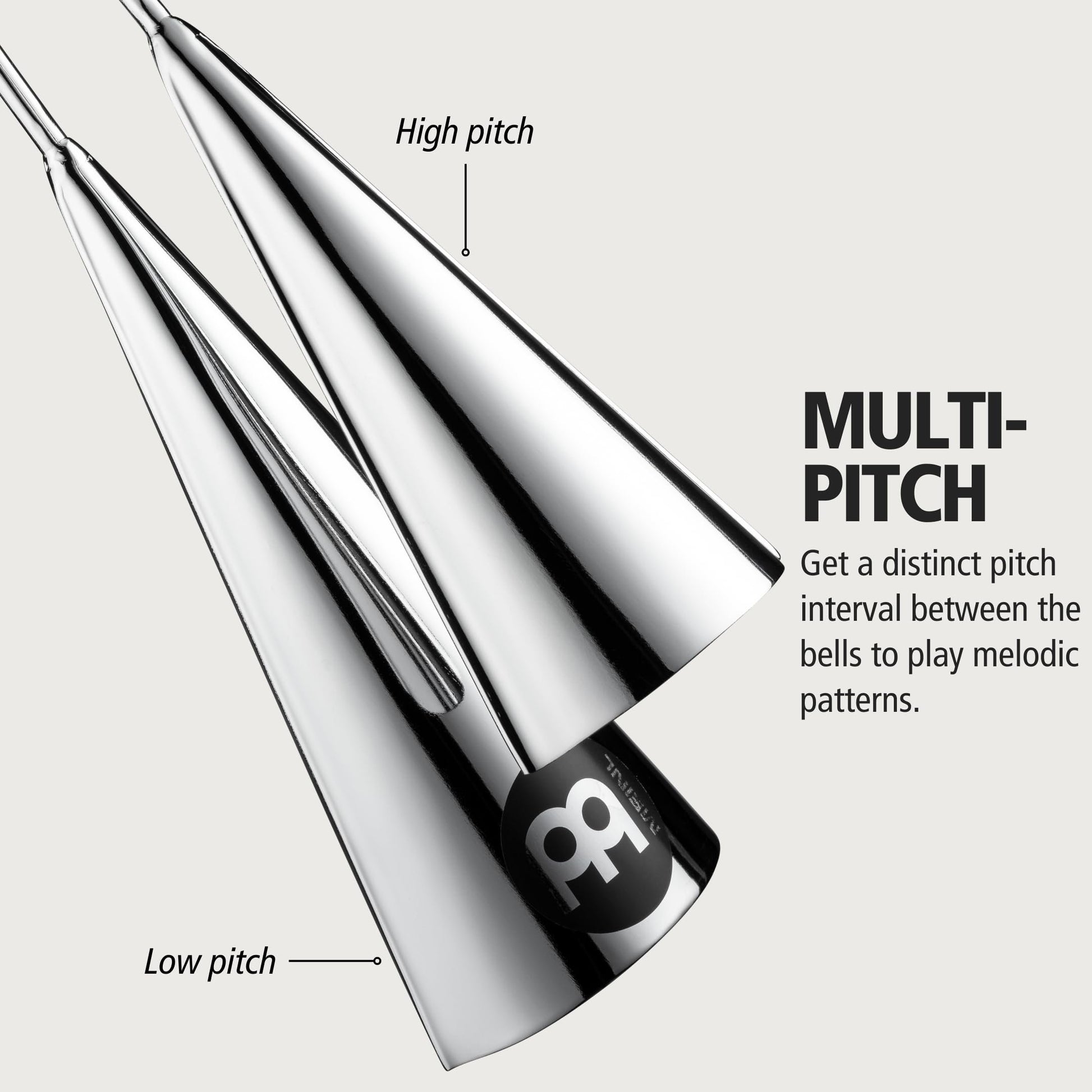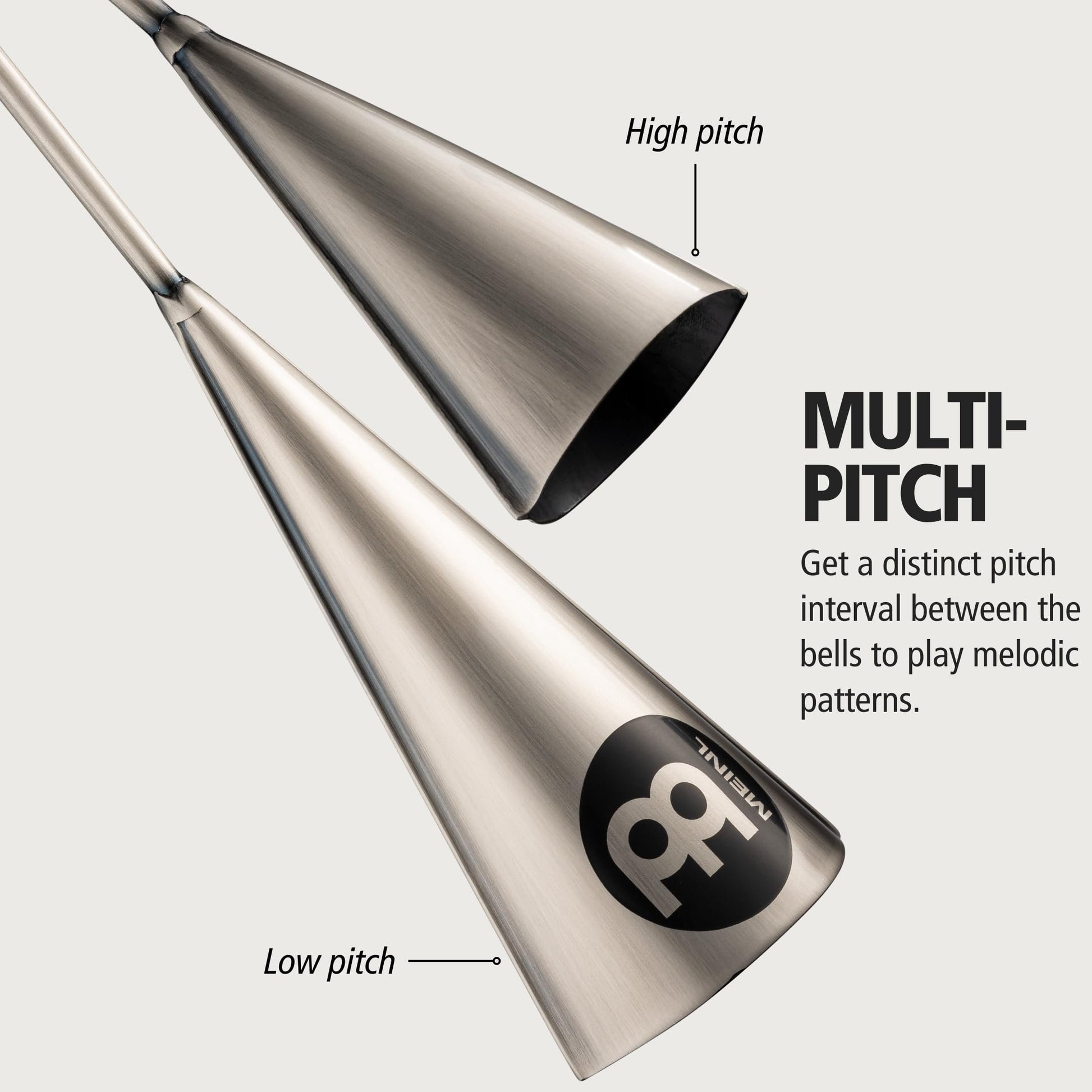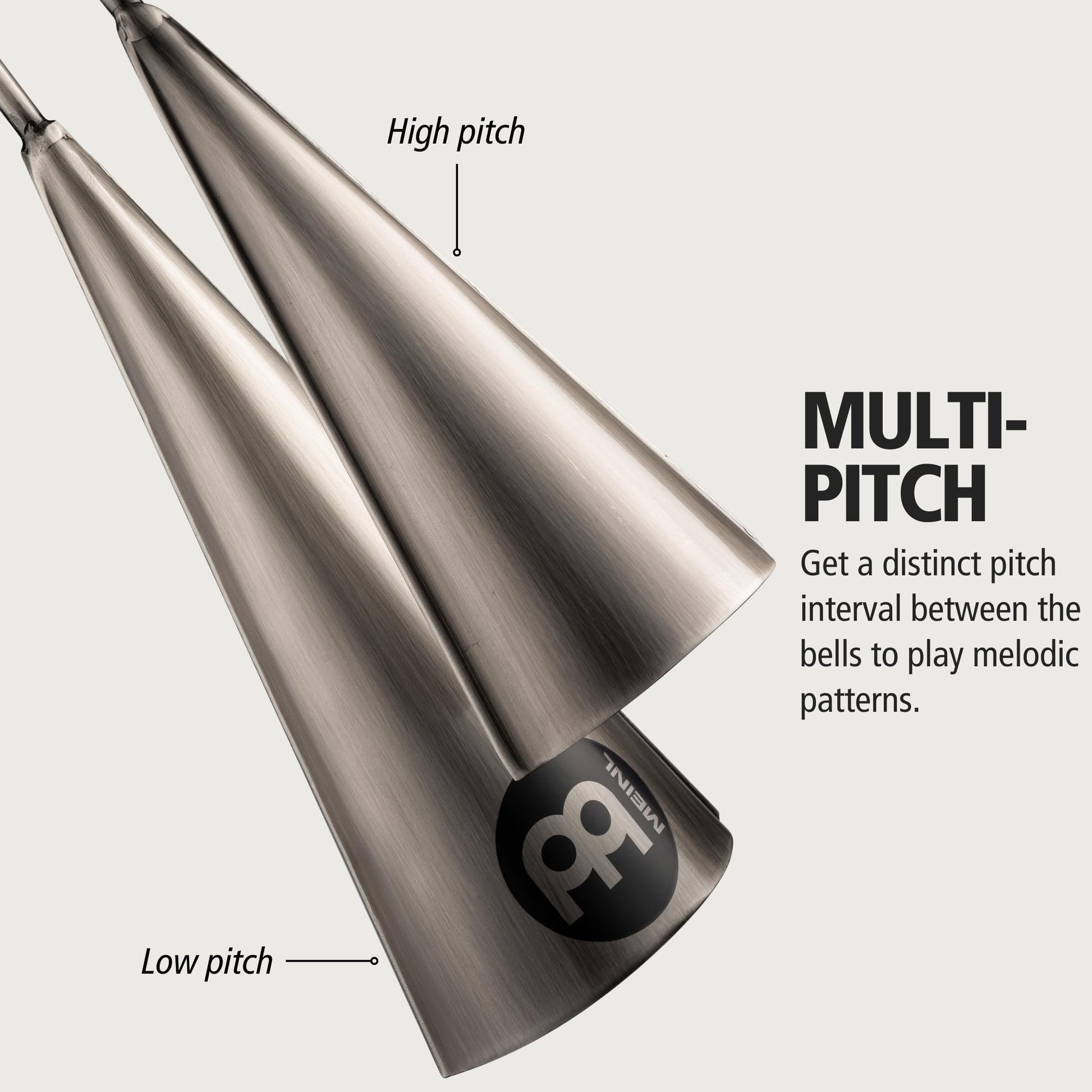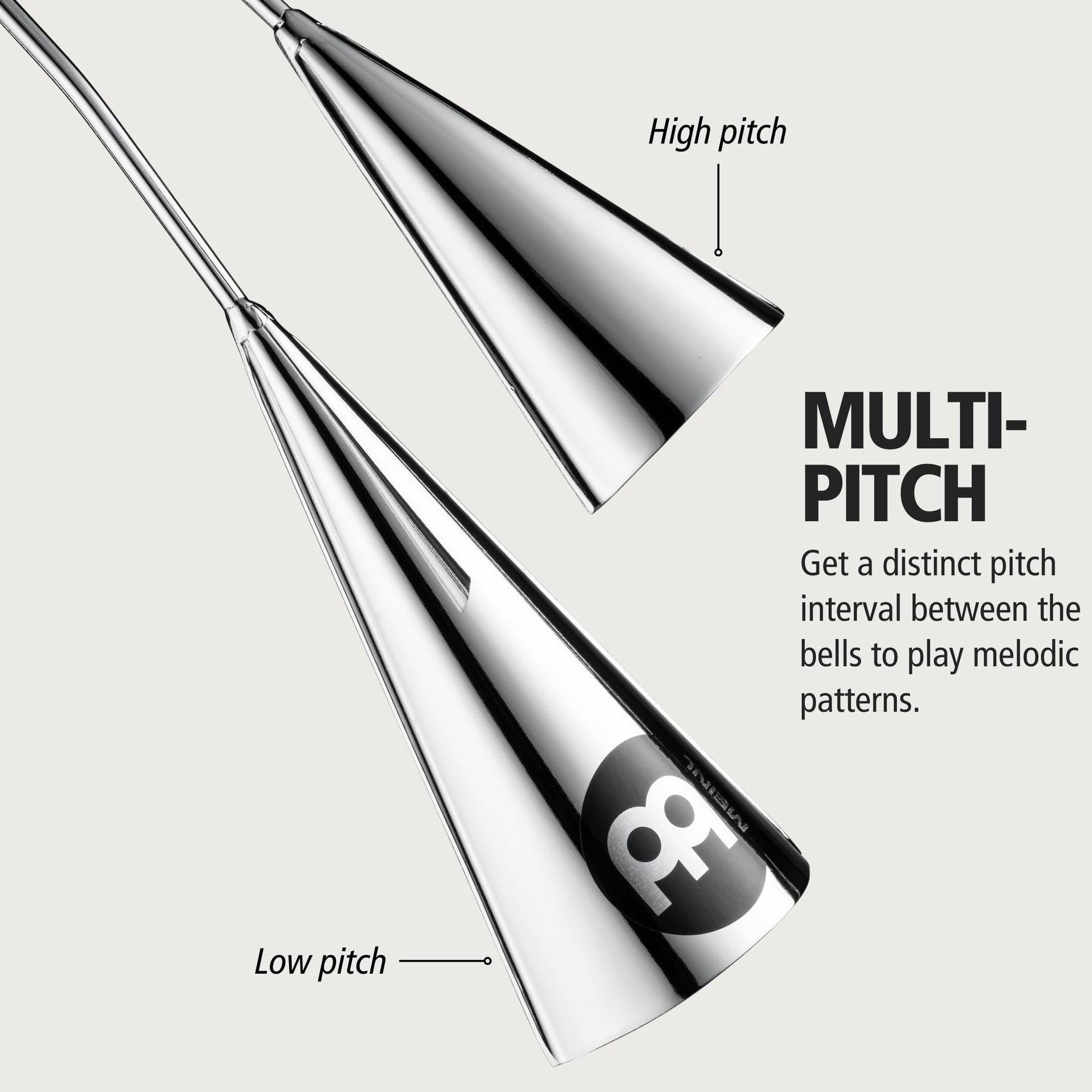 Meinl Percussion Agogo Bell Traditional Instrument for Samba and Latin Music — NOT Made in China — Handheld, 2-Year Warranty (STBAG2)STRONG AUTHENTIC TONE: the Meinl Agogo cuts through with bright melodic pitches and an open sound; these bells chime in with a brilliant tone that sits above most other percussion instrumentsWHY IT MATTERS: it’s a sure bet you'll be heard playing in large ensembles—like Brazilian Samba music; layer your melodic patterns over the music to lift the rhythmONE BIG THING: the flexible handheld stem lets you squeeze the bells together to add clacking sound effects to your rhythms; this means you play accented notes between your sticking patternOF NOTE: the bells have a distinct pitch interval between them to play melodic rhythms; small bell has a high pitch, large bell has a low pitchDRIVING THE SOUND: made with a hand brushed steel alloy that delivers a clear, bright attack note and medium sustainBY THE NUMBERS: measures 14" L overall (including stem); 7 3/4" low pitch bell and 6" high pitch bellTHE BOTTOM LINE: this is a highly durable set of agogo bells that give you a classic sound for traditional Samba and Brazilian dance music; built for indoor and outdoor performances