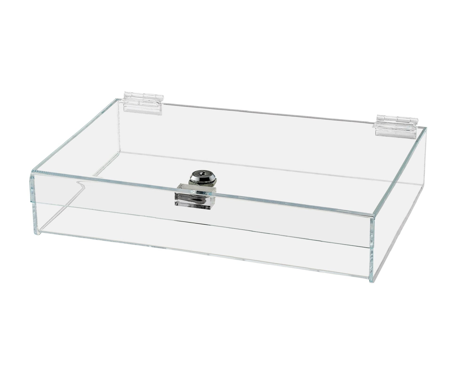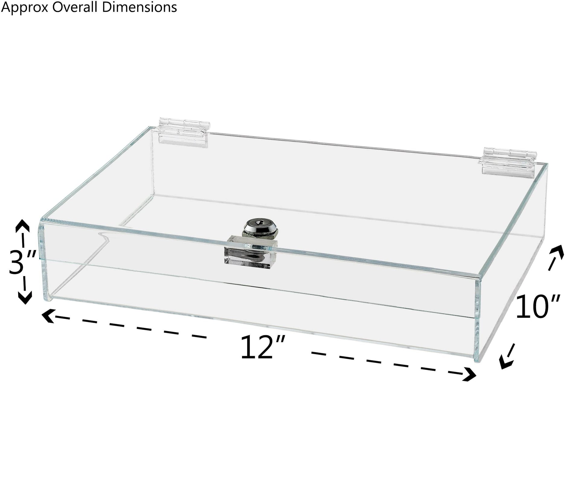 Acrylic Locking Display Case with Keys 12"W x 10"D x 3"H Clear Countertop Tray with Lid Product Features: Clear Acrylic Countertop Display Case with Lock and 2 Keys Overall Dimensions: 12.25"W x 10.75"D x 3.75"H. Inner Dimensions: 12"W x 10"D x 3"H. Thickness: 0.118", 3MM, 1/8". *All sizes are approximate Proudly made with premium high quality acrylic This sturdy and professional display case will complement any retail store, flea market booth, exhibit, trade show and expo. These lightweight showcases take up a small amount of counter space while providing security for your retail merchandise. Let your customers get a crystal clear view of your products while maintaining a secure environment. Our display cases have a clear plastic acrylic top which allows a collector or enthusiast to highlight their favorite pieces, rather than keeping them packed away in a box or other packaging. These plexiglass display cases have a locking top hinged lid that provides a safe place to both store and showcase a variety of items! They come with 2 keys for easy access to your prized collectibles. These sleek, durable lucite cases are the perfect choice for home collectors and aficionados. They are an excellent choice to showcase watches and jewelry, coins and currency, arrowheads and artifacts and other types of memorabilia. *All sizes are approximate *Tolerances: Thickness +/- 10%Clear Acrylic Countertop Display Case with Lock and 2 Keys.Overall Dimensions: 12.25"W x 10.75"D x 3.75"H. Inner Dimensions: 12"W x 10"D x 3"H. Thickness: 0.118", 3MM, 1/8". *All sizes are approximateThis sturdy and professional display case will complement any retail store, flea market booth, exhibit, trade show and expo. These lightweight showcases take up a small amount of counter space while providing security for your retail merchandise. Let your customers get a crystal clear view of your products while maintaining a secure environment.Our display cases have a clear plastic acrylic top which allows a collector or enthusiast to highlight their favorite pieces, rather than keeping them packed away in a box or other packaging. These plexiglass display cases have a locking top hinged lid that provides a safe place to both store and showcase a variety of items! They come with 2 keys for easy access to your prized collectibles.These sleek, durable lucite cases are the perfect choice for home collectors and aficionados. They are an excellent choice to showcase watches and jewelry, coins and currency, arrowheads and artifacts and other types of memorabilia. *All sizes are approximate *Tolerances: Thickness +/- 10%