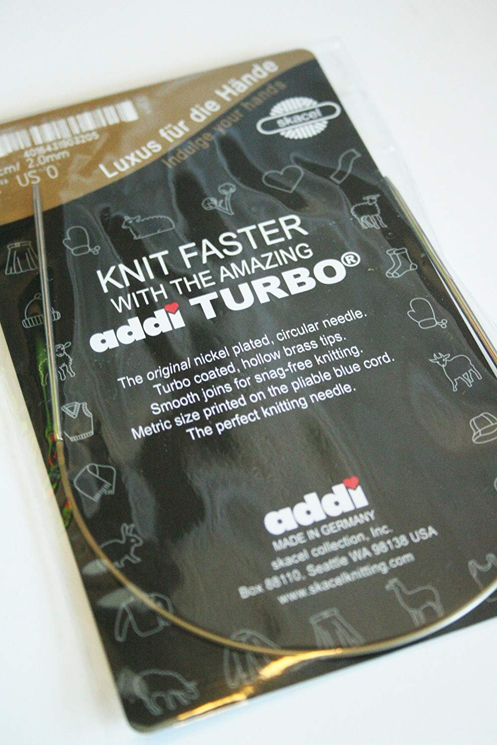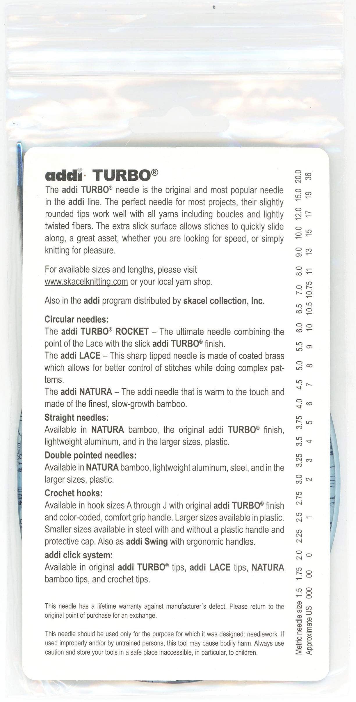 Addi Turbo, the circular needle that started it all, and the true choice of professional knitters worldwide! The fast needle with the natural touch. Very soft cord with smooth transfer. Won't snag. Quiet and very fast.The Needle for FAST KnittingSmooth Joins Prevent SnaggingTips Won't RustPliable Cords Stamped with Metric SizesWARRANTY: Item is covered by GUSTAV SELTER GmbH & Co. KG 2 year warranty from any defect, deficiency or imperfection