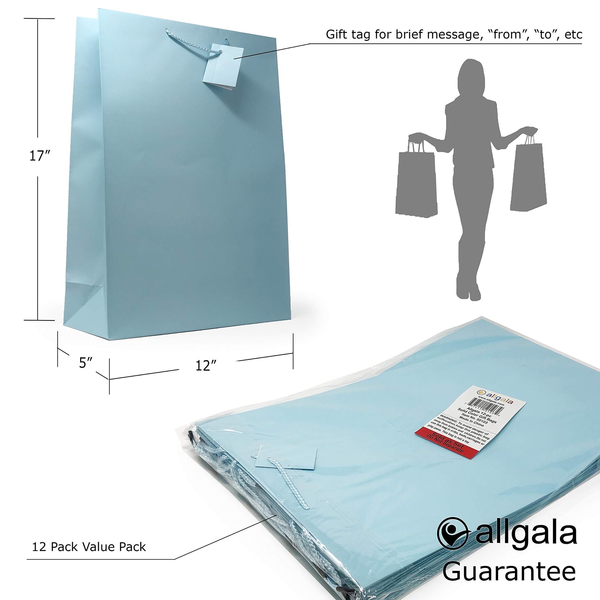 Allgala solid color gift bags are high-quality gift bags that come in a wide variety of vibrant and solid colors. These gift bags are made from sturdy and durable paper, laminated with matte film, making them perfect for holding gifts of different shapes and sizes. The gift bags feature a matte finish that gives them an elegant and unsophisticated look, making them perfect for any occasion, including birthdays, weddings, holidays, and other special events. Allgala solid color gift bags come in different sizes, ranging from medium to x-large, from bottle to horizontal wide, making it easy to find the perfect size for your gift. The bags also feature sturdy handles, making them easy to carry around. A simple gift tag is also attached to the handle for brief messages and names. In summary, Allgala solid color gift bags are high-quality, elegant, and durable gift bags that come in a range of beautiful colors and sizes. They are perfect for wrapping gifts and making them look special for any occasion.Premium Quality Material: Crafted from high-quality, durable 157 GSM art paper with a matte finish, ensuring your gift looks elegant and sophisticatedCustom Gift Tag Attached: Personalize these matte finish gift bags with handwritten notes or messages on the attached custom tag17" XL: 17" H x 12" W x 5" Gusset; 5 Inch gusset is wider than 4 inch of other competitors gift bags to accommodate thicker giftsLight Blue color: Choose from wide selection of colors to match your desired themePerfect for All Occasions: Ideal for personal, professional, and retail use, making gift-giving a breeze for any occasion, such as birthdays, baby showers, weddings, holidays, graduations and other special events