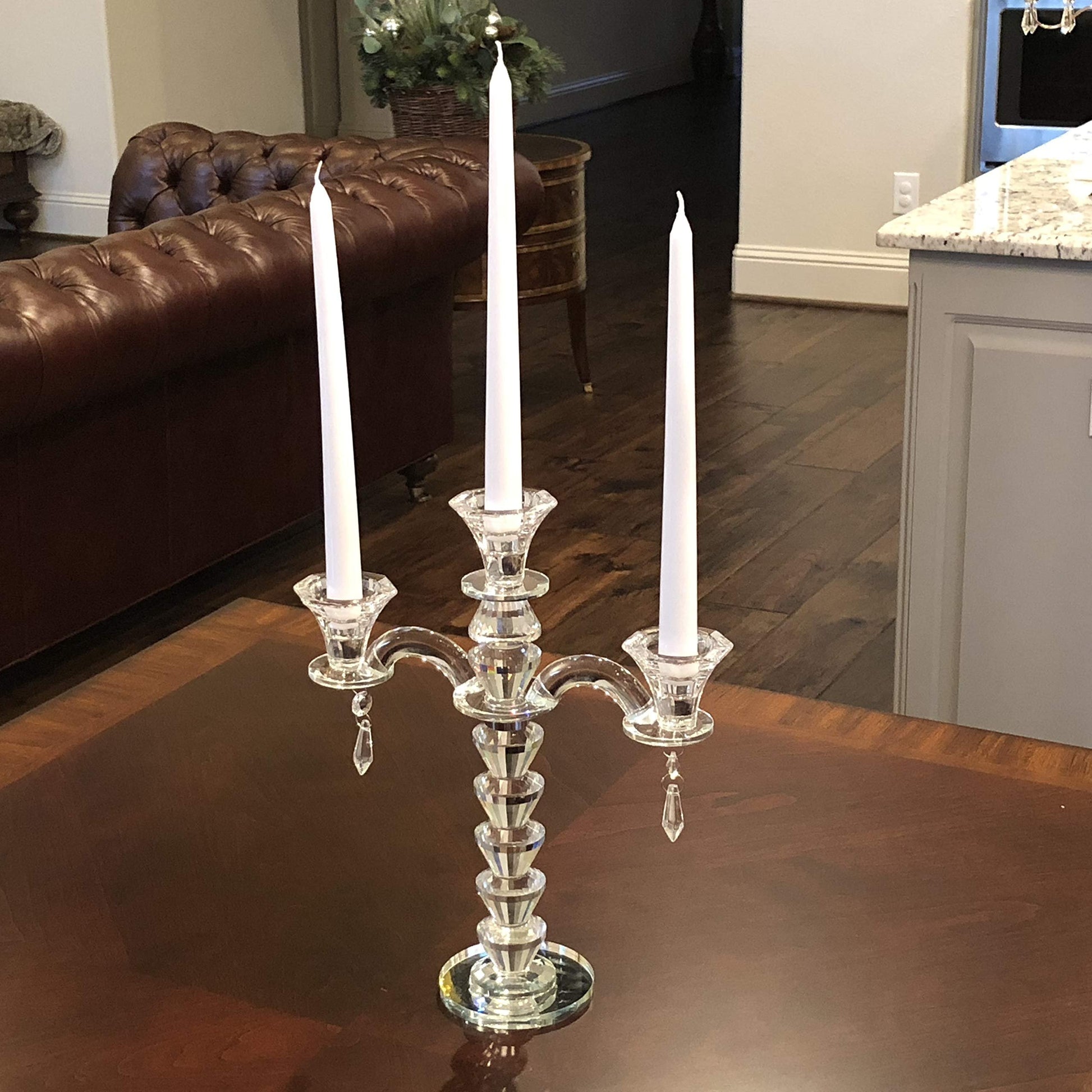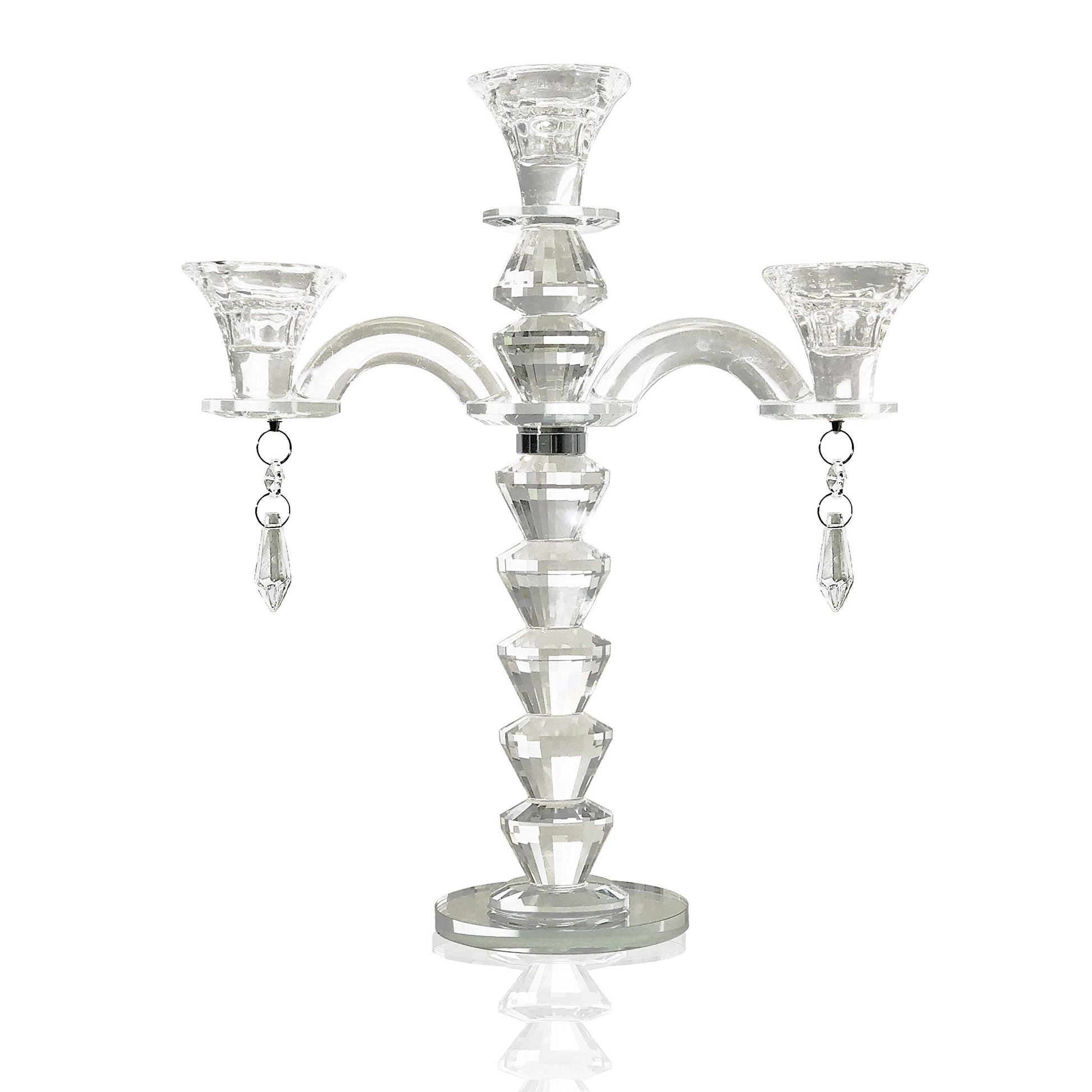 Elegant crystal sparkling candelabra makes a perfect centerpiece in home or for wedding etc events. Comes in 2 part body, simple twist on assembly. Hang on chrystal glass drops, viola, a gorgeous candlebra is ready to sparkle. Dimension: 10.5 Height, 12 length, Base diameter 3.5" Each comes in a white box with well insulated slotted foam packing Holds 3 taper candles (NOT included)Elegant crystal sparkling candelabra makes a perfect centerpiece in home or for wedding etc events.Comes in 2 part body, simple twist on assembly. Hang on chrystal glass drops, viola, a gorgeous candlebra is ready to sparkle.Dimension: 10.5 Height, 12 length, Base diameter 3.5"Each comes in a white box with well insulated slotted foam packingHolds 3 taper candles (NOT included)