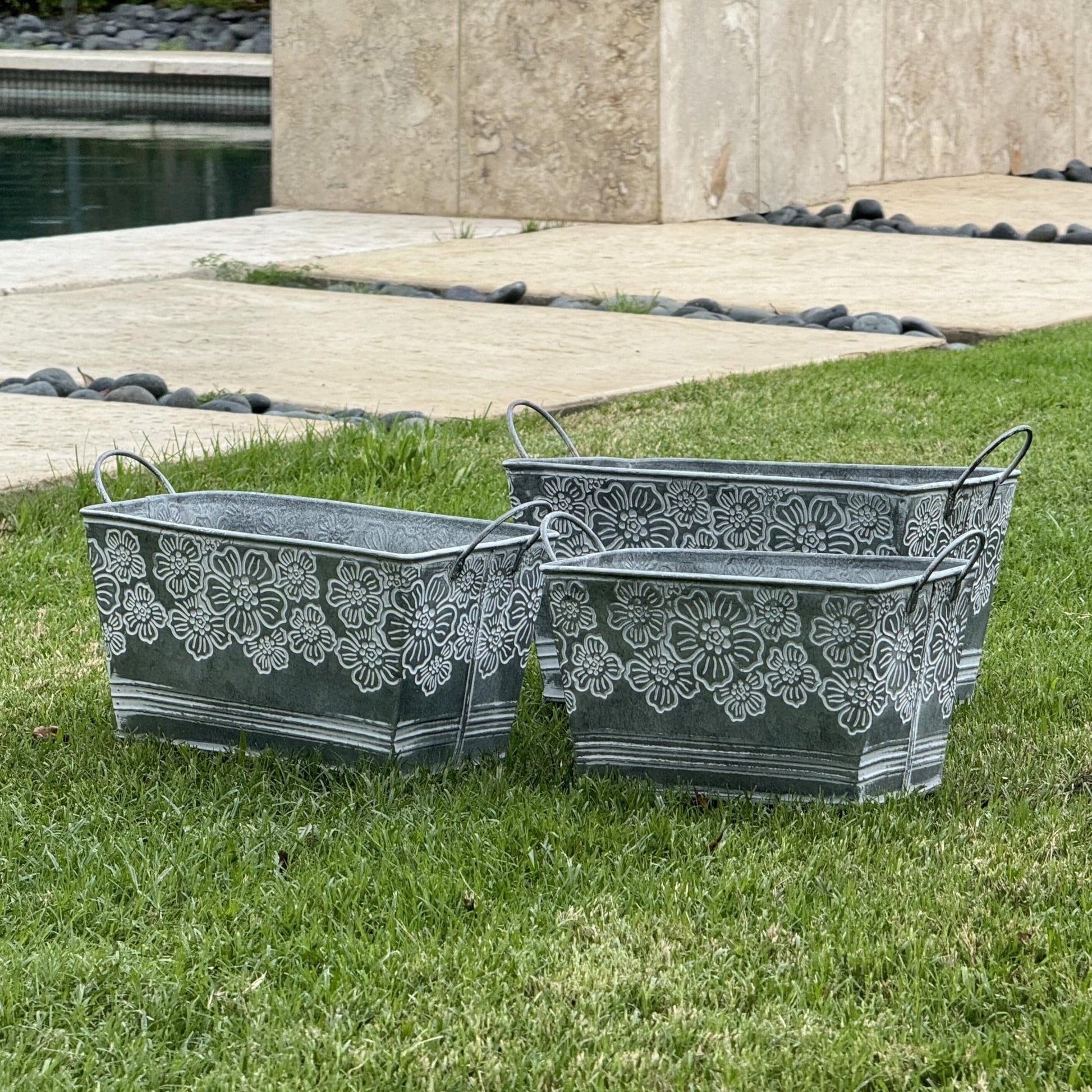 The Allgala Galvanized Metal Planter adds a touch of rustic charm to garden décor. Its embossed flower prints and galvanized iron construction evoke a farmhouse-inspired aesthetic, making it a stylish accent for gardens, patios, or outdoor entertaining spaces.