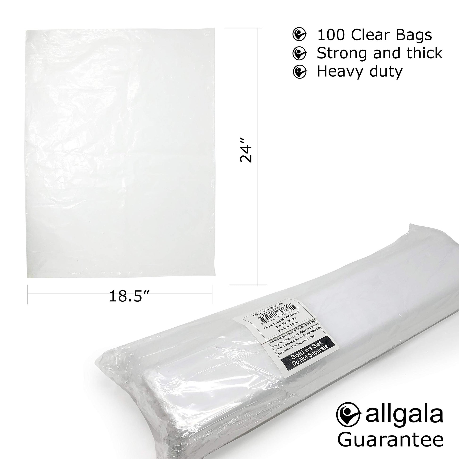 The Allgala Heavy Duty PE Thick 3 mil Open-End Plastic Packaging Bags, offered in a package of 100, are crafted for strength and durability, boasting a robust 3 mil thickness (equivalent to approximately 70 microns). With a spacious 18 x 24-inch size, they provide ample room for accommodating large and heavy objects. Their large opening facilitates easy insertion and removal of items. Despite their sturdy construction, they remain transparent, offering clear visibility of the contents within. These bags are particularly suited for packaging and storing tough products, kitchen items, resale goods, and seafood. However, they are not intended for direct mailing. They can, however, serve as inner bags for added protection within poly mailers. Additionally, it's noteworthy that the package of 100 bags weighs more than 7.5 pounds, underlining their substantial build and quantity.Very thick (3mil) and strong, big openning to accommodate large and heavy object. 100 bags weighs more than 7 and half pound.Size: 18 x 24 inch - Durable 1 mil thicknessPackage of 100Clear see thru. Great for packaging and storing tough and heavy product, kitchen item, resale item, seafood, fish, repackaging.With their robust construction and ample size, they offer reliable protection and containment, making them an ideal choice for various storage needs around the kitchen or home.