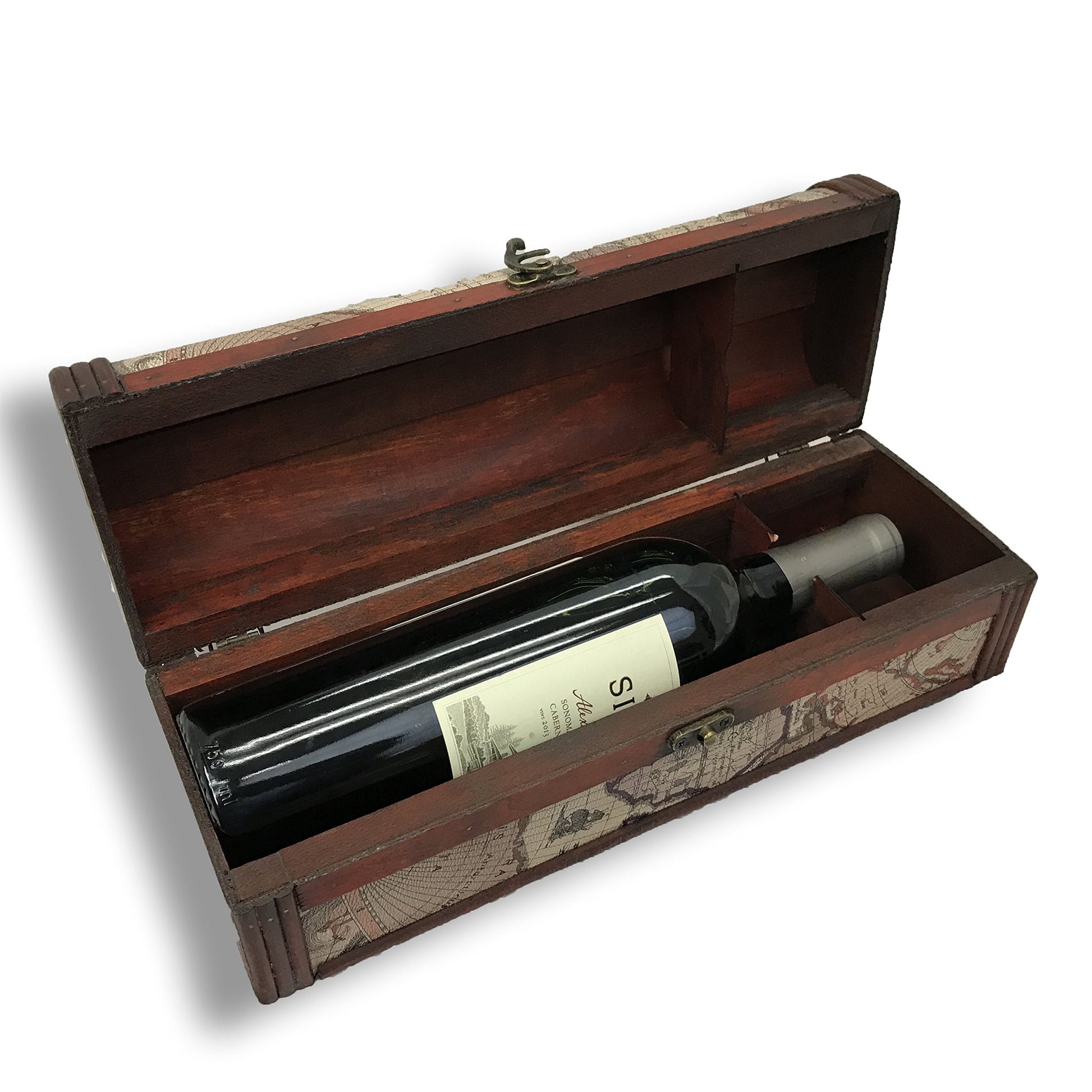 allgala Wooden Wine Bottle Box with Antique FinishVintage look of wood and leather, real wood, artificial leather, measures approx 13" x 5" x 4.5"Great for gift packing of your favorite wine, or décor compliment to your wine colectionRack support to secure the wine bottle (In order to secure snugly, the neck support opening might be too small for some bottles, you can push the bottle or cut the open wider with scissors)Antique wood, leather like handle, locking buckle, decorative metal flower nails, vintage in crafted detailPlease note defects might present due to the vintage look imitation, and natural wood veneer. Of course, wine NOT IncludedWine Lover's Gift: This makes a perfect gift for housewarming parties, weddings, birthdays, Father's Day, Mother's day or to any wine enthusiast.