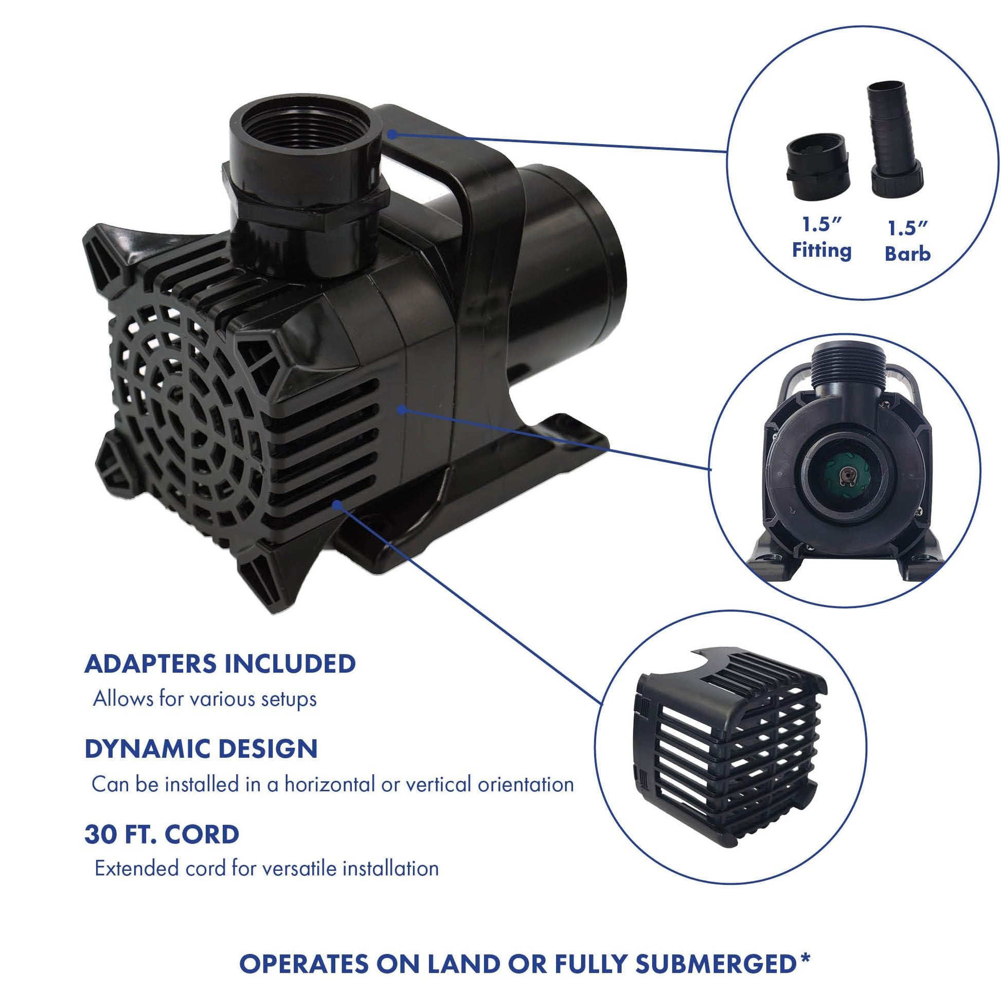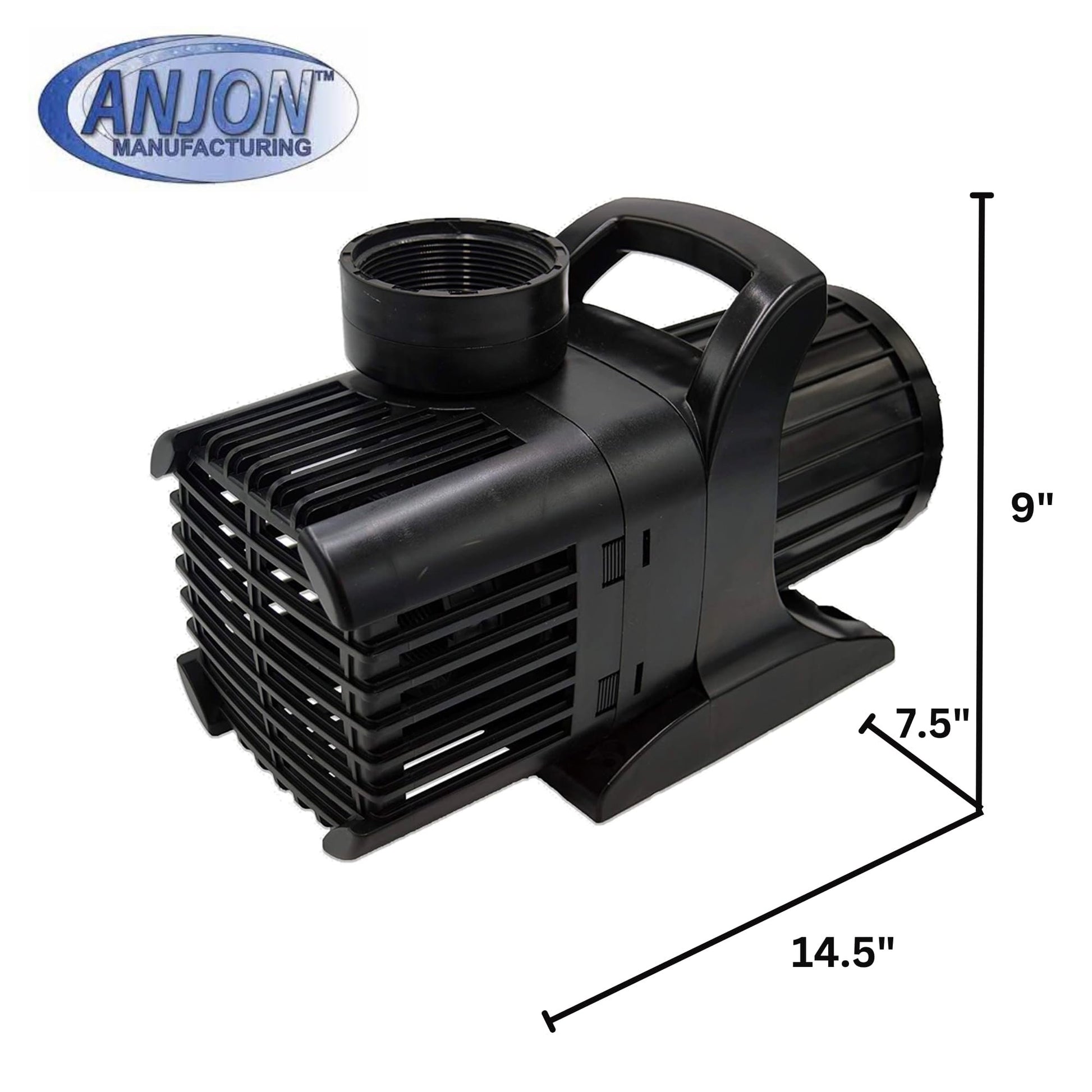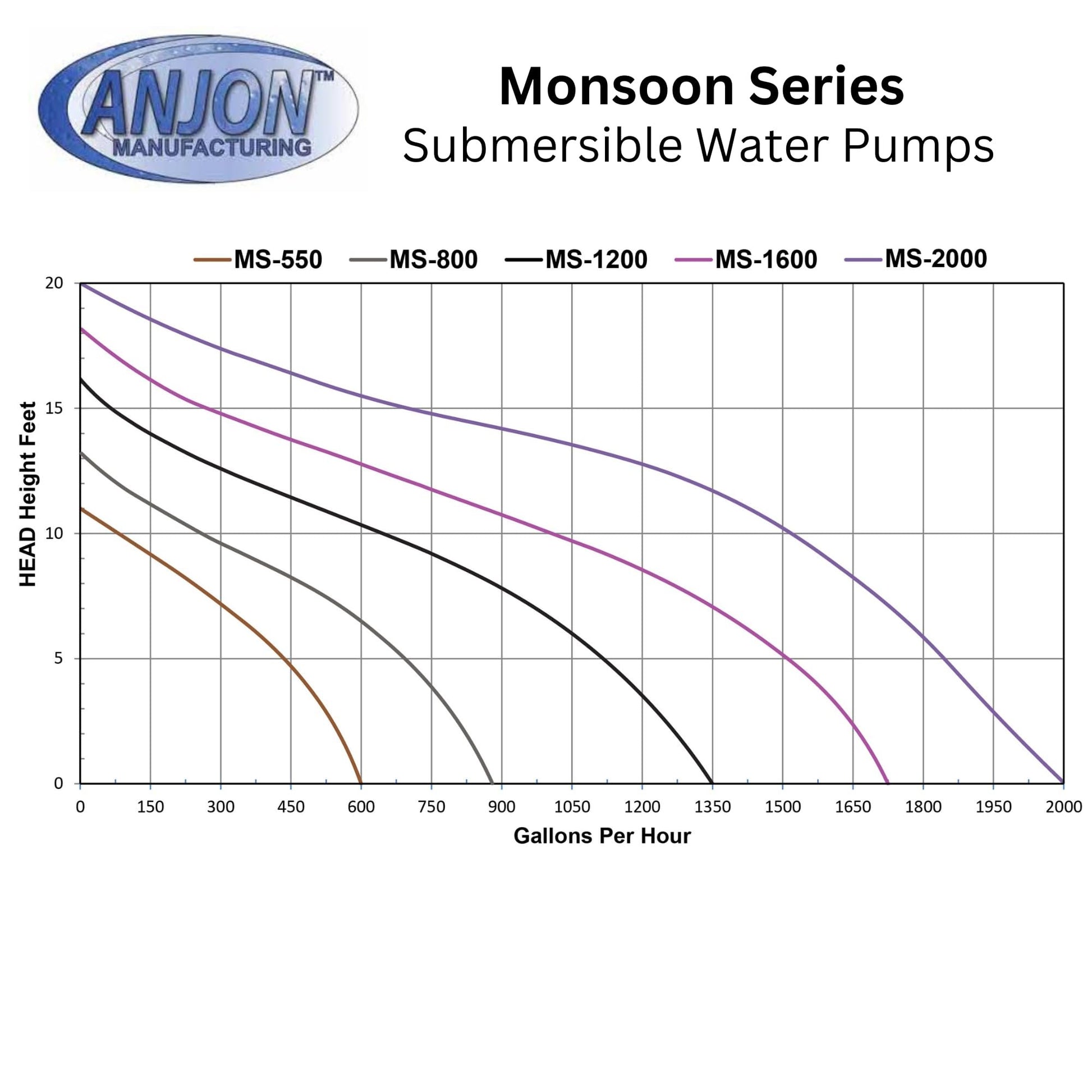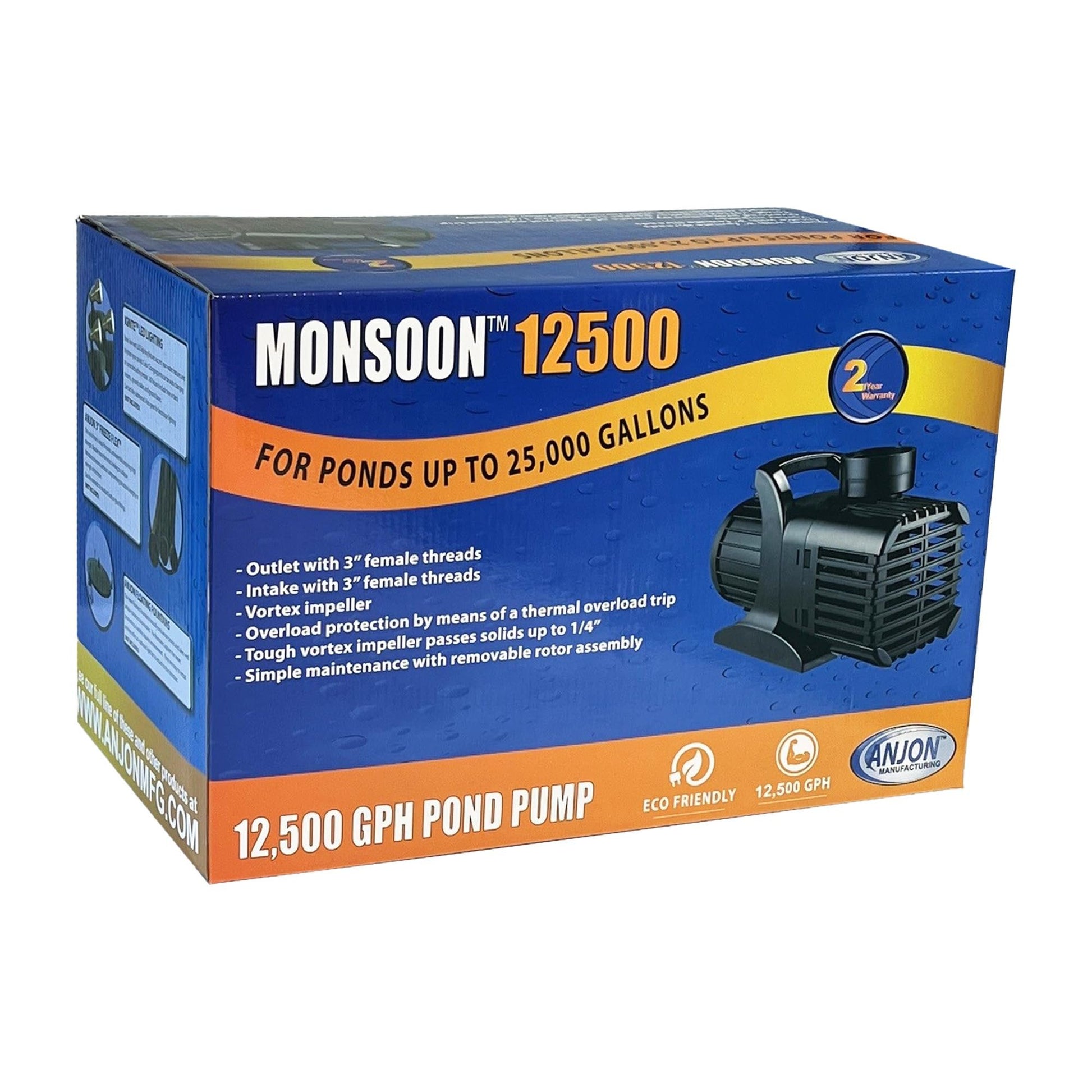 Anjon Monsoon Pumps The unique design of the Anjon Monsoon Asynchronous series makes it an ideal choice for fountains, waterfalls and smaller ponds. An energy efficient electromagnet is sealed in an epoxy-filled housing. The drive shaft and electromagnetic rotor are recessed in the motor housing. Near silent operation and extremely low operating cost. The high flow, energy efficient hybrid drive technology combines the high flow characteristics of a direct drive pump with the energy saving efficiency of a mag drive pump. Intake screen prevents clogging while passing solids up to .25 inch. Asynchronous drive motor can be controlled with variable speed controller (not included) that permits you to increase or decrease pump flow as needed. Impeller passes solids to .25”. Engineered for 24-hour continuous use; overload sensor prevents burnout. Contains no oil; completely safe for fish, wildlife and aquatic plants. 2-year manufacturer’s warranty. The speed controller does NOT work with the MS8000, MS10000, MS12500, MS3000100, MS5200100, MS6100100, MS80001000, MS10000100, MS8000200, MS12500200, MS15000200High flow, energy efficient hybrid drive technology combines the high flow characteristics of a direct drive pump with the energy saving efficiency of a mag drive pumpAsynchronous drive motor can be controlled with variable speed controller (not included) that permits you to increase or decrease pump flow as needed (see description for compatibility)Can be submersed or used externally (required proper install) | Ceramic shaft impeller passes solids to 0.25” | Engineered for 24-hour continuous use with overload sensor to prevent burnoutsSpecs: 8000 GPH | 26' Max Head | 2" Output | 200' Cord | 540 Watts | 4.5 Amps | 120 VoltsOil-free and fish safe |High-quality sales for long and efficient shelf life | 2-year manufacturer’s warranty