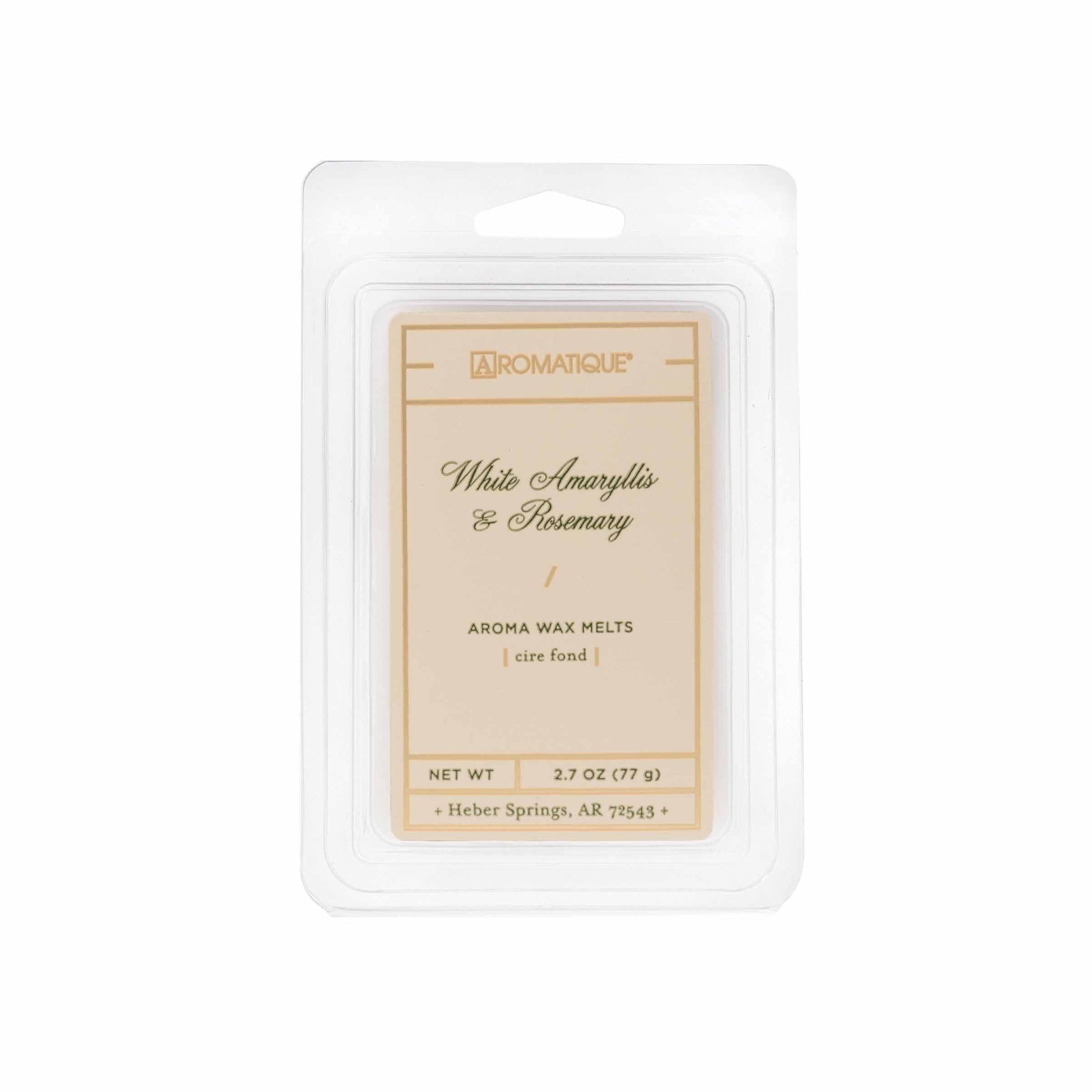 White Amaryllis & Rosemary - fragrant herbs and ginger topped with white florals, all embraced by notes of earthy oakmoss. Enjoy fresh notes of lemon, rosemary, and ginger, paired with the gentle florals of white amaryllis and jasmine, and grounded in oak moss and cardamom. A set of 8 cubes that contain highly refined paraffin wax and a highly fragrant aroma - no wicks or flames needed. To use, simply break off a portion of the wax melt and place in your favorite warming device for a room-filling aroma. Pair with other products from Aromatique's White Amaryllis & Rosemary collection for an immersive experience. GMO-free, Gluten-free, Paraben-free, Cruelty-free, and Vegan. Handcrafted in Heber Springs, Arkansas, USA.White Amaryllis & Rosemary - fragrant herbs and ginger topped with white florals, all embraced by notes of earthy oakmossEnjoy fresh notes of lemon, rosemary and ginger, paired with the gentle florals of white amaryllis and jasmine, and grounded in oak moss and cardamomA set of 8 cubes that contain highly refined paraffin wax and a highly fragrant aroma - no wicks or flames neededTo use, simply break off a portion of the wax melt and place in your favorite warming device for a room-filling aromaGMO-free, Gluten-free, Paraben-free, Cruelty-free, and VeganHandcrafted in Heber Springs, Arkansas, USA