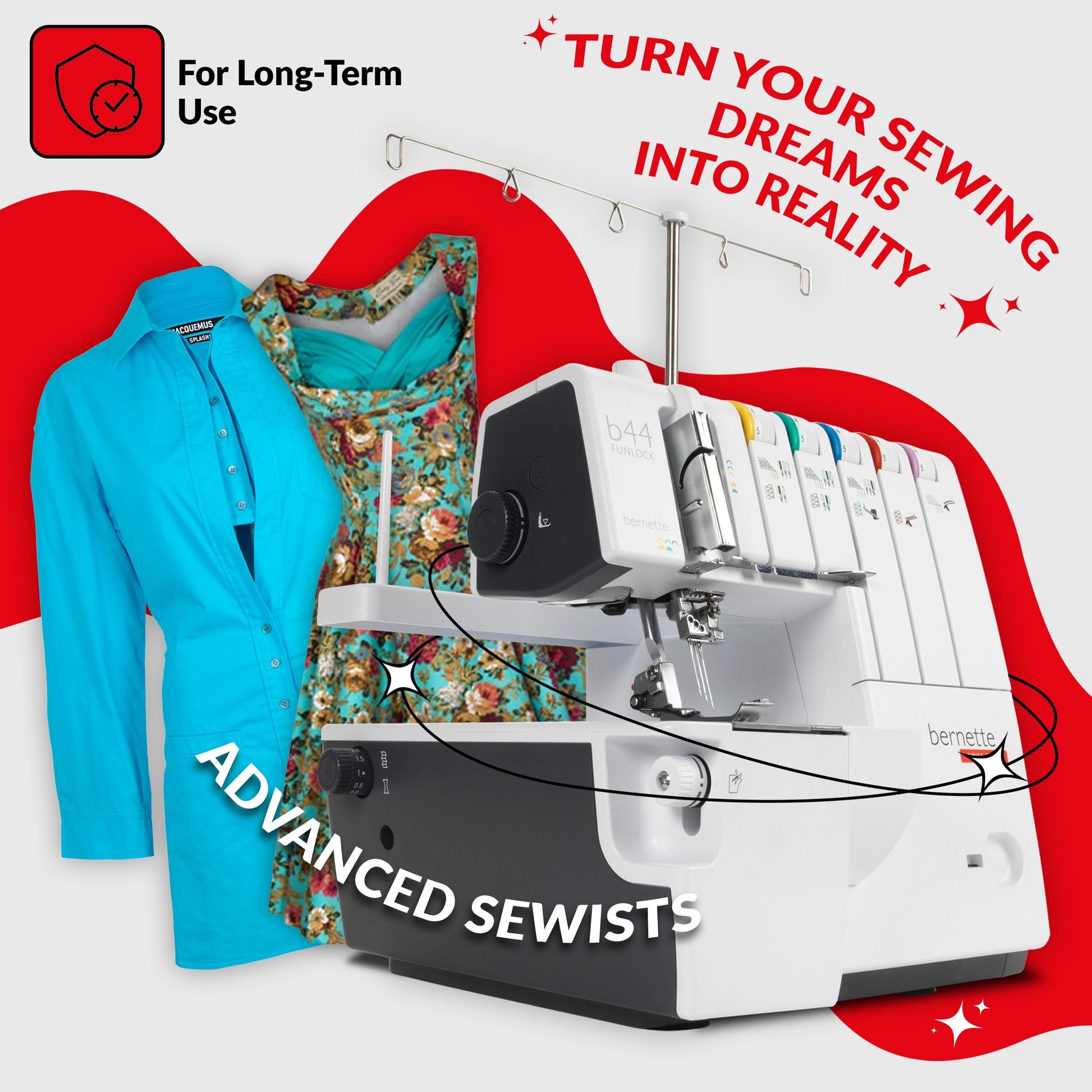 COMPLETE ACCESSORY BUNDLE: This Bernette B44 Overlock Machine Kit includes a comprehensive sewing accessory pack: bobbins, threader, spools, hoop, needles, presser feet, extension table, and a protective cover. With a portable, lightweight design, it’s perfect for both home and professional use. Whether you're crafting, repairing, or designing, this machine delivers efficiency, precision, and reliability.