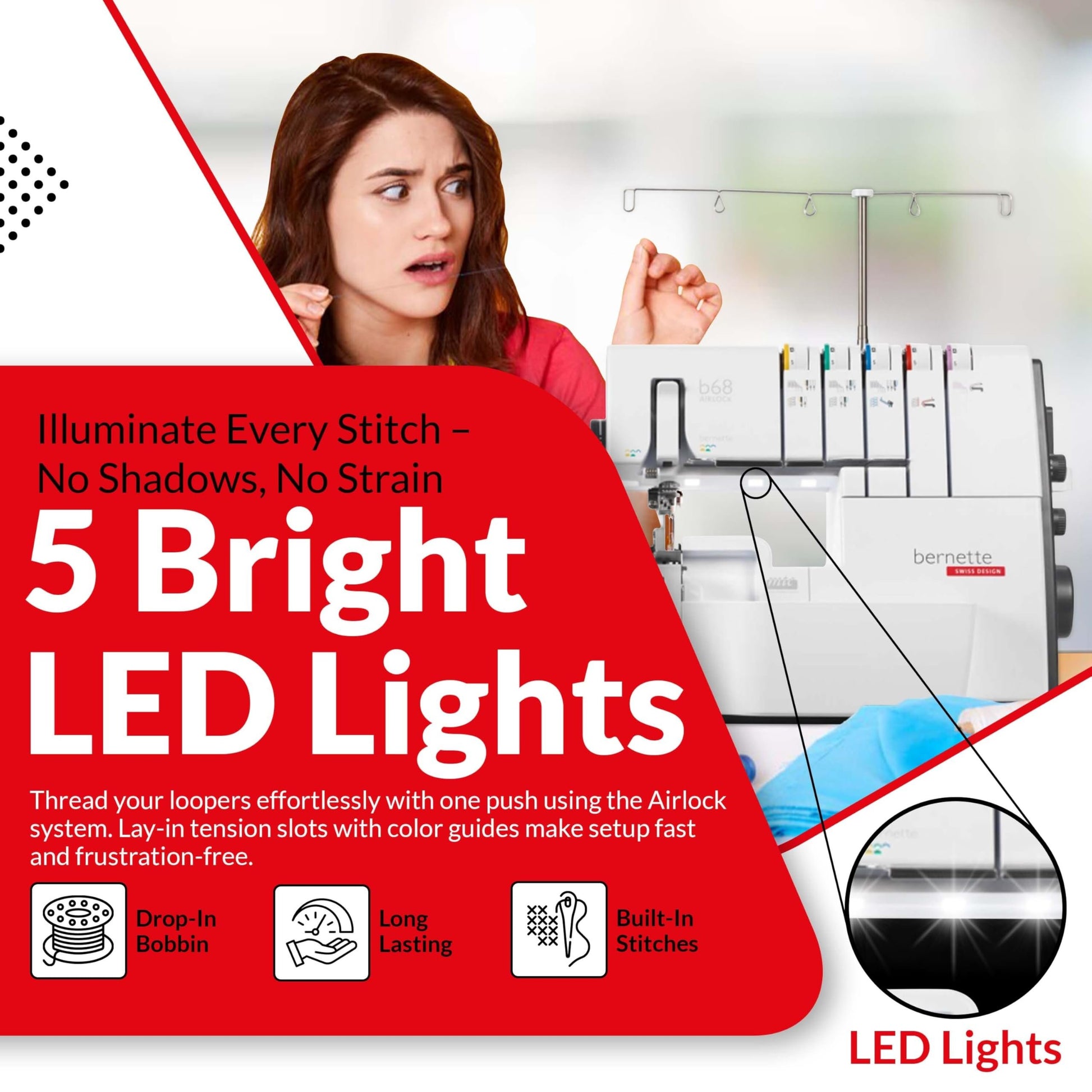 ENHANCED VISIBILITY & WORKSPACE: Equipped with five bright LED lights, the B68 Airlock offers excellent visibility across the work area, reducing eye strain and increasing accuracy. Its spacious slide-on table gives you plenty of room to handle larger projects. From quilting and embroidery to home décor, the illuminated and extended workspace supports all levels of creativity.