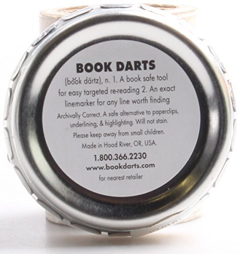 BOOK DARTS ARE PRECISION CUT, paper-thin metal line markers that attach easily to any page and won't leave a lasting mark. Use again and again for a lifetime. Eliminate: Bent corners, Paper clips, Underlining, Highlighting, "Sticky Papers" (and sticky pages). An elegant alternative to highlighting, underlining, and folding page corners, these metal line markers are just the thing for students who need to keep their books in good condition for re-use or resale. One tester found Book Darts especially useful for tagging recipes in her cookbooks. MADE IN THE USA and packaged in a gift-ready tins/sleeves, Book Darts let bookworms both mark and preserve the beauty of the written word. Book Darts allow students and booklovers to mark their pages and notable passages without leaving a lasting mark. With Book Darts, you can quickly and easily note and relocate meaningful lines of text for future reference and discussion on books both borrowed and owned. Unlike paper clips that leave a dent and sticky notes that can be an eyesore, Book Darts are safe, easy to use, and aesthetically pleasing.THE LOVE OF BOOKS initially spurred the idea of Book Darts. Marking a book with a pen or high-lighter, turning down page corners or using paper clips to tag important passages only shortens a book‘s life. Book Darts were developed to enrich the reading experience by allowing readers to mark important lines and easily re-find them without harming the pages (and, thus, to encourage re-reading). Help keep your books in tip-top shape with these thin, reusable book darts. Darts are packaged in a reusable tin. THEY ARE BOOK-FRIENDLY enough for public libraries, often judged indispensable by students, educators, and other readers of what has lasting value. Answers the question: "How can we mark our exact passages, find them again, quickly and surely, and never harm the page?" Now you don't have to remember all the answers, just where to find them. Book Darts are a tool for recalling exactly wha