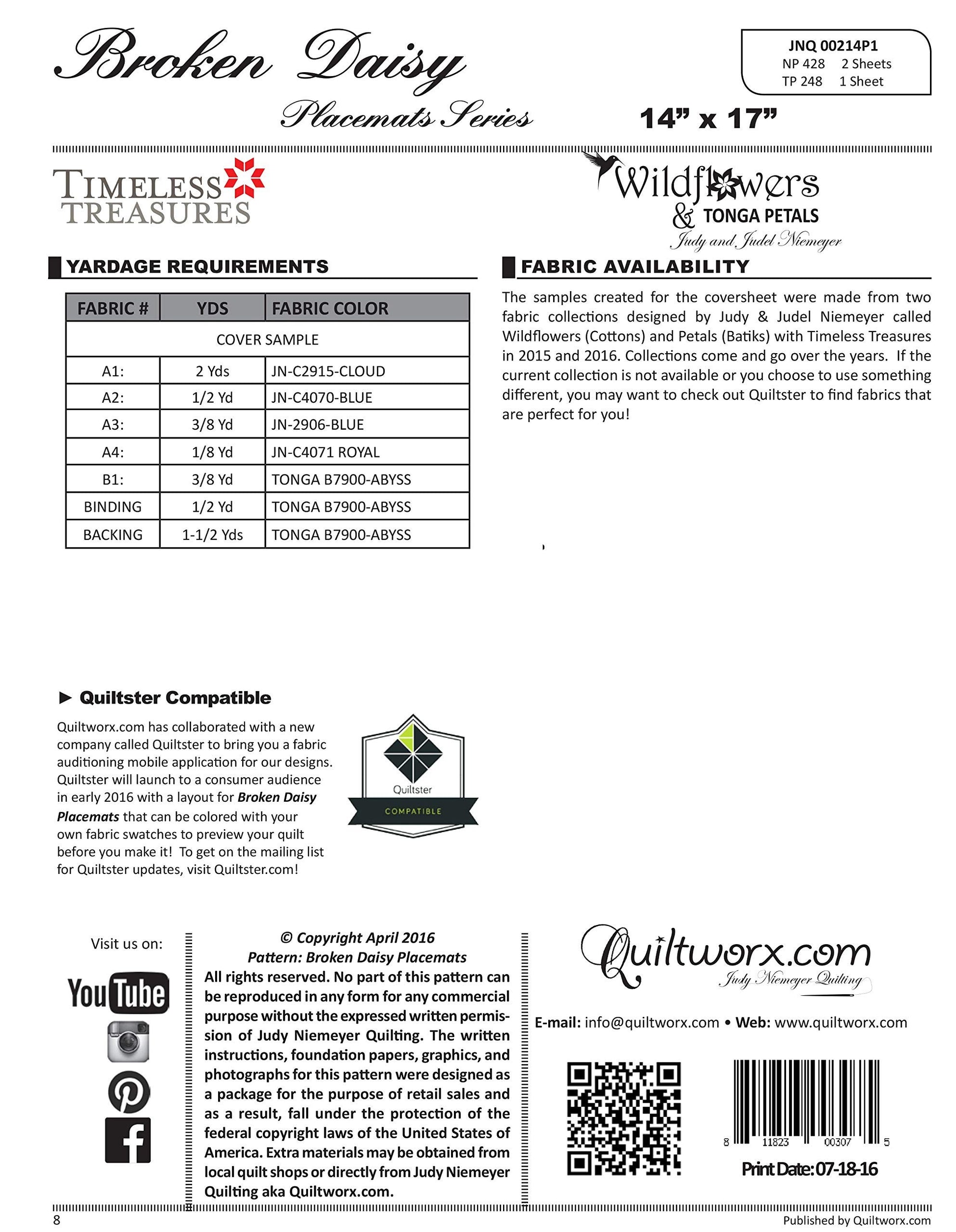 Broken Daisy is a foundation paper pieced place mat. Pattern includes enough foundation papers to make 4 place mats. Size 14in x 17in