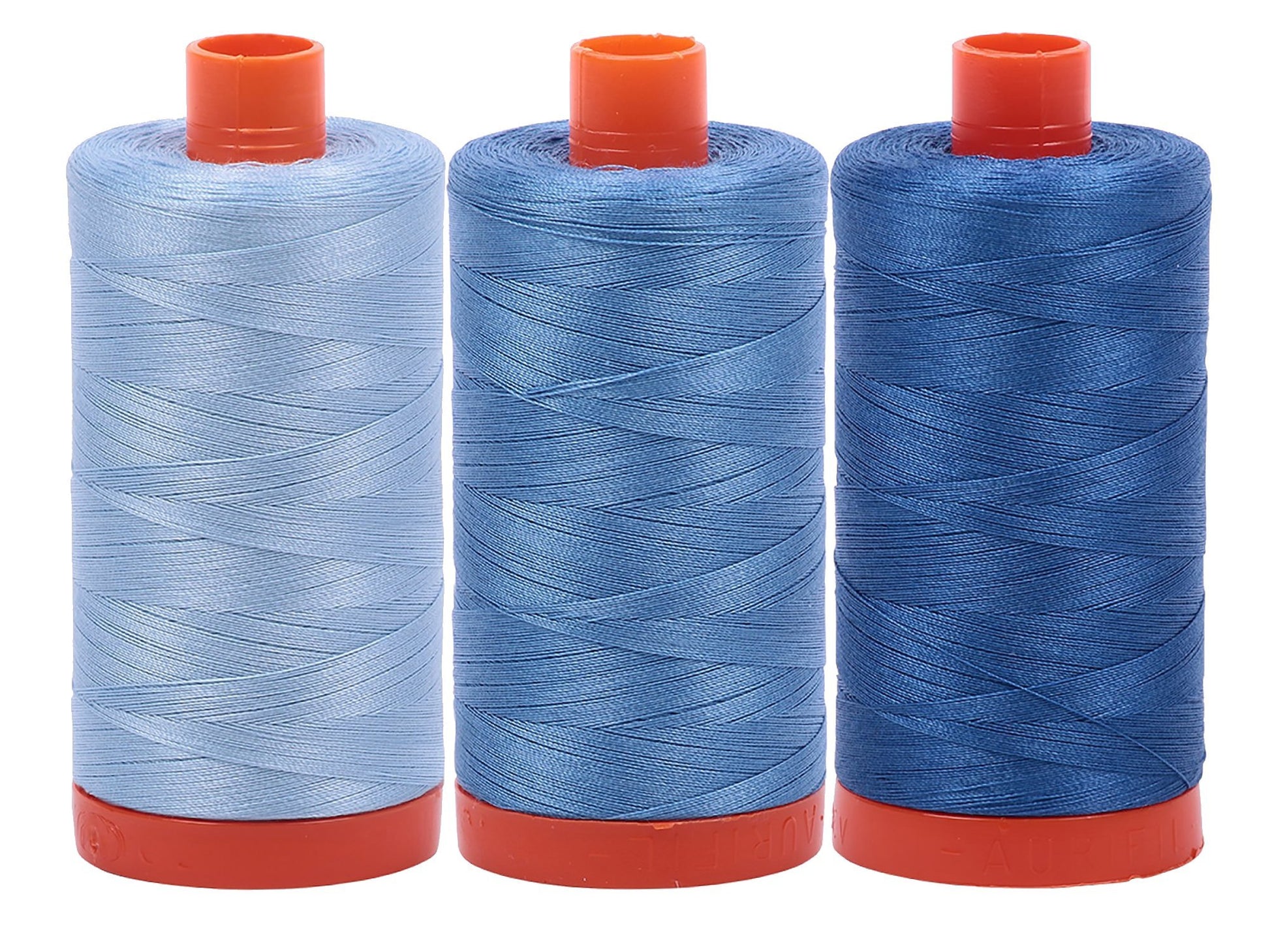 Uses: 1. Machine piecing: Gives a great result with a nice flat seam every time. 2. Hand piecing : A great weight for hand piecing. 3. Hand applique' : Ideal for all types of hand applique' . From needle turning to using prepared shapes, the 50wt is thin and you can match your shape perfectly. 4. Machine applique' : Ideal when a very fine finish is desired. This weight disappears so your fabric is the feature. Use for a straight stitch, small zig zag, Blind hemming stitch, and Blanket stitch. 5. Machine embroidery: Love it! Great results every time. Use Mako 50wt in the bobbin as well, or your regular bobbin thread – in which case tighten the top tension a little. Use a Microtex 80/12 needle. 6. Machine quilting: Use for very detailed machine quilting with a lot of back tracking such as feathers and heavy background quilting . Perfect for quilting that creates texture when you don’t necessarily want to see the quilting lines. Use the same thread in the bobbin. Use a Sharp/Microtex, quilting or even denim needles 80/12. 7. Longarm quilting: Perfect for creating texture where you don’t want the thread to be a feature. Backgrounds, stitch in the ditch, basting quilts, wholecloth quilting, micro quilting for dense background designs. Match bobbin thread.Three (3) Large 1422 Yard Spools - For Hand and Machine Piecing.Aurifil 100% Egyptian Cotton Mako Long Staple Thread - 50 wt. - Virtually Lint Free – Achieve Very Accurate Seam AllowancesColors included: Aurifil No. and color name: 2021, Natural White; 2310, Light Beige; 2605, GrayAurifil 50wt Your Best Piecing and Appliqué ThreadSpools are Brand New Sealed in Factory Shrink Wrap