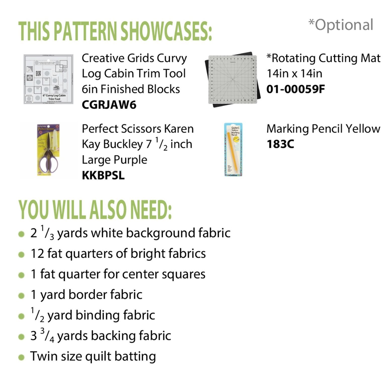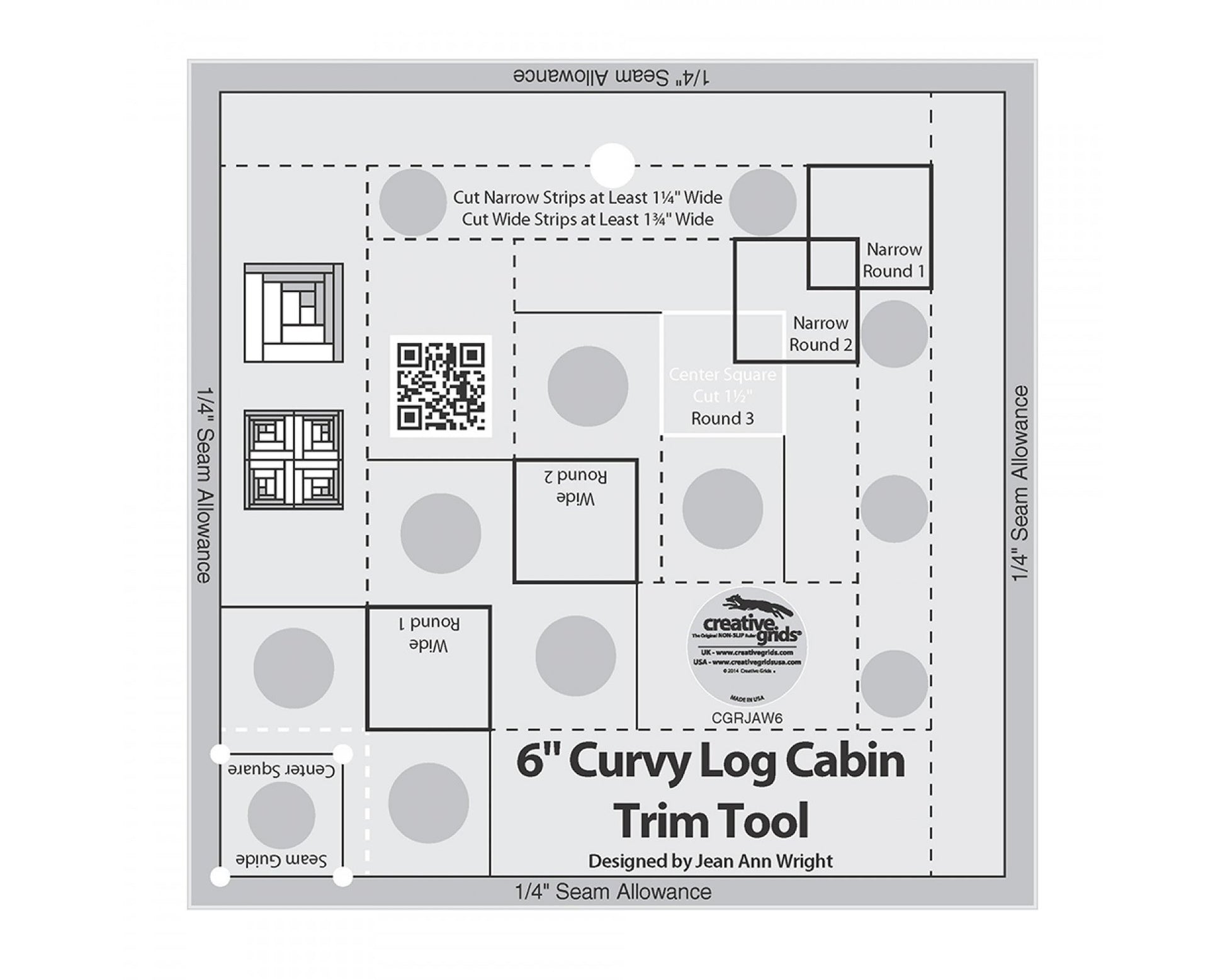 Bundle of Creative Grids Curvy Log Cabin Trim Tool 6in Finished Blocks and Cut Loose Press Rainbow Swirls Curvy Log Cabin Quilt PatternCreate the illusion of curves with this 6 inch version of Creative Grids’ popular Curvy Log Cabin Trim Tool.Mark the wrong side of the center square through the holes on the ruler to ensure a perfect seam allowance. Then sew a round – two narrow strips and two wide strips and trim. Add two more rounds to complete a perfect 6 inch finished block. Sew four blocks together to “piece” a circle which finishes to 12 inchesThe template slides easily over the fabric until pressure is applied. Then, Creative Grids’ exclusive gripper holds the fabric in place while cutting, eliminating slipping and miss-cuts! The template comes with fully illustrated step by step instructions or scan the QR Code printed on the template to view a video demonstration.Rainbow Swirls, by Cut Loose Press, may be made using either Creative Grids Curvy Log Cabin Trim Tool 6in Finished Blocks (CGRJAW6), with a finished quilt size of 58” by 58”, or Creative Grids Curvy Log Cabin Trim Tool 8in Finished Blocks (CGRJAW5), with a finished quilt size of 76” by 76”.The Rainbow Swirls pattern is fat quarter friendly. Cut Loose Press patterns are printed on 8-1/2” x 11”, card stock, with 3-ring binder hole already punched