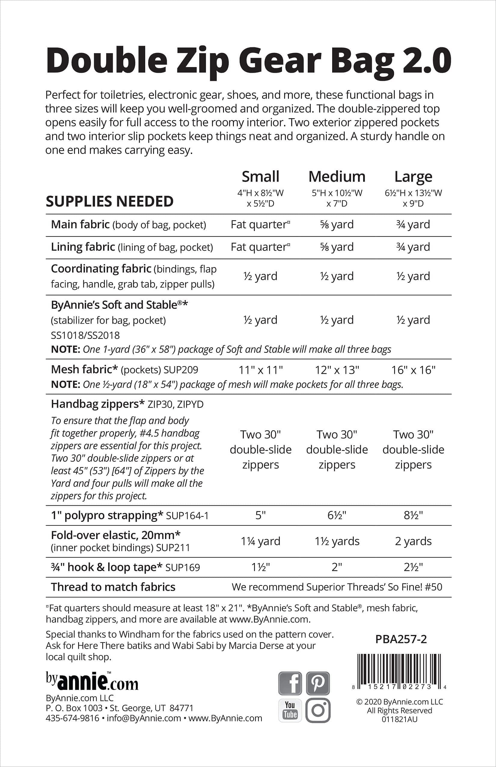 By Annie LLC Double Zip Gear Bags 2.0, VariousDouble zippered 3 sizes of bags are perfect for make-up, toiletries, electronic gear, shoes, and more, these functional bags in three sizes will keep you well-groomed and organizedThe pattern includes instructions for bags in three sizes: SMALL: 4 in H x 8.5 in W x 5.5 in D MEDIUM: 5 in H x 10.5 in W x 7 in D, LARGE: 6½ in H x 13½ in W x 9 in DDouble Zip Gear Bag 2.0 is an update of our popular Double Zip Gear Bag patternThis pattern includes instructions for bags in three sizes. The medium is similar to the original pattern, with some minor changes to dimensions and markingsThe small bag is about 25% smaller than the original, and the large bag is about 25% larger than the original pattern
