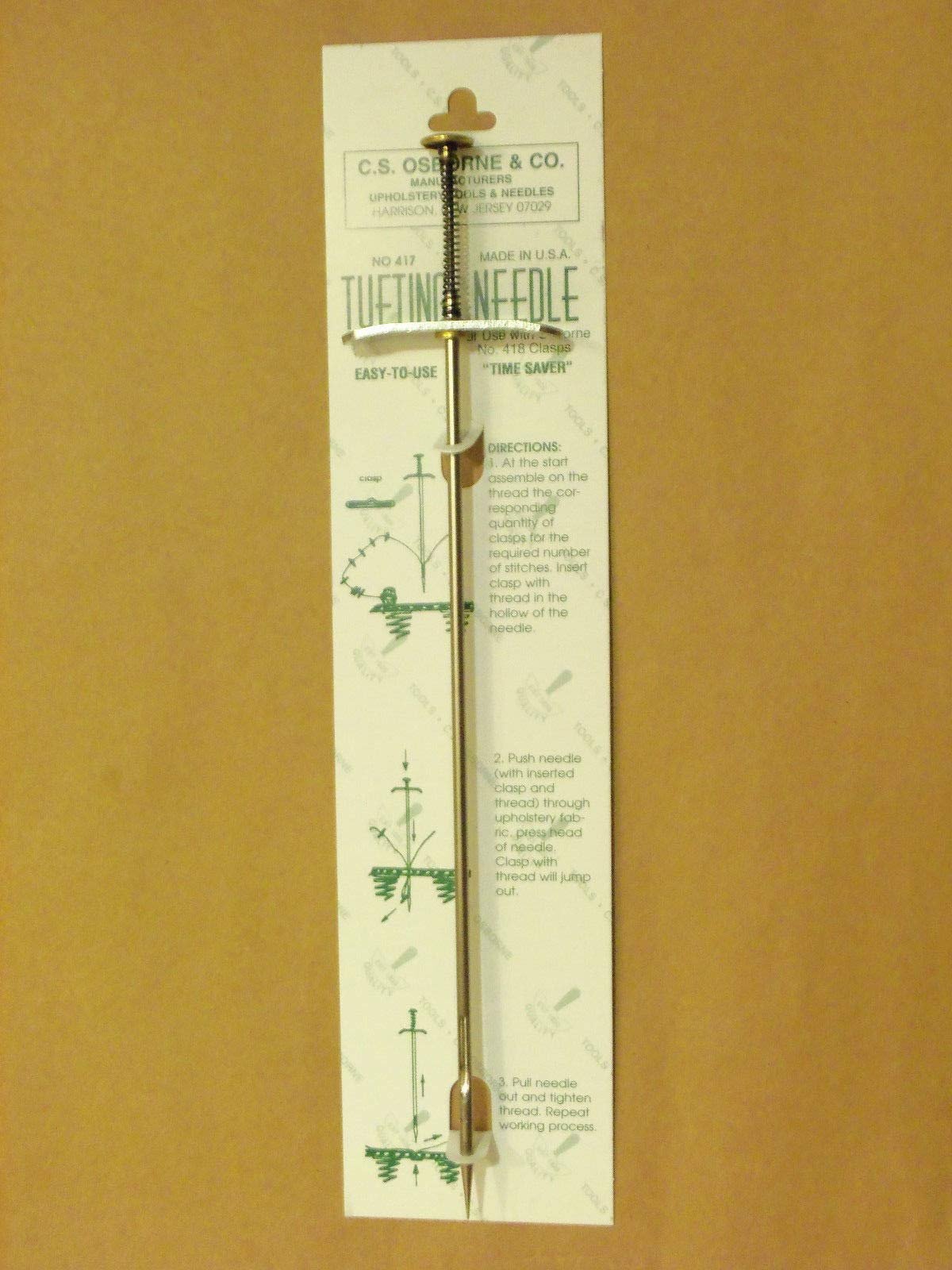 C.S. Osborne Tufting Needle. THE VERY BEST. Does not catch when needle is withdrawn. After threading button, end of needle is loaded with clasp. As needle reaches maximum depth, clasp is ejected. Saves time and labor. No need to remove the outside back of piece being tufted. A splendid tool to the true craft person. Instructions included. Made in USA. Overall length : 12" Clasps (Osborne no. 418) also available in our shop.C.S. Osborne Tufting Needle.THE VERY BEST. Does not catch when needle is withdrawn. After threading button, end of needle is loaded with clasp. As needle reaches maximum depth, clasp is ejected. Saves time and labor. No need to remove the outside back of piece being tufted. A splendid tool to the true craft person. Instructions included. Made in USA.Overall length : 12"Clasps (Osborne no. 418) also available in our shop.