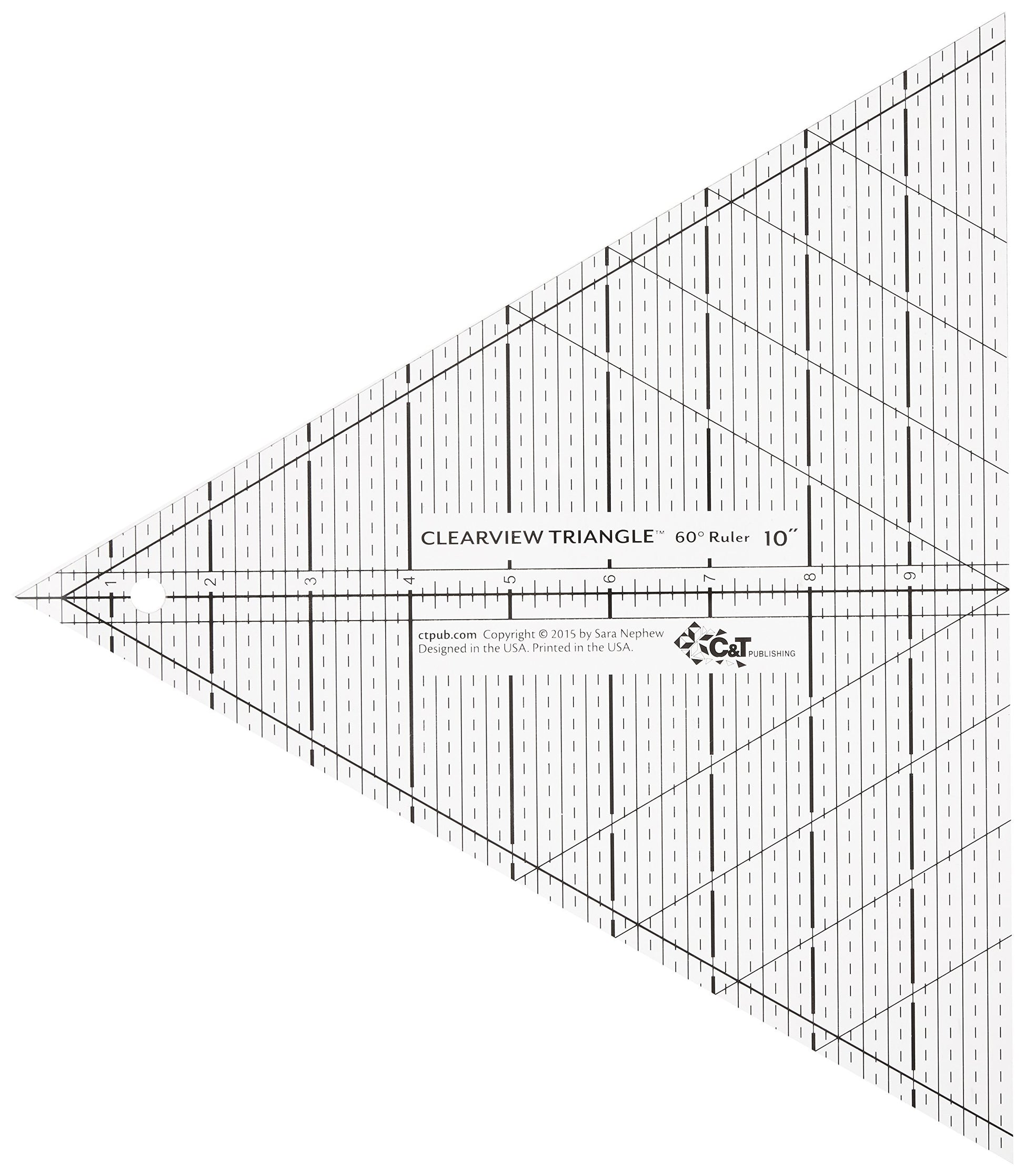 C&T Publishing Clearview 10" Triangle Ruler 60 DegreeC&T Publishing notions ruler Clearview Triangle 60 Degree 10C&T Publishing notions ruler Clearview Triangle 60 Degree 10- new & improved, this tool is versatile for many projects including;Tumbling blocks, fireworks, hollow cube, seven Sisters and 60 Degree log cabin blocksMake Triangles, diamonds and half Triangles from this rulerMade of clear Acrylic, markings are every 1/8with alternating Solid and dashed thin lines with heavier lines marking inches all in black
