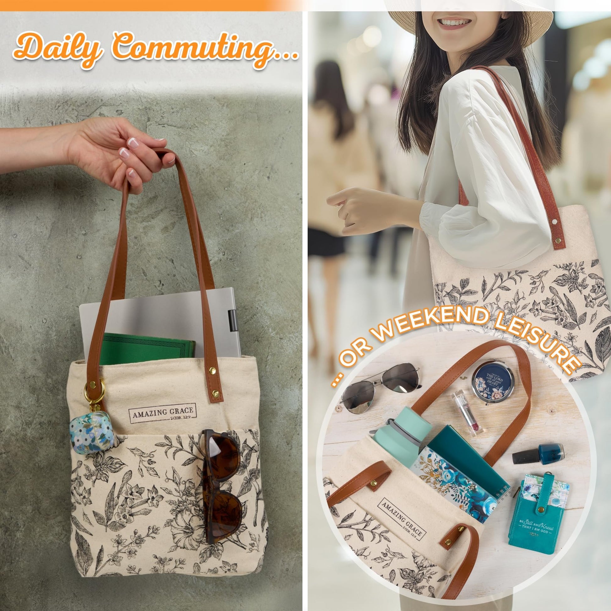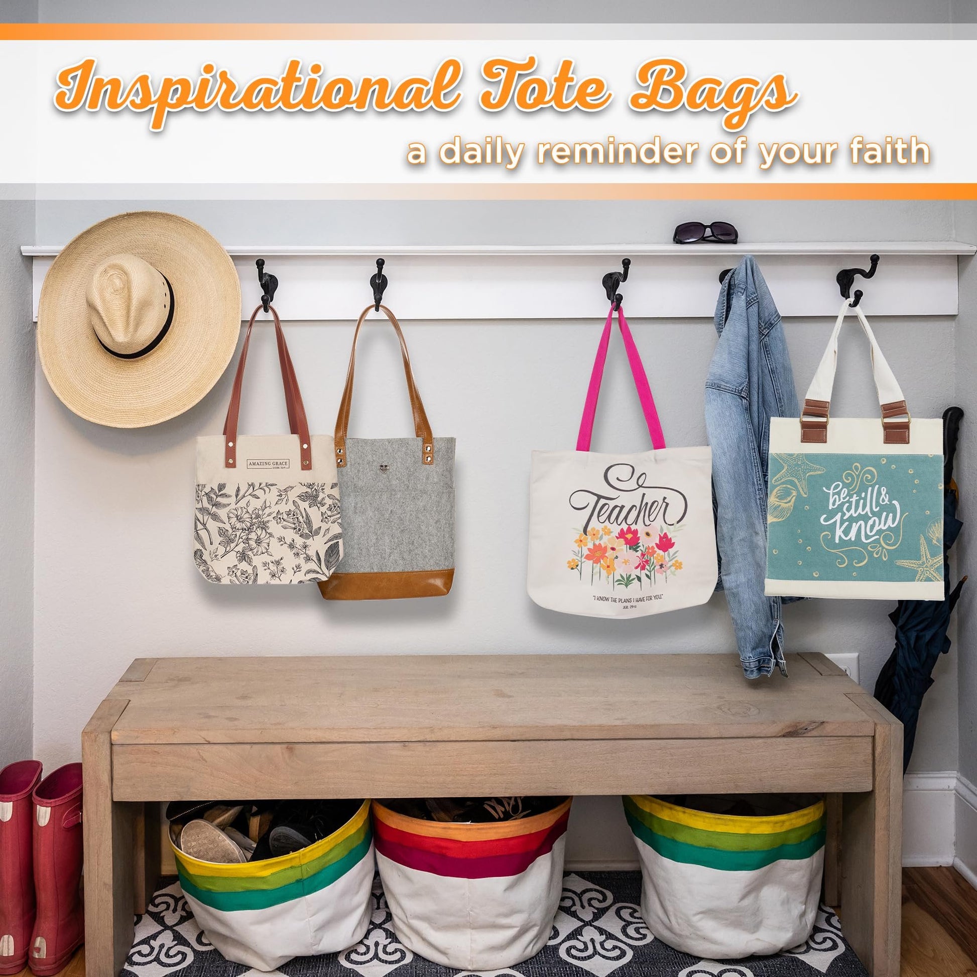 Christian Art Gifts Canvas Floral Tote Bag for Women: Amazing Grace Inspirational Scripture for Shopping, Supplies, Books, Accessories, Vegan Leather, Pocket, Zippered Closure, Creamy Tan & BrownSturdy Reusable 100% Cotton Canvas Material: Made of non-woven quality light tan canvas, the tote carry bag features strong weight resistance and can withstand daily wear and tear thanks to its tightly stitched construction, metal hardware, and durable brown faux leather handles. The every day tote is lined with 100% cotton and features a secure zipper closure with silver ziper pull to keep your belongings safe.Versatile Practical Every Day Accessory: Perfect size for all of your errands, crafts or even weekend travel and lined with 100% cotton on the interior. Carry it to church, class, work, or use to store accessories at home. Great for carrying stationery, reading supplies, or taking grocery shopping. Not intended for children. Size: 12 x 12 x 3.5 Inches.Eco-friendly, Collapsible Shopping Shoulder Bag for Adults: Easily collapses to keep in the trunk of your car or for storing in a drawer ready for easy use in a pinch. Tightly stitched for durability with metal hardware attached, the quality and man-made, vegan leather handles can be carried in hand or on the shoulder with much ease. Carry all of your every day tools in style and keep them secured with the zipper closure.Beautiful Simple Printed Design for Yourself or a Loved One: The cute creamy tote bag features "Amazing Grace" framed in a printed black, elegant font directly complemented with a screen-printed black floral pattern directly below on the slip pocket. 2 Corinthians 12:9 is referenced by the sentiment.Faith, Hope, & Love: Christian Art Gifts offers a wide variety of Scripture print items. From Bible Covers, Coloring Books, Journaling Bibles, Journals, Planners, and Devotionals, the company strives to bring the best quality products with a special message of hope and encouragement on each and every one.