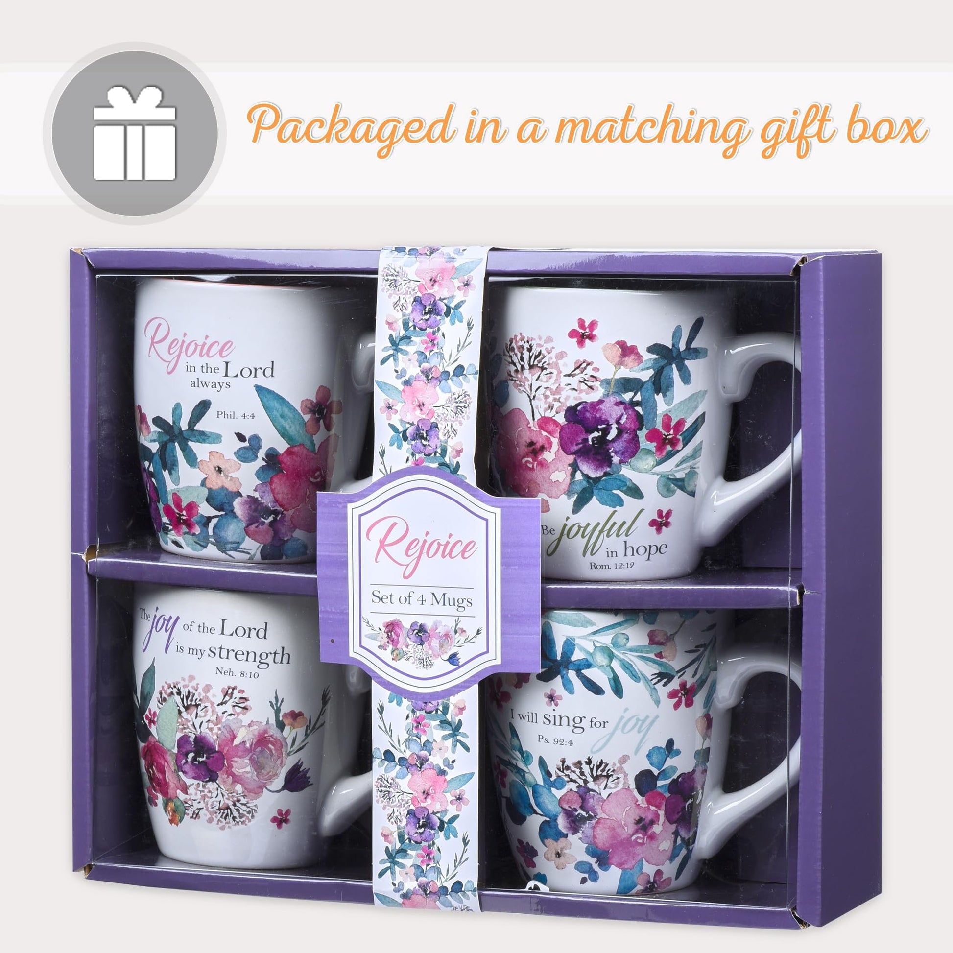 Christian Art Gifts Ceramic Coffee or Tea Mug Set for Women, Rejoice Watercolor Flowers Design Bible Verse Mug Set, Boxed Set of 4 Coffee CupsCoffee cup set (4 pack) bring joy in your life with thoughtful and uplifting sentiments from: Philippians 4:4, Nehemiah 8:10, Psalm 92:4, and Romans 12:19. Each cup is approximately 4 inches tall and has a 11-ounce capacity.Each women’s inspirational coffee cup is approximately 4 inches tall and has a 11-ounce capacity. Rejoice mug has pink interior, Joy of the Lord has purple interior, Sing for Joy has light blue interio and Joyful in Hope mug has sage green interior.This encouraging gift for women coffee mug set is made of durable ceramic with lead-free and cadmium-free glaze that ensures long-term and carefree usage, can be put in the microwave or dishwasher.Packaged in an open face gift box for easy gifting, this inspirational coffee cup set makes an easy and useful gift for any occasionChristian Art Gifts offer a wide variety of scripture and faith building items from bible covers, coloring books, journaling bibles, journals, planner and devotional books