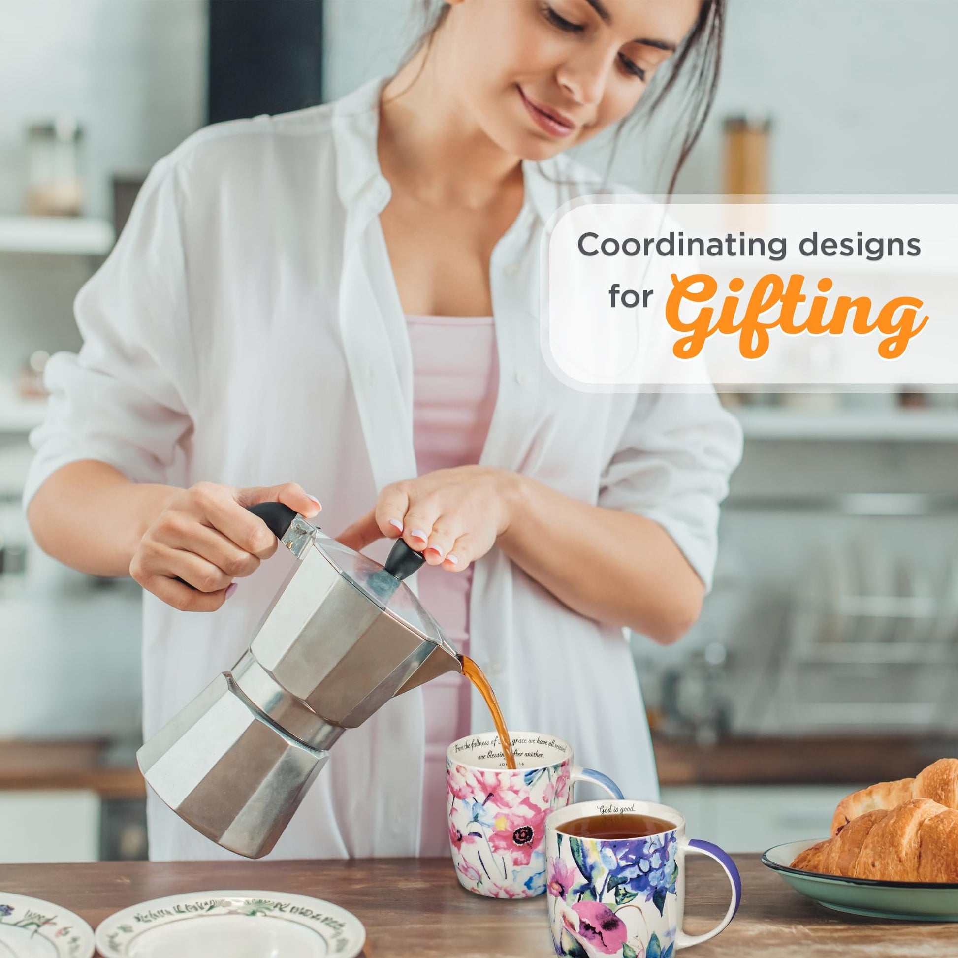 Christian Art Gifts Ceramic Coffee or Tea Mug Set for Women, Seeds of Love Garden Blooms Design Bible Verse Mug Set, Boxed Set of 4 Coffee CupsBoxed set of 4 ceramic coffee mugs with garden blooms design and inspiring Bible verses on the inside rimDurable mugs made of ceramic with lead-free, cadmium-free glaze; microwave and dishwasher safe10-oz capacity mugs perfect for coffee, tea, cocoa; white body with watercolor floral patternInspirational Christian gift for women; packaged in an open gift box for easy giftingBy Christian Art Gifts; wide variety of Scripture home decor, journals, Bible covers, and devotional books
