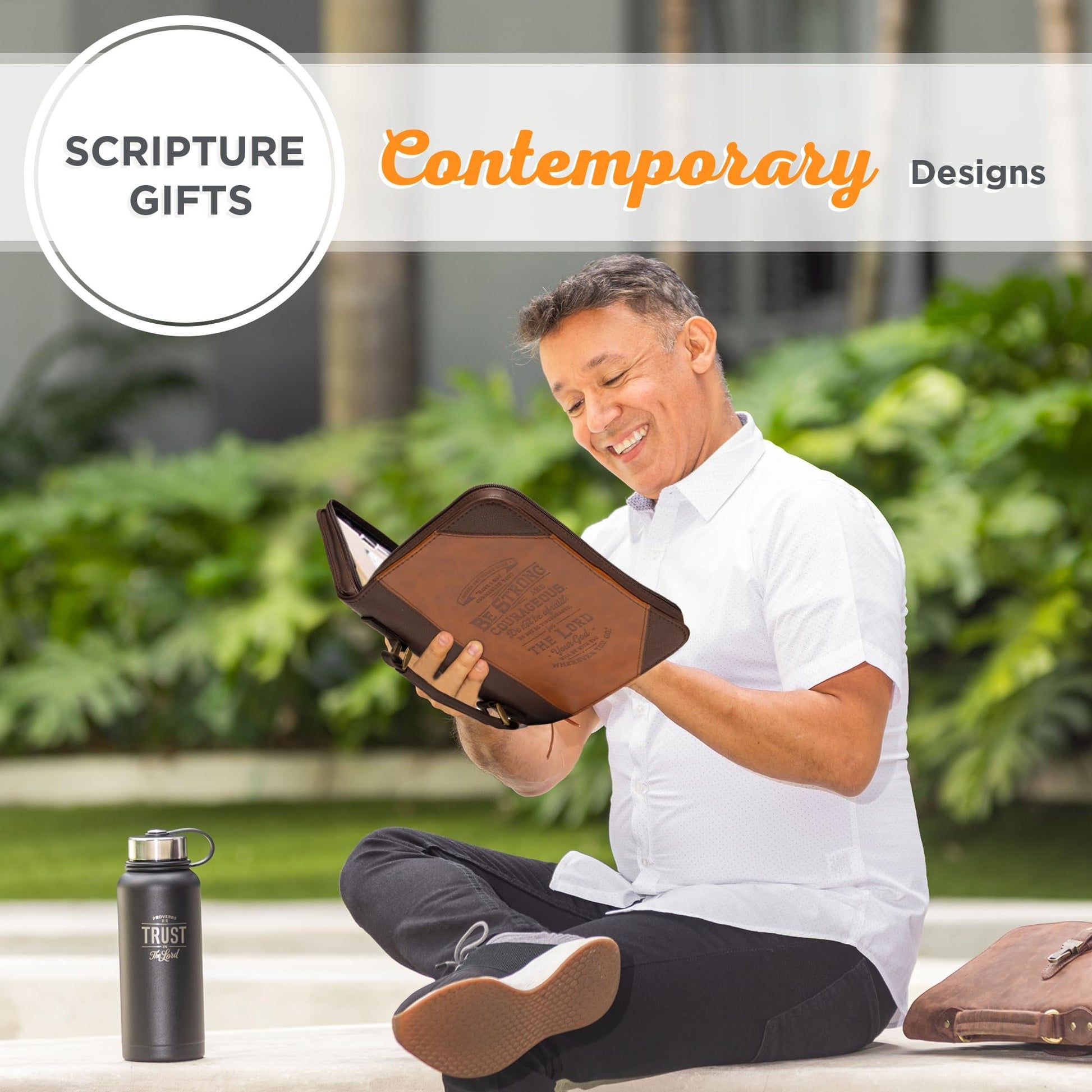 Christian Art Gifts Classic Bible Cover Do Not Be Afraid Joshua 1:9 Faux Leather, Toffee/Brown, LargeDurable: Protect your Bible from life’s mishaps with this classic brown Bible cover for men and women made from sturdy faux leather material that is easy to clean and will withstand daily wear.Scripture Bible Case: This handsome brown case features scripture sentiment from Joshua 1:9 in debossed lettering with two-tone design wrapping around the spine and back panel.Medium, Large, XL Size: Note that Amazon specifications are exterior Bible cover dimensions. To ensure best fit measure Bible precisely & compare to size chart. Allow extra room to avoid a too snug fit.Convenient Accessories: Handle is easy to hold, or slip this Bible cover into a larger bag for easy travel to church or Bible Study. Interior pen loop secures your pen or highlighter when not in use.Secure Zipper Closure: Ensures your Bible stays clean and safe inside. Exterior slip pocket provides extra space for organization. Slip your loose notes, bulletins, or tissues inside for easy storage.