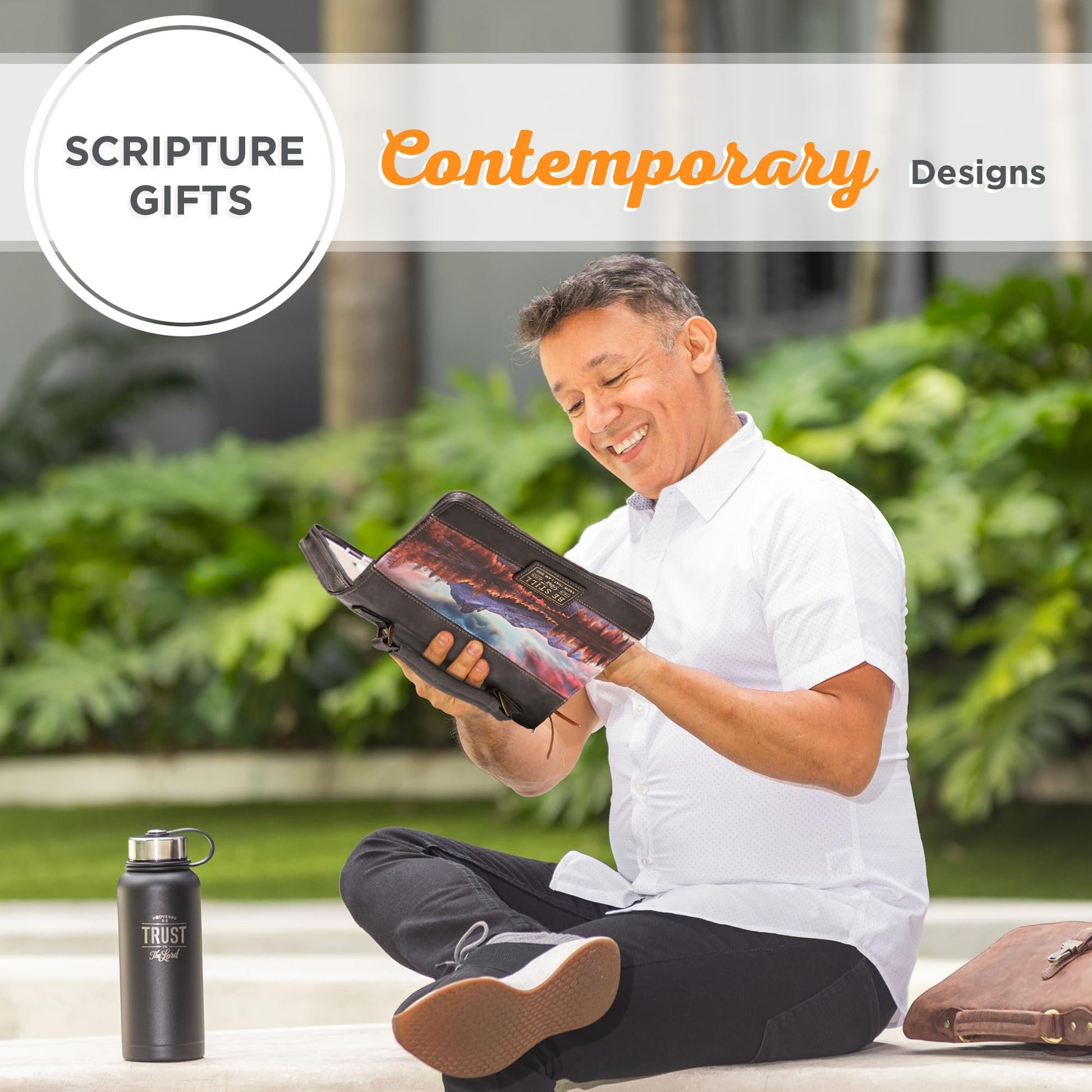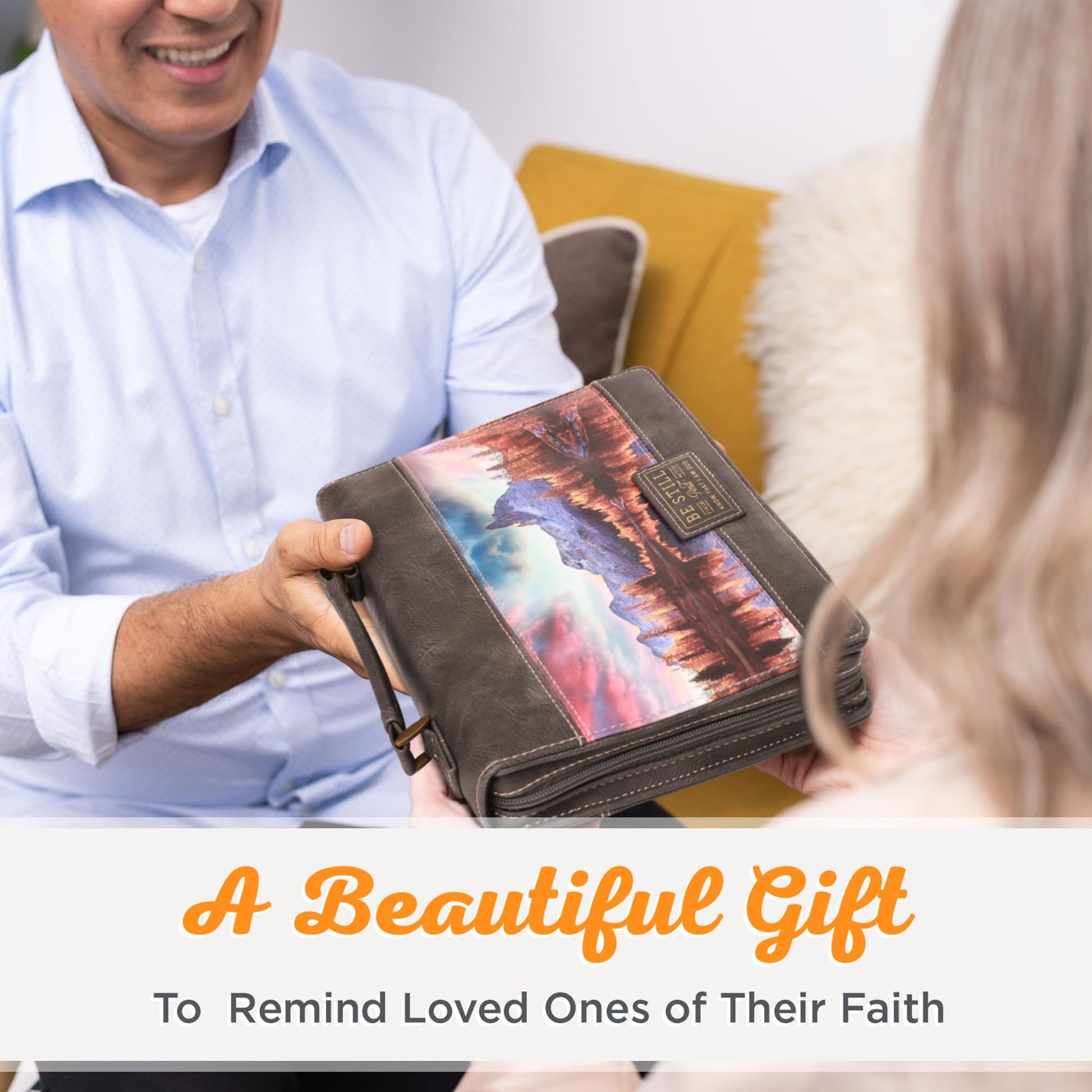 Christian Art Gifts Classic Faux Leather Bible Cover: Be Still and Know - Psalm 46:10 Inspirational Bible Verse with Majestic Valley and Mountains, Charcoal/Gray, MediumDurable: Protect your Bible from life’s mishaps with this majestic valley and mountains fashion Bible cover for women made from sturdy faux leather material that is easy to clean and will withstand daily wear.Scripture Bible Case: This stylish case features a Scripture sentiment from Psalm 46:10 in printed lettering with a tranquil full-color landscape design on the fabric front cover and a charcoal gray faux leather back cover.Convenient Accessory for Storage & Stationery: Handle offers a firm hold and is easy to grip. It showcases antiqued brass hardware and attaches the lay-flat handle to the body securely. Travel worry-free to church, class, school, or work and encourage and motivate a loved one with the gift of this beautiful Bible cover.Faith Inspired Design: This pretty, stylish charcoal tote features the text “Be still & know that I am God” from the beloved Psalm 46:10 and is encompassed by a small faux leather patch and a heat-debossed Scripture sentiment with touches of gold foiled.Available in Medium and Large Varieties: Amazon specifics are outside cover dimensions. To ensure best fit measure Bible precisely and compare to size chart. Allow extra room to avoid a too snug fit. Both case sizes can be easily placed in a larger bag or handbag, backpack or purse. Bless yourself and your loved ones by presenting them with one of our many Bible covers for men, women and children.