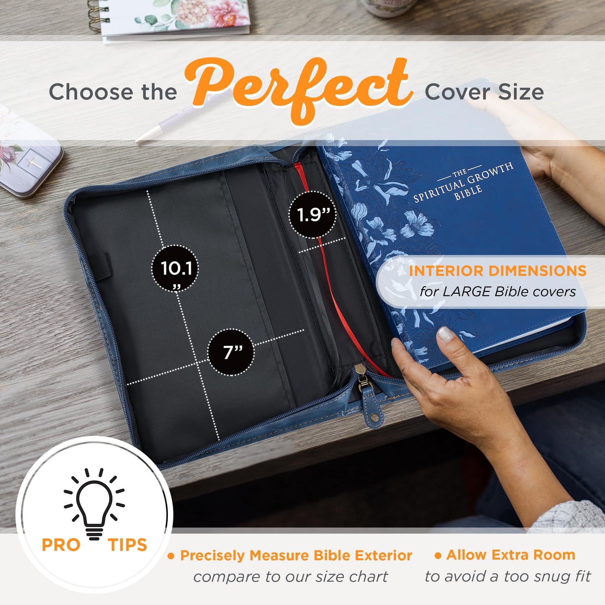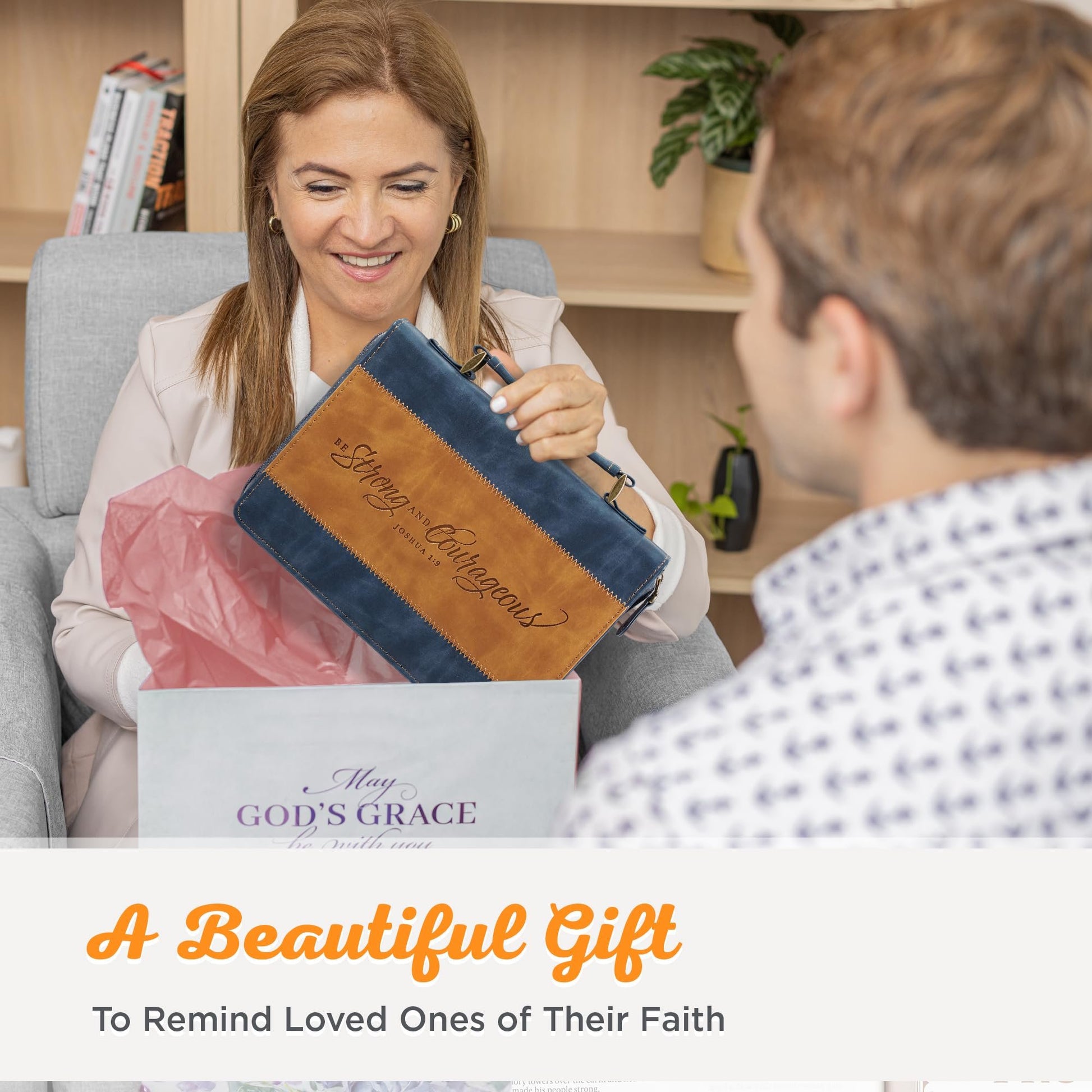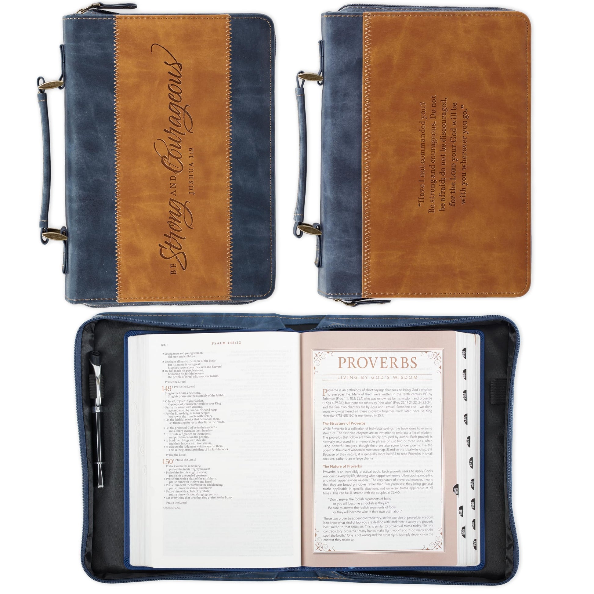 Christian Art Gifts Classic Vegan Leather Bible Cover Carry Case for Men & Women: Strong & Courageous Debossed Inspirational Scripture, Pen Loops, Ribbon Bookmarks, Pockets, Navy Blue & Brown, LargeDurable Sturdy Good Book Protection: Guard your copy of God's written Word from life’s mishaps with this handsome, functional & lightweight Bible and book hand bag formen, women, boys & girls. Made from high quality vegan, leather-like material the case is easy to clean, water resistant & can withstand daily wear and tear protecting your Bible from scuffing, damage, and torn and creased pages.Faith Inspired Christian Design: This durable, stylish and sturdy easy carry Bible case features an elegant heat debossed Scripture sentiment from Joshua 1:9 in a stylish font on the front "Strong and Courageous”. The full complete Bible verse is debossed on the back: "Have I not commanded you? Be strong and courageous. Do not be afraid; do not be discouraged, for the Lord your God will be with you wherever you go."Convenient Accessory for Stationery Storage: Featuring a firm, tightly stitched lay flat easy grip carry handle, the book cover's antique gold metal hardware offers extra security as you travel with your Bible. The faux leather zipper pull complements the overall design and the the cover also features an exterior back slip pocket perfect for storing small papers, memos, notes, bulletins, notepads, and more.Keep Belongings Safe: The interior contains two pen loops and nylon page pockets for extra security for your favorite book or Bible and helps prevent creasing of the covers. Store and secure many essentials neatly and orderly by slipping notecards, small electronics, index cards, extra pens and pencils, and more miscellaneous stationery.Available in Medium & Large Varieties: Amazon specifics are outside cover dimensions. To ensure best fit measure Bible precisely and compare to size chart in the image carousel. Allow extra room to avoid a too snug fit. All case sizes can be easily placed in a larger bag or handbag, backpack or purse. Bless yourself and your loved ones by presenting them with one of our many Bible covers for men, women and children.