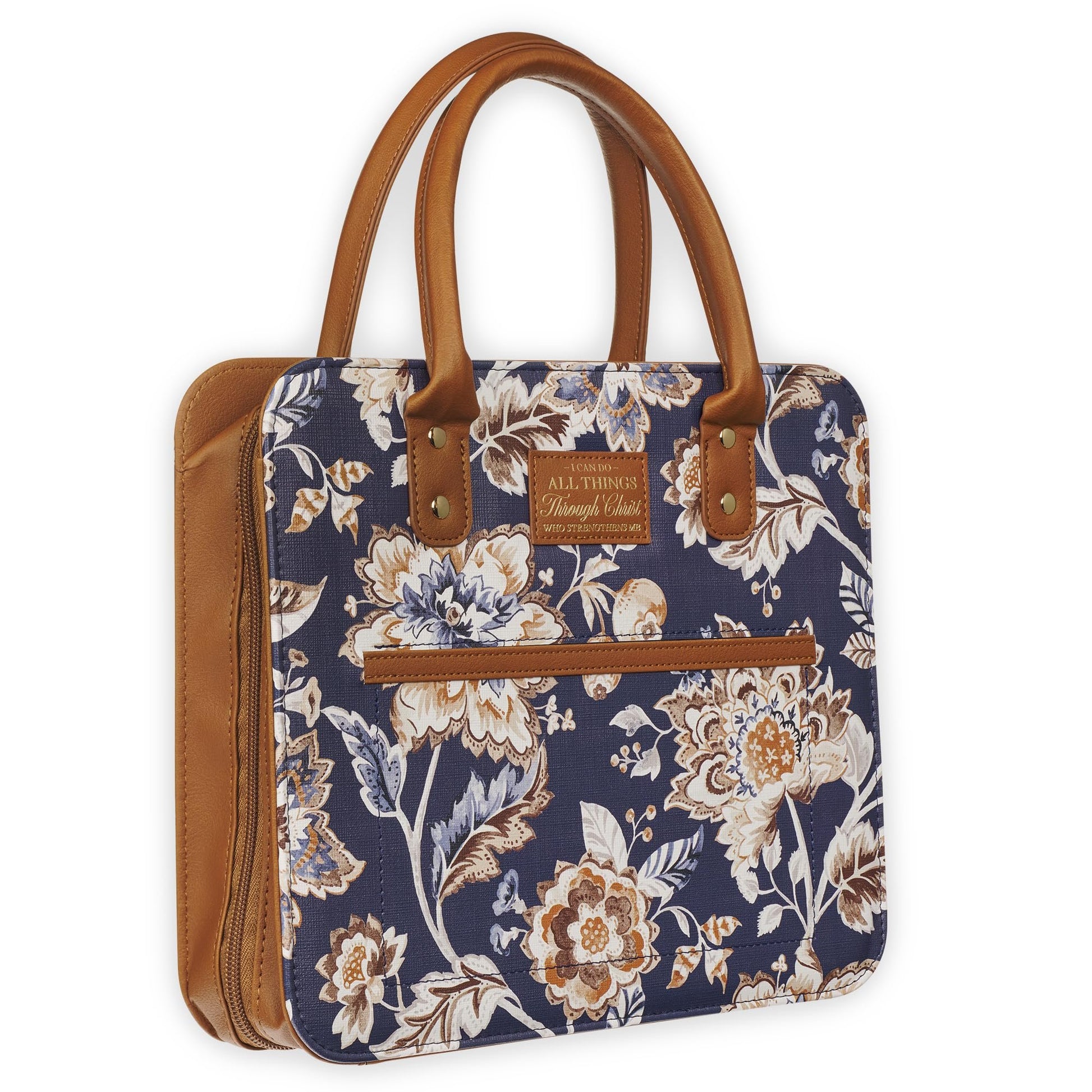 Christian Art Gifts Fashion Vegan Leather Purse Style Bible Cover Case for Women: All Things Through Christ Gold Inspirational Scripture, Pen Loops, Two Handles, Pockets, Navy & Brown Floral, XLDurable Sturdy Good Book Protection: Guard your copy of God's written Word from life’s mishaps with this cute, functional & lightweight Bible and book purse style hand bag for women and girls. Made from high quality vegan, leather-like material the case is easy to clean, water resistant & can withstand daily wear and tear protecting your Bible from scuffing, damage, and torn pages.Faith Inspired Christian Design: This durable, stylish and sturdy easy carry Bible case features a golden foiled Scripture sentiment from Philippians 4:13 accompanied by gorgeous blue, white and brown florals front and back. "I can do all things through Christ who strengthens me”. A convenient front slip pocket is featured making it perfect for storing papers, notes, bulletins and more.Convenient Accessory for Stationery Storage: Featuring two firm, tightly stitched light brown purse style handles the book cover lays flat on most surfaces and still offers a firm hold and is easy to grip and carry wherever you go. The handles showcase gold metal button hardware for additional durability and security. The two elegant engraved gold metal zipper pulls feature the message "Grace" and ensures your Bible is tightly secured.Keep Belongings Safe: Interior contains two pen loops and nylon page pockets for extra security for your favorite book or Bible. Store many essentials neatly and orderly by slipping notes, small electronics, memos, papers or bulletins inside the case for extra storage. Small electronics can be easily and securely stowed away as you travel with your Bible.Available in Medium, Large & Extra Large Varieties: Amazon specifics are outside cover dimensions. To ensure best fit measure Bible precisely and compare to size chart in the image carousel. Allow extra room to avoid a too snug fit. All case sizes can be easily placed in a larger bag or handbag, backpack or purse. Bless yourself and your loved ones by presenting them with one of our many Bible covers for men, women and children.