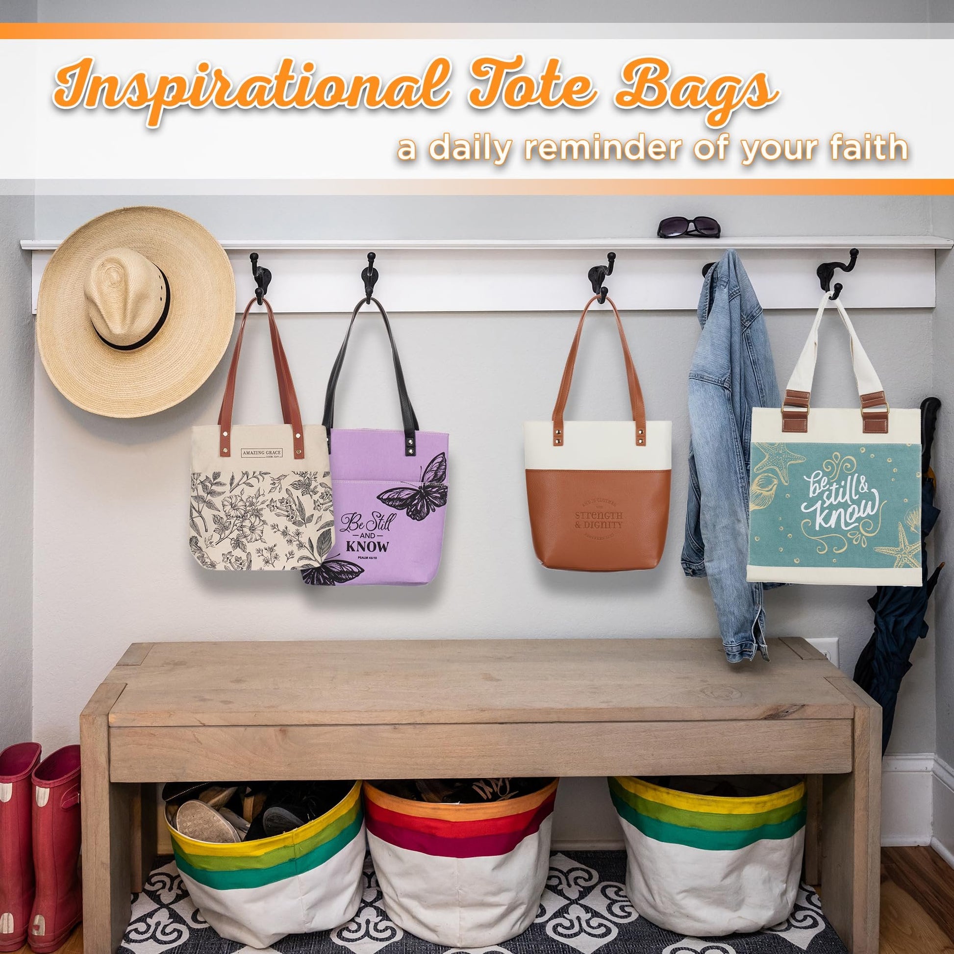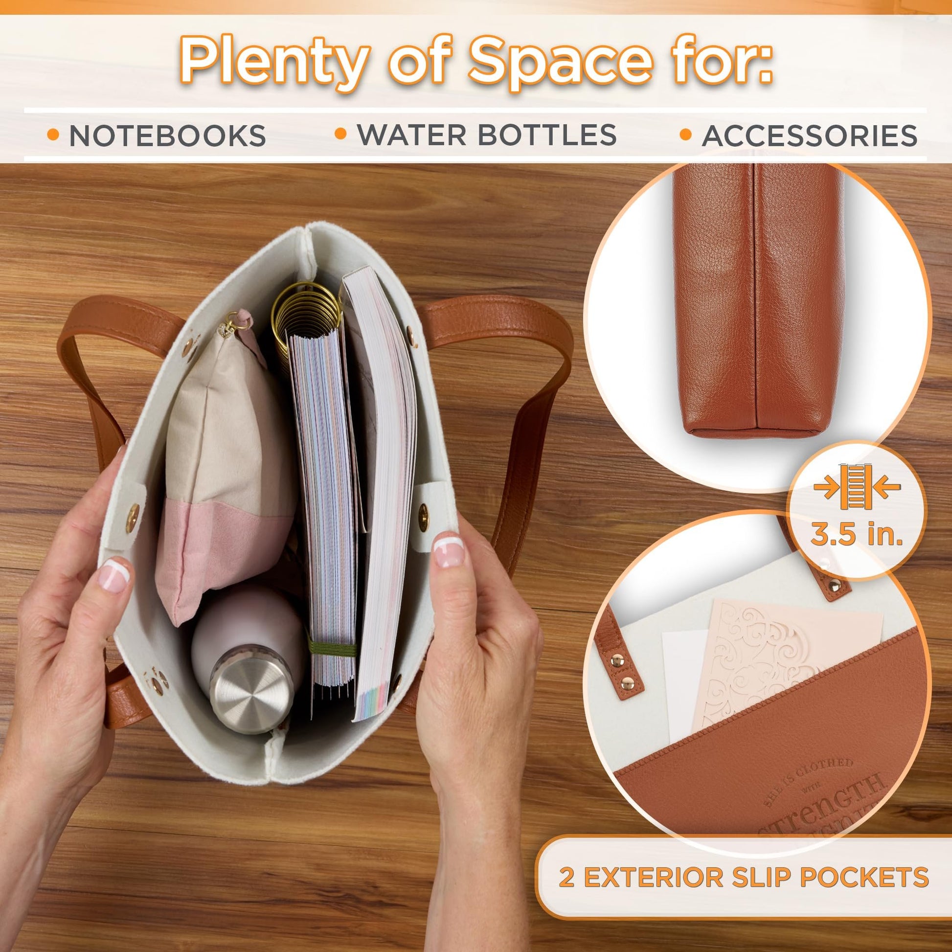 Christian Art Gifts Felt and Faux Leather Fashion Bible Cover Tote Bag for Women: Strength and Dignity - Proverbs 31:25 Bible Verse, Inspirational Durable Two-tone Tote Bag for Books and SuppliesFashion Bible Tote for Women: This fashionable Bible carrier tote bag features exterior sleeves and a Scripture sentiment from Proverbs 31:25 debossed in a circular pattern with “Strength & Dignity” in bold letters.Durable Tote: Easy to carry tote is made of sturdy cream-colored felt and toffee faux leather. The faux leather handles are attached by metallic studs making them long enough to be worn on your shoulders.Versatile Women's Accessory: Multi-use tote bag is a perfect church bag for carrying your Bible, most laptops, and tablets. It also makes for a great work tote, or even a smaller overnight bag!Large Capacity: Measures approximately 12” high with a 3.5” x 12.75” base. This spacious tote with its two exterior slip pockets allows plenty of room to carry your Bible, pens, notebook and more!Bible Verse Excerpt Taken from Proverbs 31:25 : “She is clothed with strength and dignity; she can laugh at the days to come.”