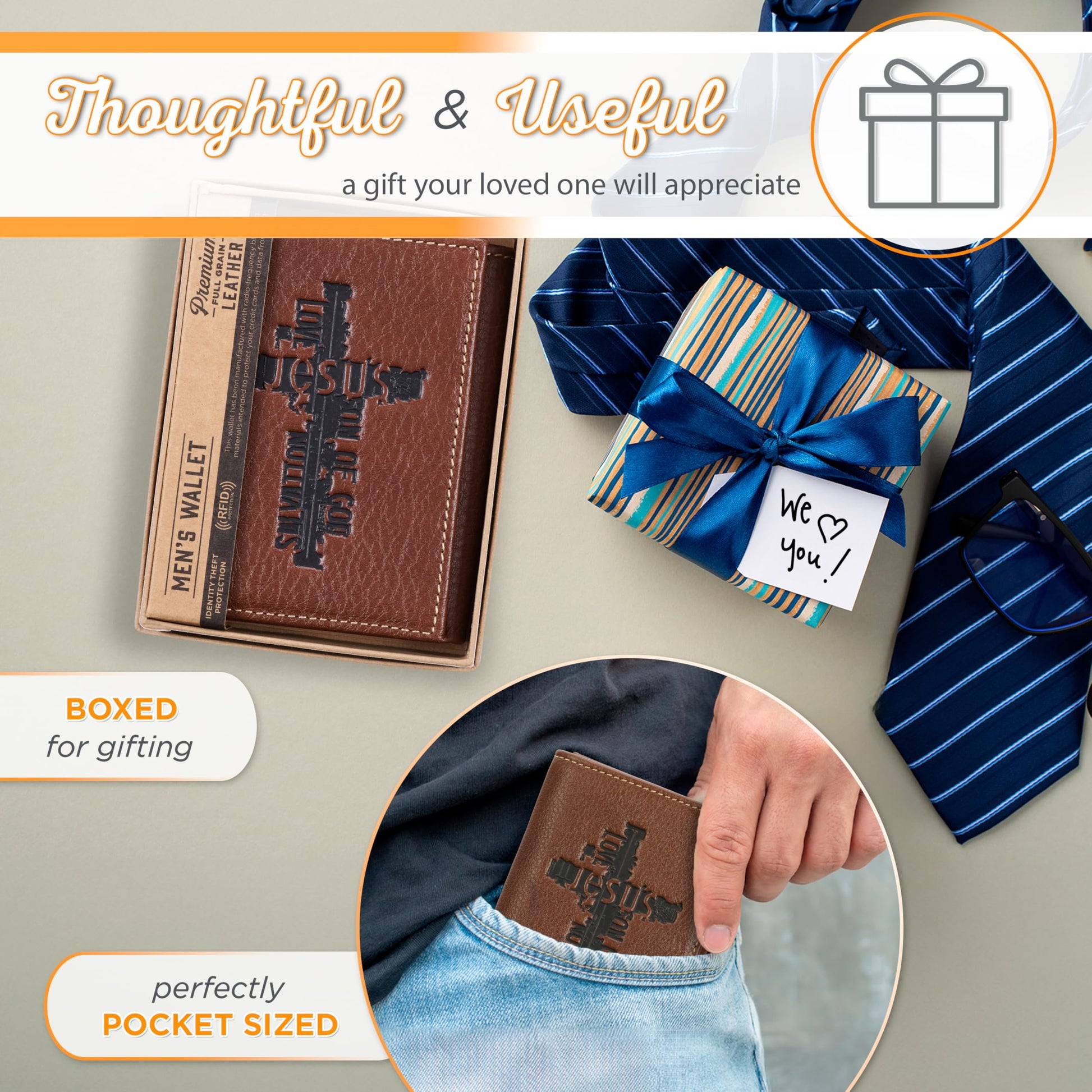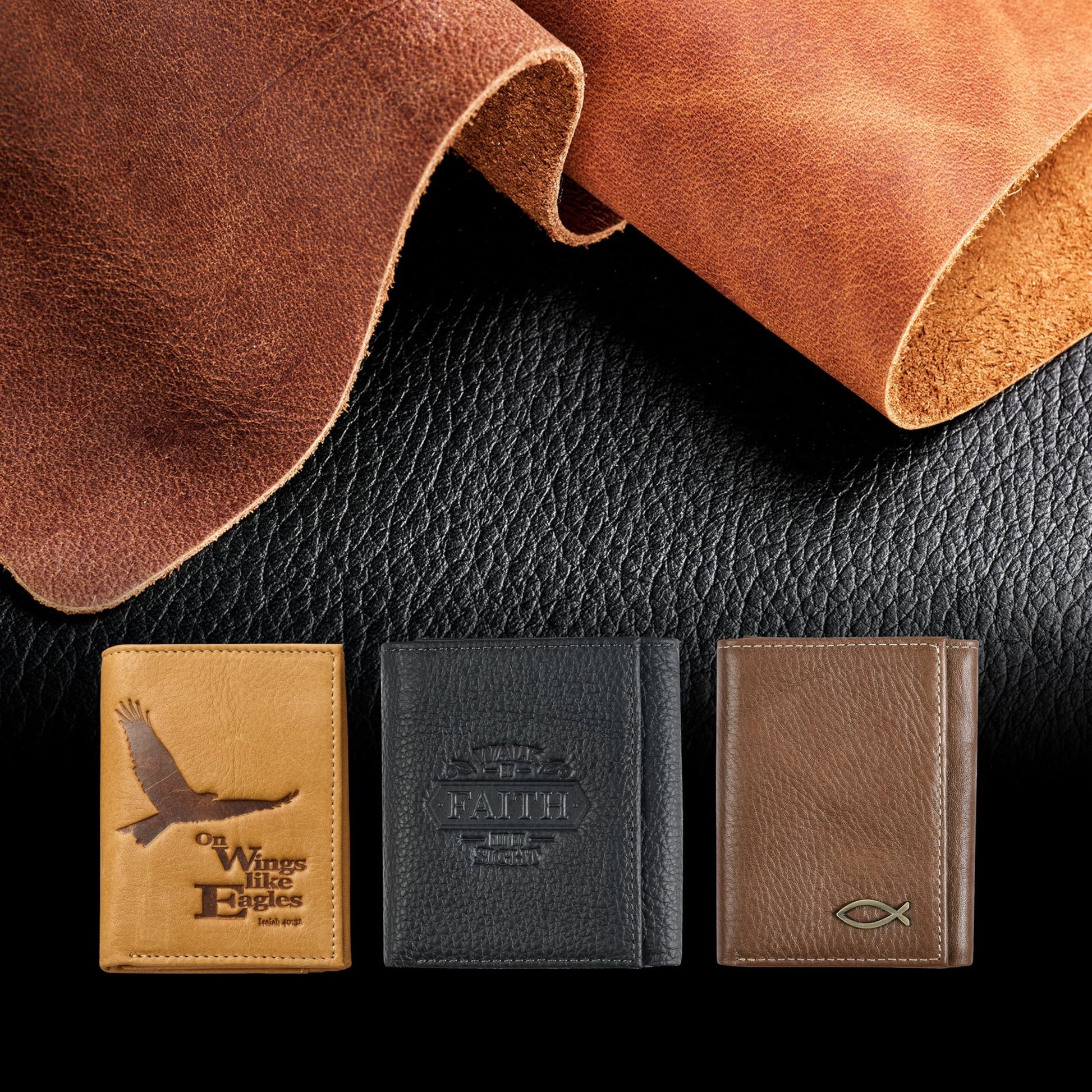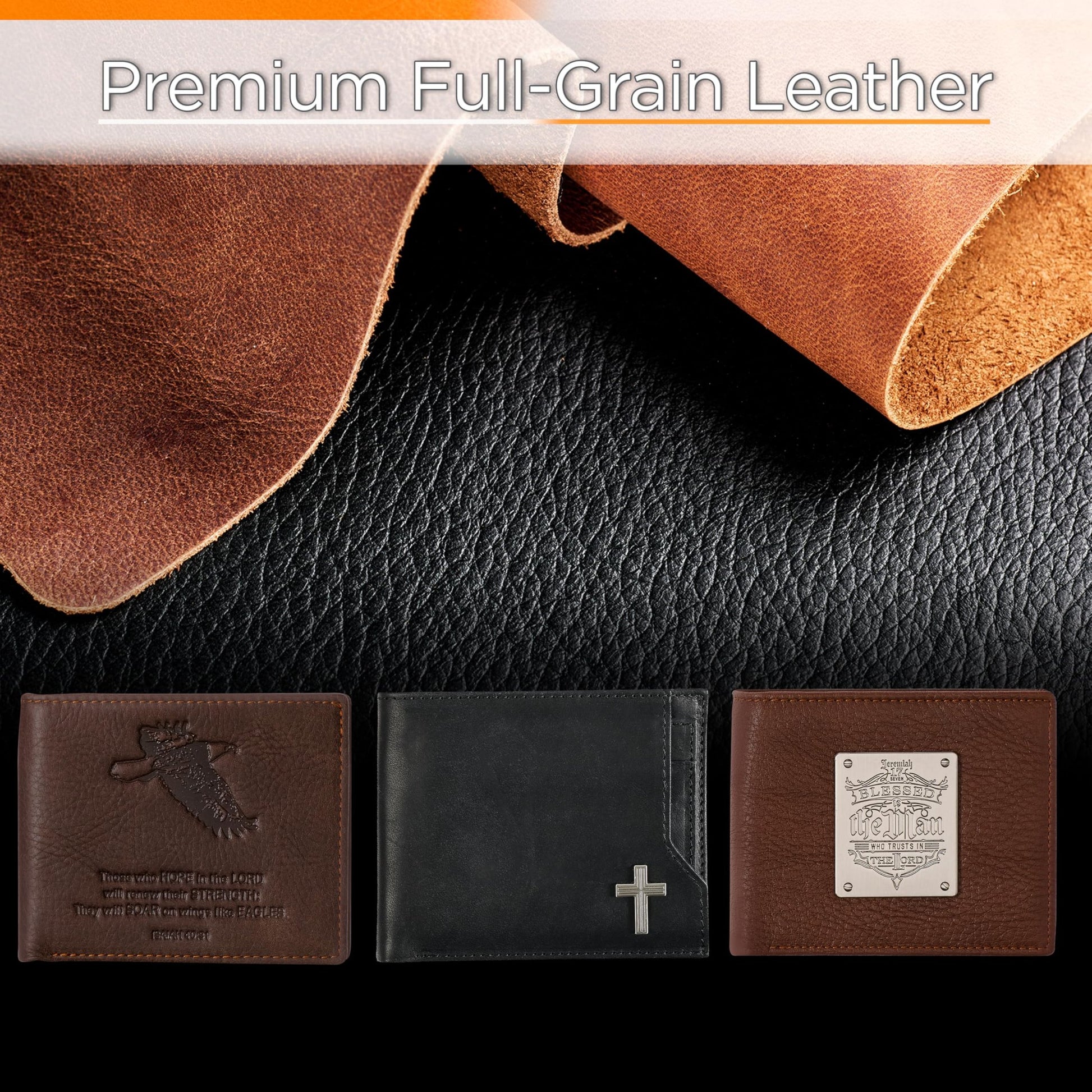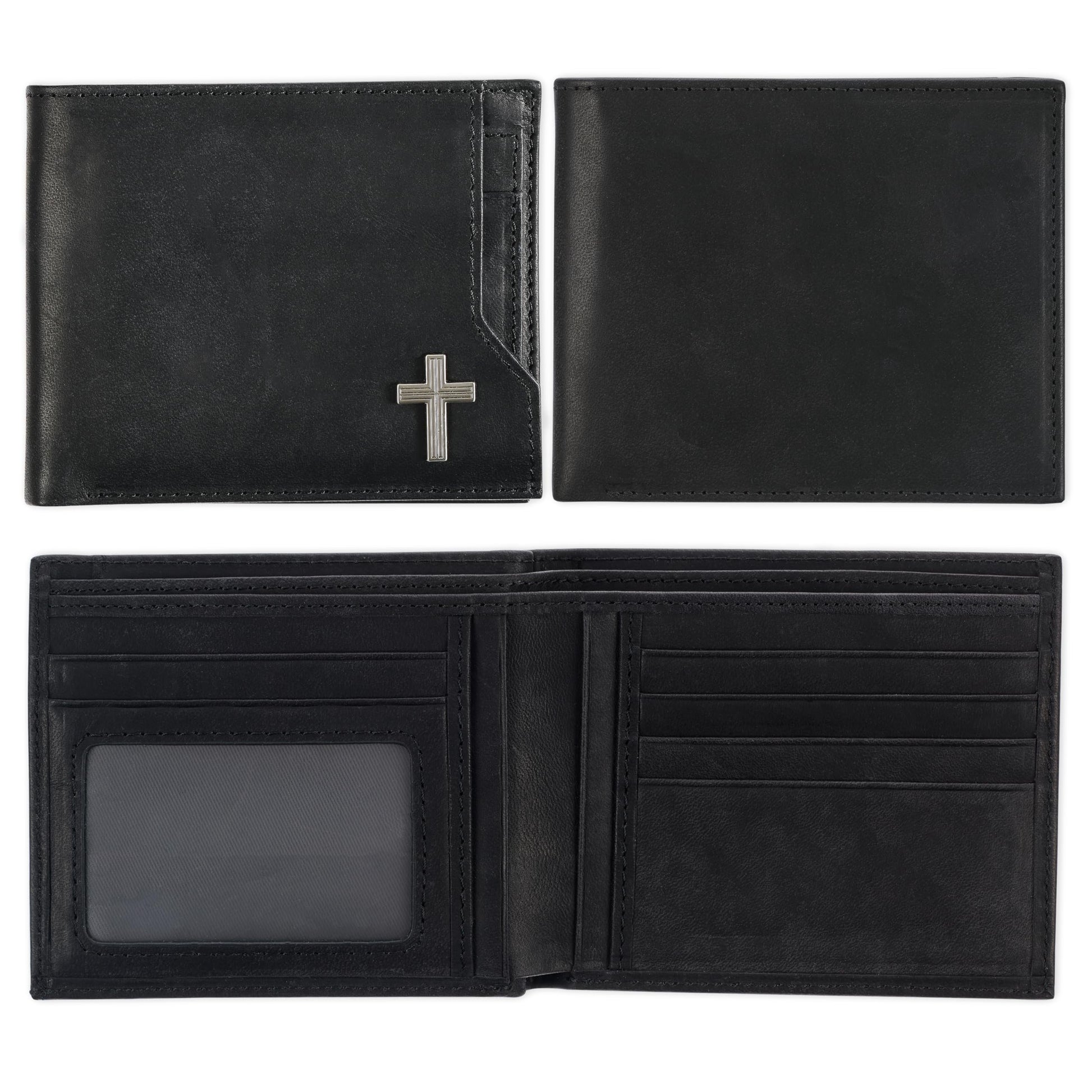 Christian Art Gifts Genuine Premium Full Grain Leather RFID Blocking Silver Engraved Cross Wallet for Men: Multi Pocket Billfold w/Removable ID Window Accessory for Credit Cards, Bills, Photos, BlackPremium Full-Grain Leather Mens Christian Wallet: The sturdy bifold design features two nylon interior sections to store bills, 5 card/ID slots, 4 multipurpose slip pockets for notes and coupons, and an easy-access photo identification window. The large, roomy front slip pocket features a removable ID window that contains an additional 3 card slots.RFID Blocking Technology: The handsome wallet doesn't just look stylish, but it also protects your credit card and identity information to ensure your most sensitive information and data stays safe and secure from theft. Keep your money, change and other small valuables safe as you travel to work, school, church and more.Genuine Quality Leather Resists Wear & Tear: The tightly top stitched minimalist design is constructed with the traveling man in mind. It's sleek, slim, and portable and can be easily slipped into back and front pockets or your favorite jeans or dress pants, suit jacket pocket, or coat pocket.Scripture Accessory for Easy Gifting: The wallet is decorated with a small, stylish engraed silver cross emblem in the bottom right corner affirming you of your faith. This faith-inspired designs adds a soft, elegant touch to the wallet's smooth premium leather feel.Faith, Hope, & Love: Christian Art Gifts offers a wide variety of faith-based items for all occasions. From Bible Covers, Coloring Books, Journaling Bibles, Journals, Planners and Devotional Books, the company strives to bring quality products with a special message of hope and encouragement on each one.