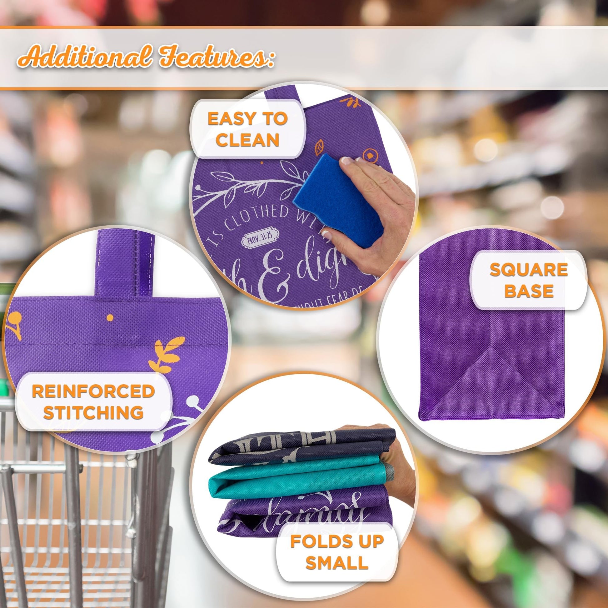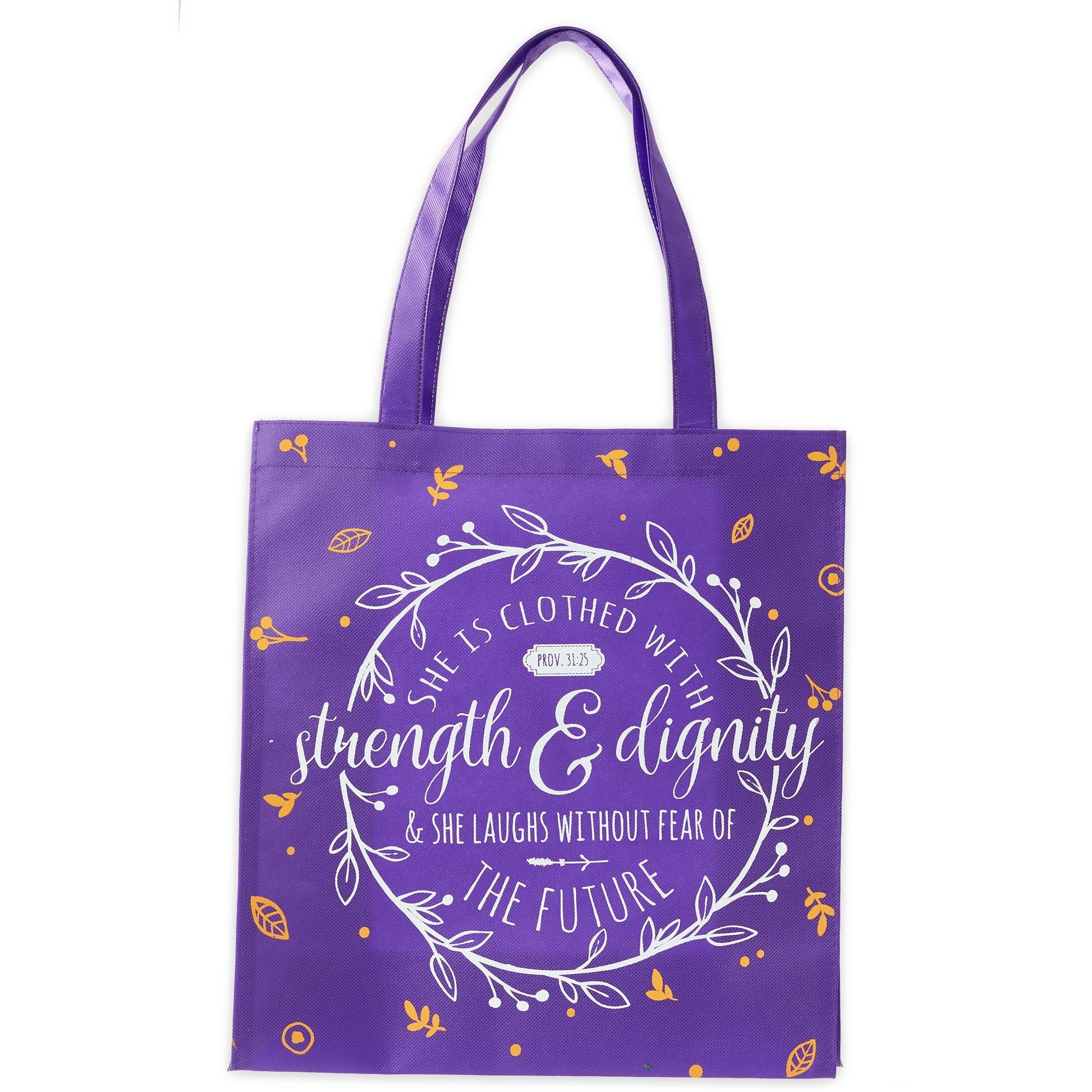 Christian Art Gifts Reusable Shopping Tote Bag for Women: Strength & Dignity - Proverbs 31:25 Inspirational Bible Verse, Easy-hold Collapsible Handbag for Groceries & Books, Golden Leaves, PurpleSturdy & Withstands Wear & Tear: Made of non-woven polypropylene material. The reusable tote features reinforced stitching along the edges, bottom and handles of the bag to assure you will be able to carry your groceries, books supplies, accessories and more with ease. The reusable tote is very easy to wipe clean with a dry cloth.ReVersatile Use: Perfect size for all of your errands, crafts or even weekend travel. Size: 6 x 13.75 x 14.6 InchesFriendly for the Environment: Easily collapses to keep in your trunk for ready use. Stitched for durability with handles can be carried in hand or on your shoulder.Full Color Printed Design: The stylish, chic and silky purple shopping bag features the beloved Scripture passage Proverbs 31:25: "She is clothed in strength & dignity & she laughs without fear of the future.” The text is complemented with golden yellow leaves and a lovely white wreath made of sprigs.Faith, Hope, and Love: Christian Art Gifts offer a wide variety of Scripture print items. From Bible Covers, Coloring Books, Journaling Bibles, Journals, Planner and Devotional Books, the company strives to bring the best quality products with a special message of hope and encouragement on each one.