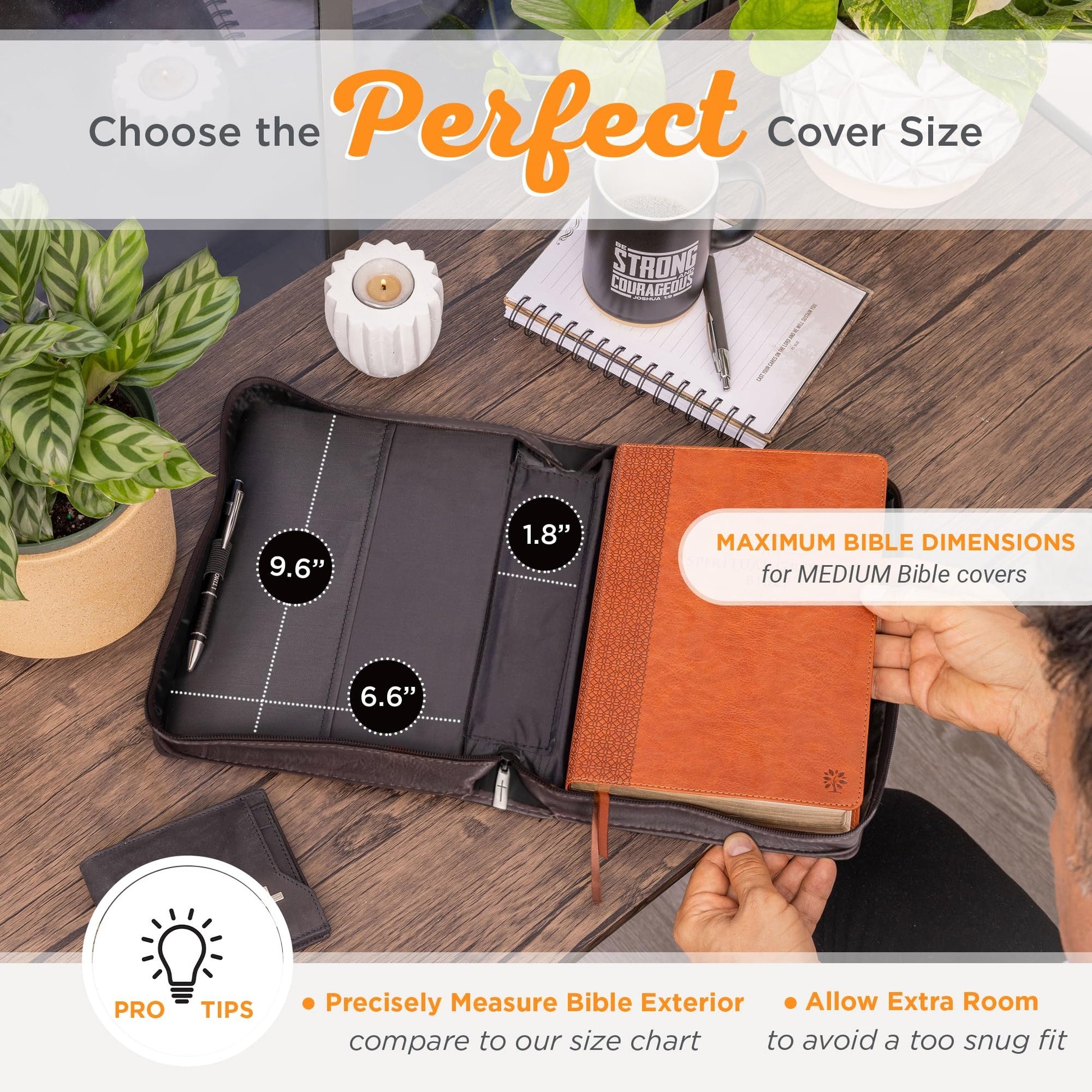 Christian Art Gifts Men's Classic Bible Cover Be Strong and Courageous Joshua 1:9, Brown Faux Leather, MediumDurable: Protect your Bible from life’s mishaps with this classic brown Bible cover for men and women made from sturdy faux leather material that is easy to clean and will withstand daily wear.Scripture Bible Case: This handsome two-tone case features scripture sentiment from Joshua 1:9 debossed on the front and back panels and gold foil accents on the font cover and spine.Medium, Large, XL Size: Note that Amazon specifications are exterior Bible cover dimensions. To ensure best fit measure Bible precisely & compare to size chart. Allow extra room to avoid a too snug fit.Convenient Accessories: Handle is easy to hold, or slip this Bible cover into a larger bag for easy travel to church or Bible Study. Interior pen loop secures your pen or highlighter when not in use.Secure Zipper Closure: Ensures your Bible stays clean and safe inside. Slip your loose notes, bulletins, or tissues inside for easy storage.