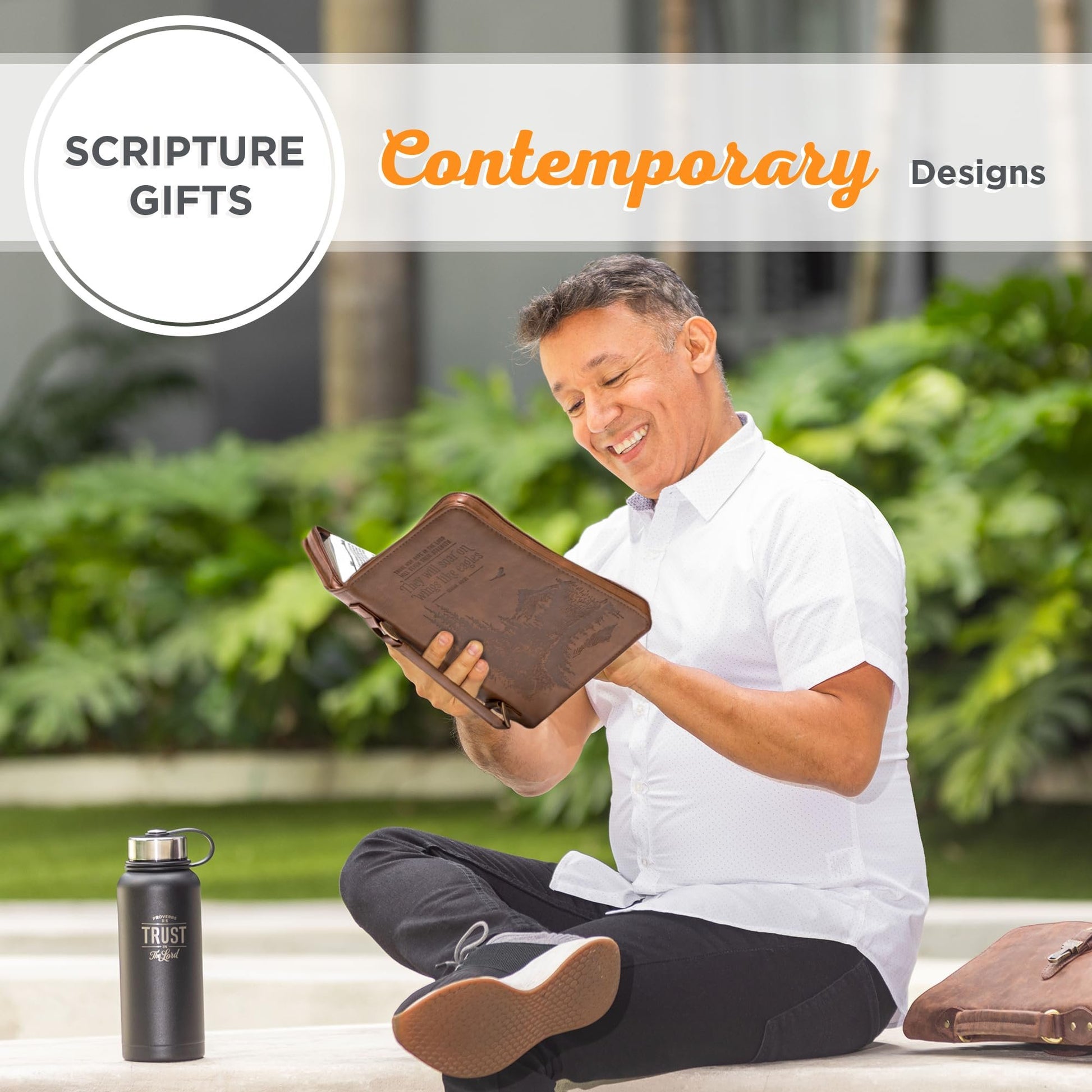 Christian Art Gifts Men's Classic Bible Cover On Wings Like Eagles Mountain Isaiah 40:31, Brown Faux Leather, MediumDurable: Protect your Bible from life’s mishaps with this classic brown Bible cover for men and women made from sturdy faux leather material that is easy to clean and will withstand daily wear.Scripture Bible Case: This handsome brown case features scripture sentiment from Isaiah 40:31 debossed on the front, along with two pine forest scenes on the front and back covers.Medium, Large Size: Note that Amazon specifications are exterior Bible cover dimensions. To ensure best fit measure Bible precisely & compare to size chart. Allow extra room to avoid a too snug fit.Convenient Accessories: Handle is easy to hold, or slip this Bible cover into a larger bag for easy travel to church or Bible Study. Interior pen loop secures your pen or highlighter when not in use.Secure Zipper Closure: Ensures your Bible stays clean and safe inside. Exterior slip pocket provides extra space for organization. Slip your loose notes, bulletins, or tissues inside for easy storage.