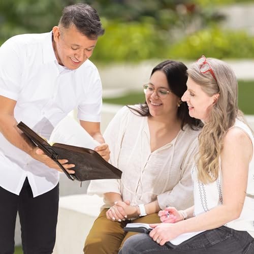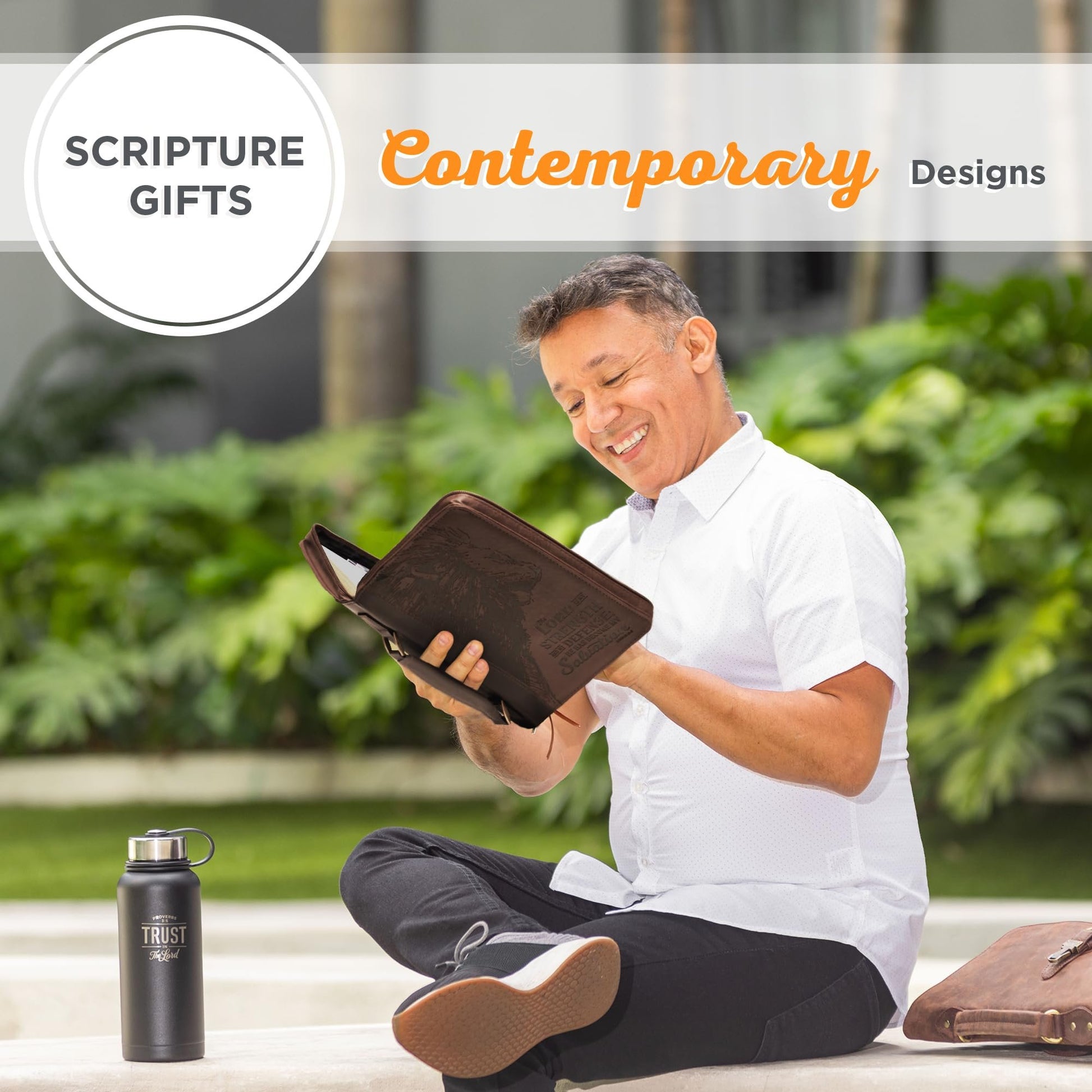 Christian Art Gifts Men's Classic Bible Cover The Lord is My Strength Lion Exodus 15:2, Brown Faux Leather, MediumDurable: Protect your Bible from life’s mishaps with this classic brown Bible cover for men and women made from sturdy faux leather material that is easy to clean and will withstand daily wear.Scripture Bible Case: This handsome brown case features scripture sentiment from Exodus 15:2 is debossed into the bottom right corner with a bold lion design above it.Medium, Large, XL Size: Note that Amazon specifications are exterior Bible cover dimensions. To ensure best fit measure Bible precisely & compare to size chart. Allow extra room to avoid a too snug fit.Convenient Accessories: Handle is easy to hold, or slip this Bible cover into a larger bag for easy travel to church or Bible Study. Interior pen loop secures your pen or highlighter when not in use.Secure Zipper Closure: Ensures your Bible stays clean and safe inside. Exterior slip pocket provides extra space for organization. Slip your loose notes, bulletins, or tissues inside for easy storage.