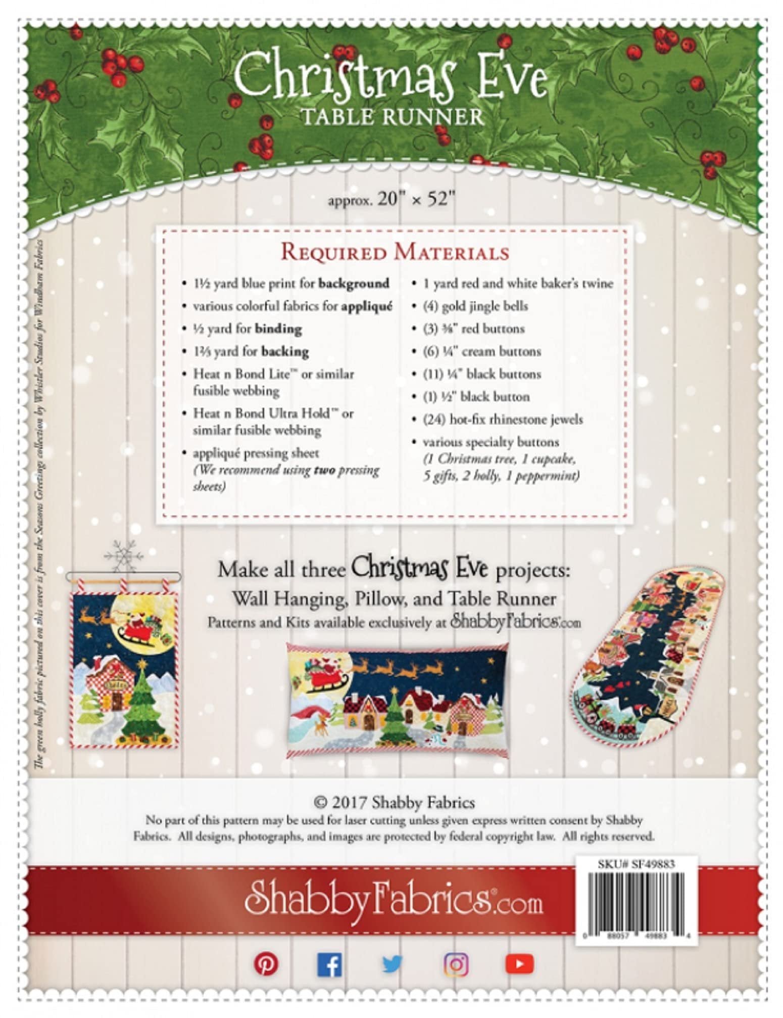 Designed by and exclusively available from Shabby Fabrics, The Christmas Eve Table Runner will bring all the magic and whimsy of Christmas to your home! To coordinate your entire home, you can also make the Christmas Eve Series Pillow and Wall Hanging. This Table Runner is BIG and measures approximately 20" x 50"!Pattern and diagrams only. Fabric not included.Fininshed Table Runner measures approximately 20" x 50"To coordinate your entire home, you can also make the Christmas Eve Series Pillow and Wall Hanging