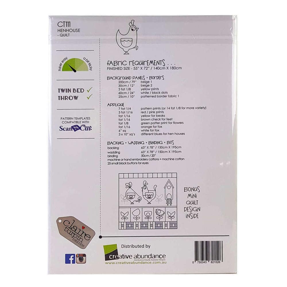 Claire Turpin Design Hen House Quilt PtrnClaire Turpin Design hen house quilt patternClaire Turpin Design hen house quilt pattern- applique this fun quilt with 5 different reversible roosters and hens, flowers, hen houses and a sly foxIncludes bonus mini quiltThe pattern is easy to follow for beginner to intermediate skill levelsThe instructions are laid out in easy to follow steps, with all measurements given in inches