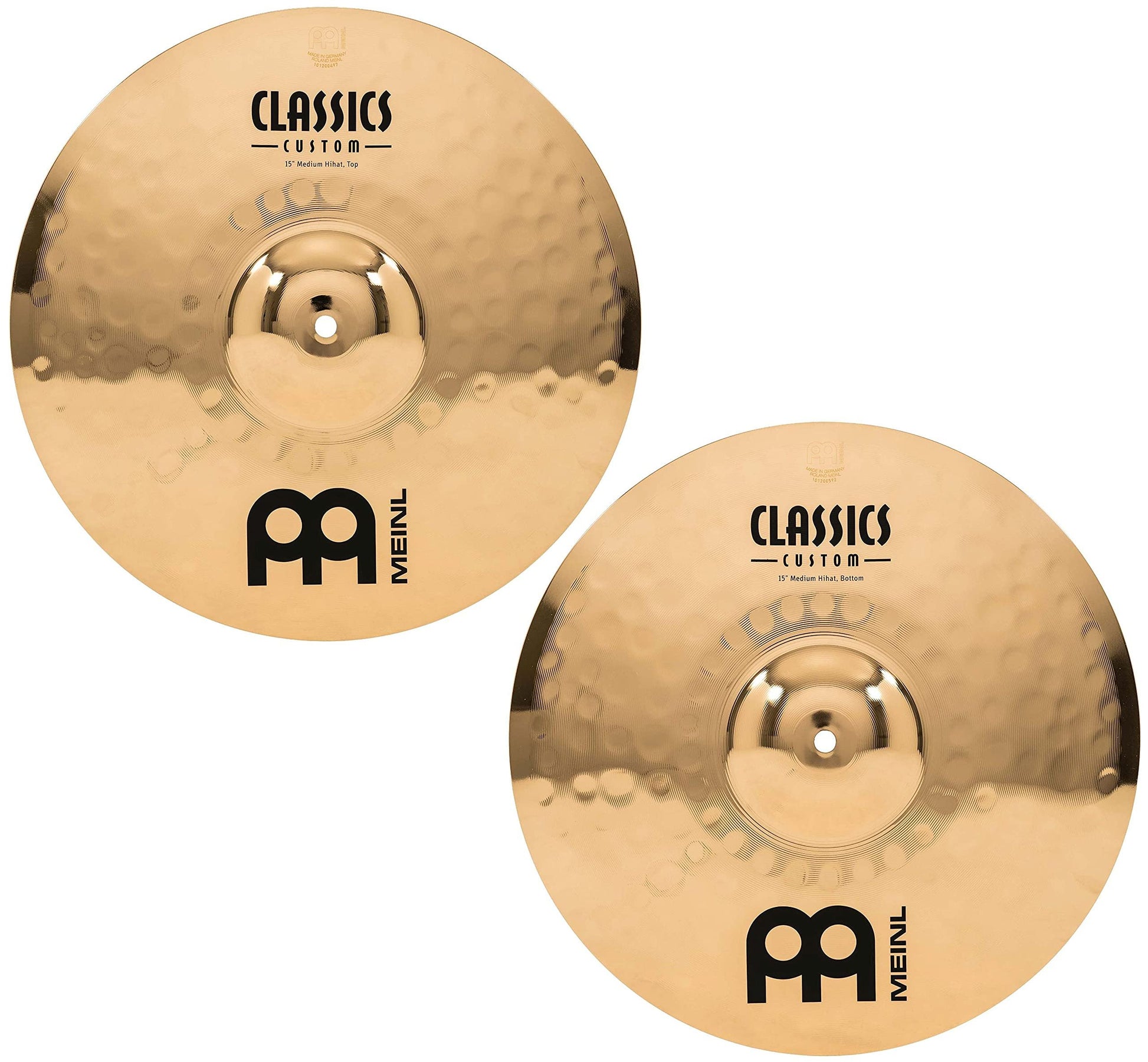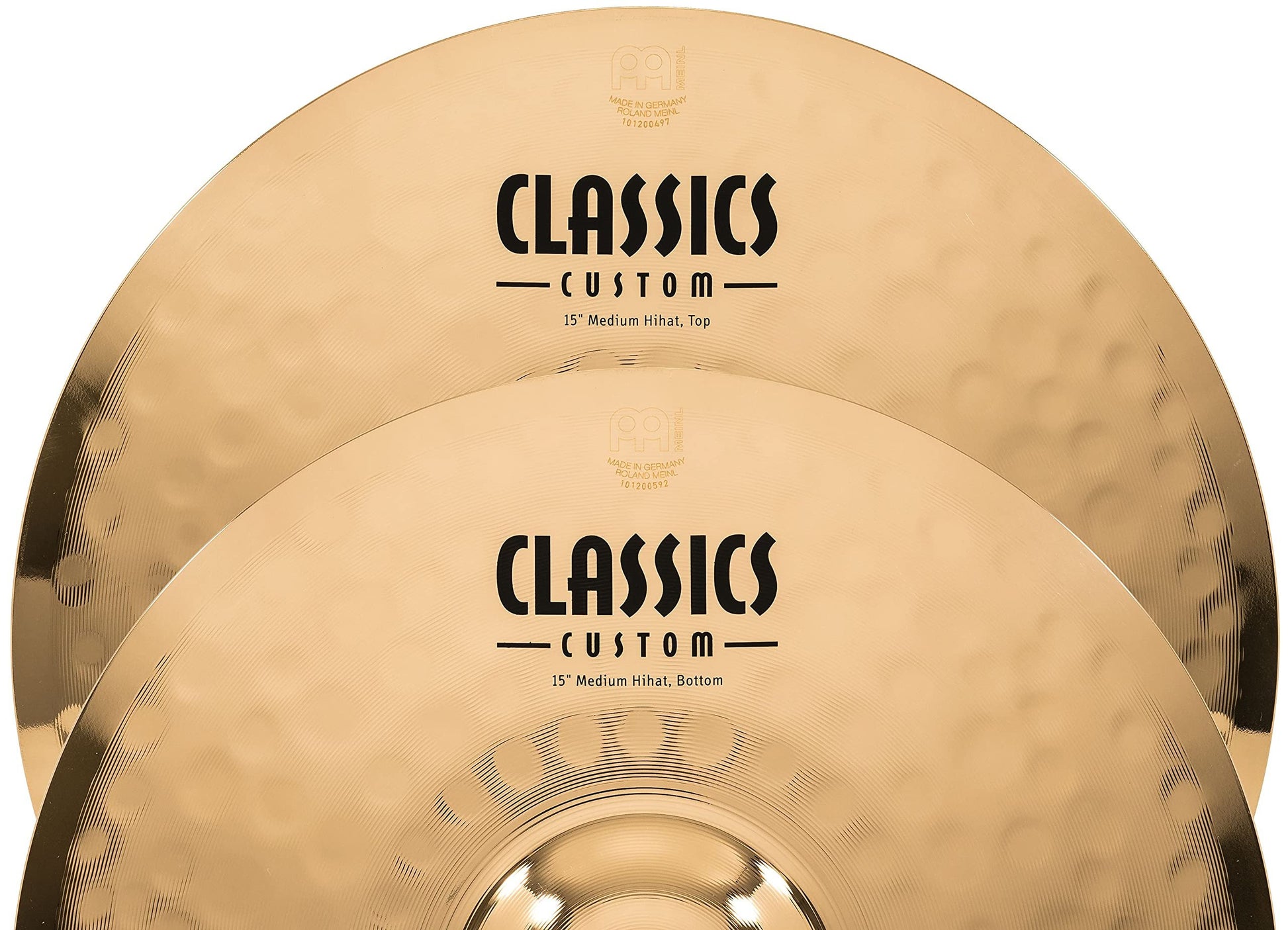 Meinl 14" Medium Hihat (Hi Hat) Cymbal Pair - Classics Custom Brilliant - Made in Germany, 2-YEAR WARRANTY (CC14MH-B)MADE IN GERMANY: Classics Custom Brilliant cymbals are made at the Meinl Cymbal factory in Gutenstetten, Germany; they're formed with high-tech German engineering for consistent bright tone, powerful feel, and durability across all modelsWHY IT MATTERS: these cymbals will make your kit sound and look professional; plus, the big assortment makes it easy to find your voice whether it's just one piece or a matching complete setWHAT'S IN THE BOX: 14" hihats (top and bottom cymbals); these hihats have definition and "chick" when played closed; their heavy "slosh" when played open punches through with sizzling bright overtonesDRIVING THE SOUND: made of durable B12 bronze alloy weighted and shaped for loud volume and controlled sustain; fully lathed surfaces with brilliant finish produce clean tone, and precision hammering dials-in musical frequenciesTHE UPSIDE FOR YOU: you'll be heard next to distortion charged guitar amps or in wide-open, large rooms with a bright cymbal cut that doesn't overtake or ring out foreverOF NOTE: these are the medium weight Classics Custom hihats; their medium weight gives them a wide dynamic rangeBEST FOR: rock, metal, fusion, worship; ALSO GREAT FOR: high-energy pop, R&B, funk