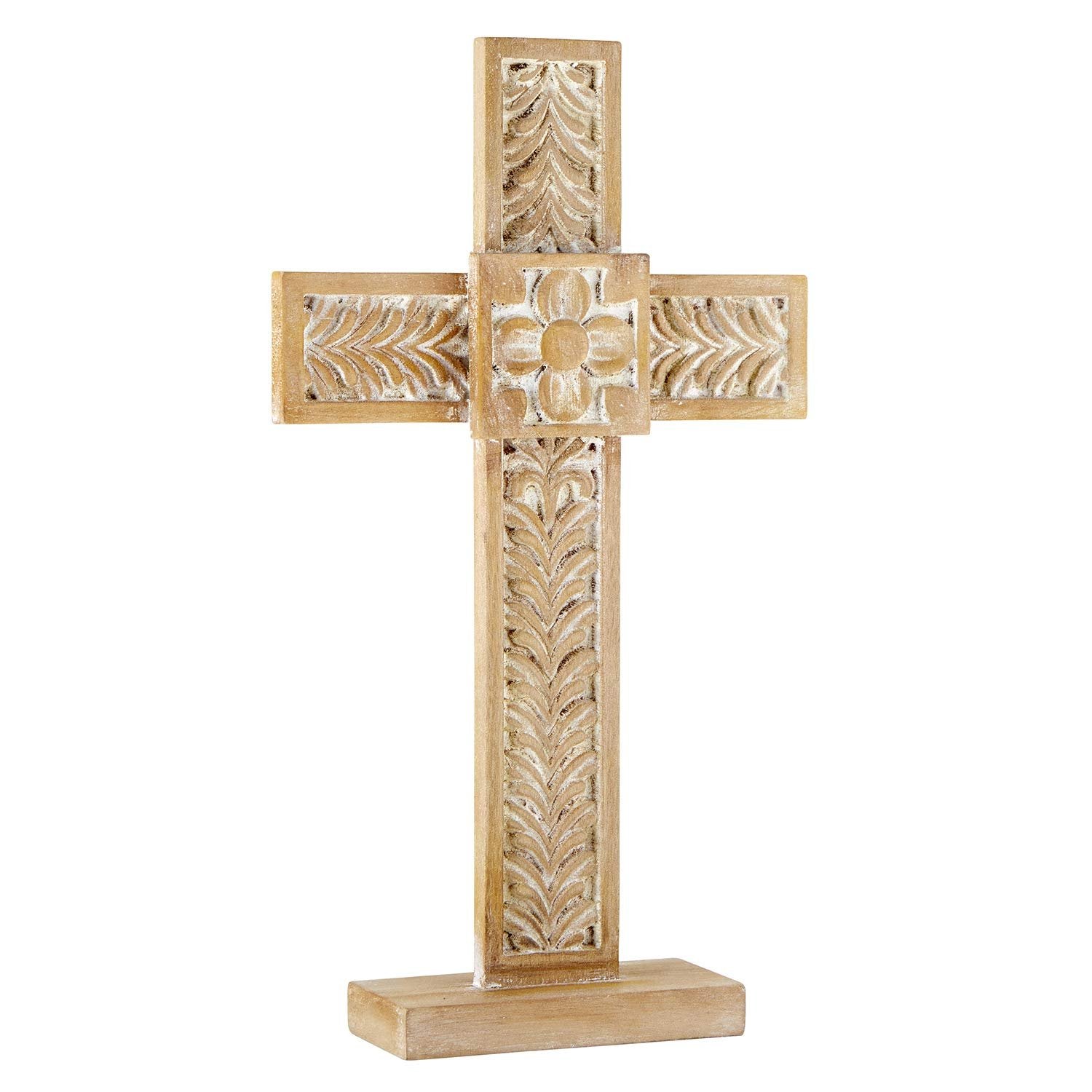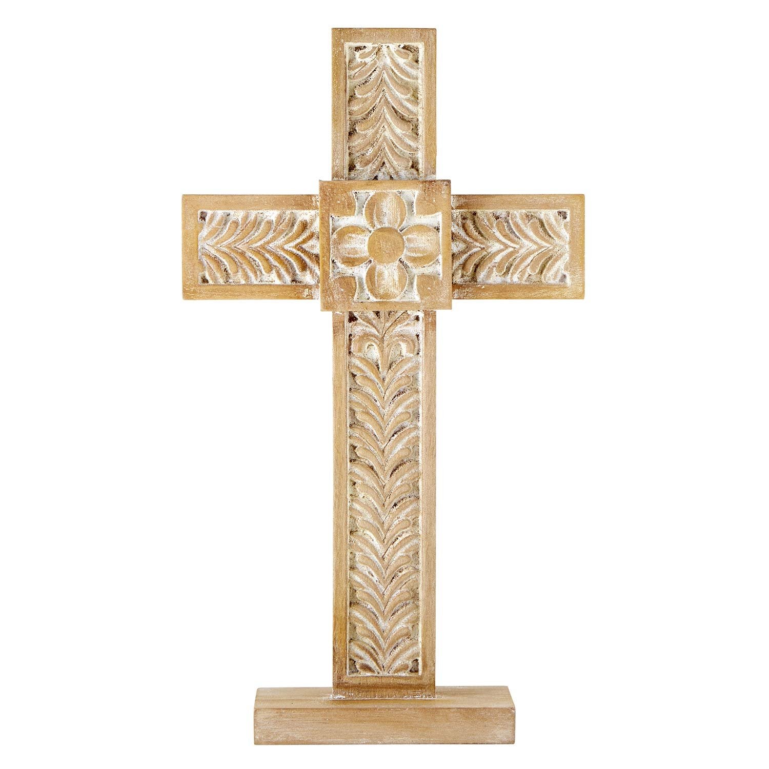 Creative Brands Faithworks - Whitewashed Wood Cross, 8 x 14-Inch, Carved Floral - StandingWOODEN STANDING CROSS: Rustic wood adds dimension and warmth to the roomDIMENSIONS: Measures 8 x 14-inches; square base adds stabilityCARVED FLORAL: Whitewashed wood with carved leaves and rose in the centerNEUTRAL STYLE: Ideal gift for family and friends or even yourself, add to a collage display alone in the center of a small table, on the mantle or as a centerpiece of a displayFAITHWORKS BY CREATIVE BRANDS: Has gifts and décor for every day and every occasion that encourage, resonate with and uplift the soul; look for additional items to coordinate or simply inspire from Faithworks at Creative Brands