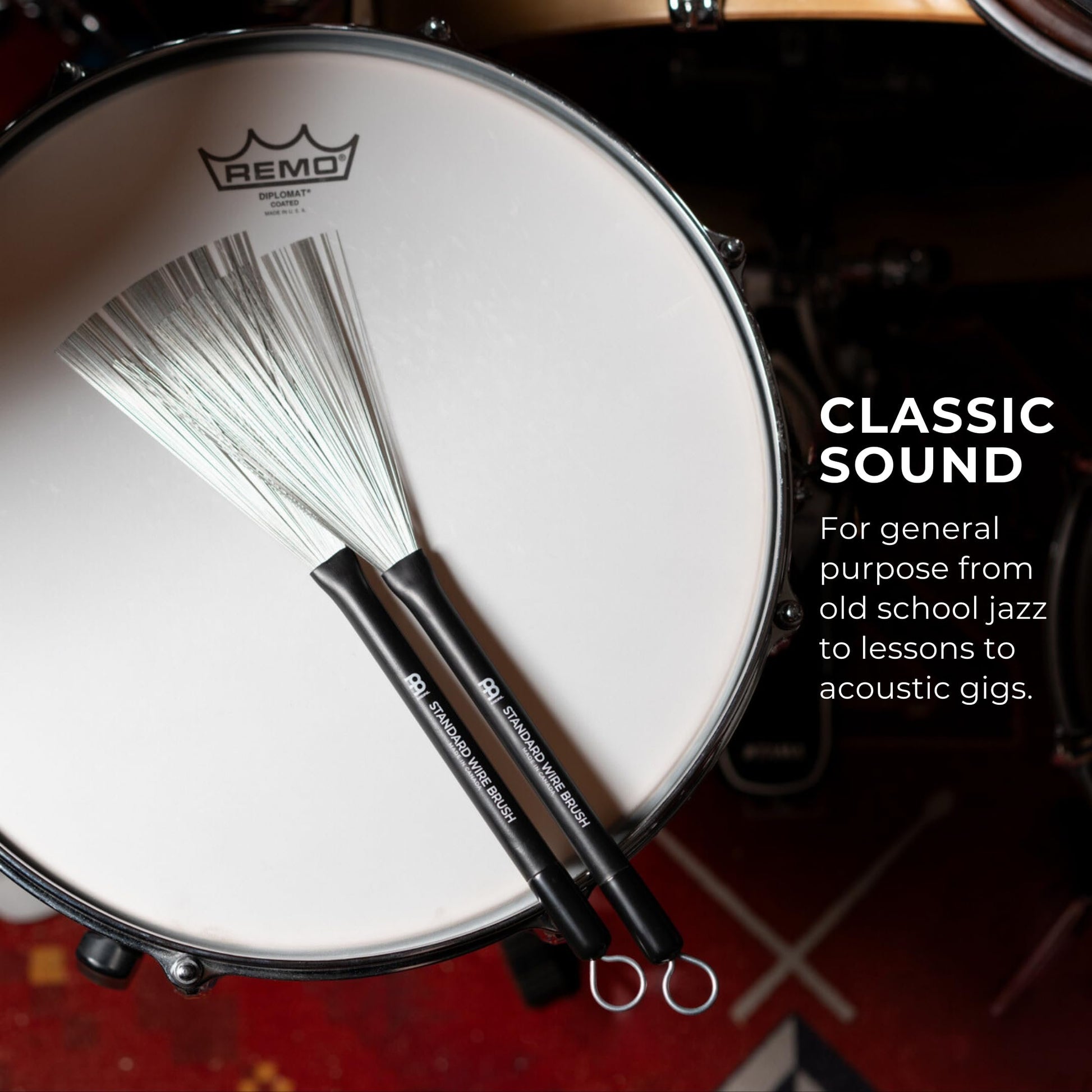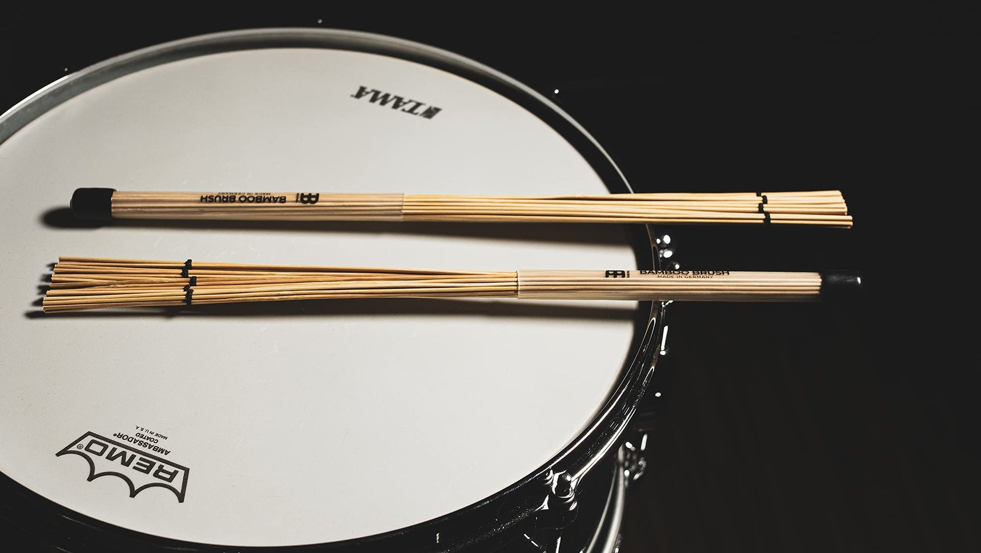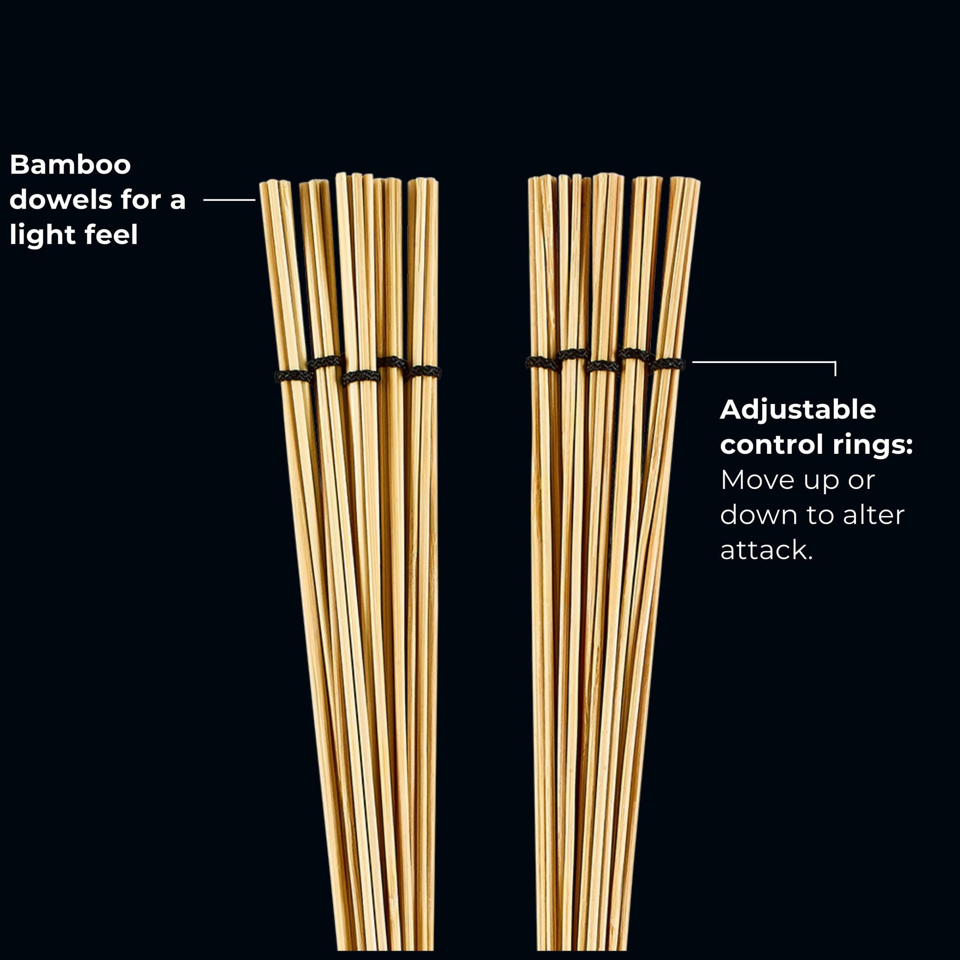 Meinl Stick & Brush Bamboo Drum Brushes Pair, Multi-Rod Bundle Specialty Drumsticks — for Jazz, Acoustic, and Low Volume Music, Natural, 15.120" Long, 0.560" Grip (SB205)BETWEEN BRUSHES AND STICKS: the Meinl Bamboo Brush has a texture sweet spot that's more delicate than drumsticks but sharper than wire brushesWHY IT MATTERS: they're perfect for volume control or creating a different mood that drumsticks and wire brushes can't touch; you can play the Bamboo Brushes all around your kit to draw out different tonesBAMBOO BRUSH SPECS: 15.120" long, 0.560" diameter grip, light bamboo dowels, sold in pairsCATCH UP QUICK: these brushes are made in Germany from premium bamboo; the bamboo dowels are high strength but also more elastic feeling than other materialsOF NOTE: comes with adjustable control rings that you can move up or down to alter the attack; position toward the tips for a tight sound or closer to the grip for a loose brush effectZOOM IN: the dowel tips are cut straight (no filing down); straight edge tips are needed on this brush to maintain a certain level of attack on all surfaces (drum heads, cymbals, percussion)THE BOTTOM LINE: Meinl Bamboo Brushes expand your low volume capabilities on the drum kit