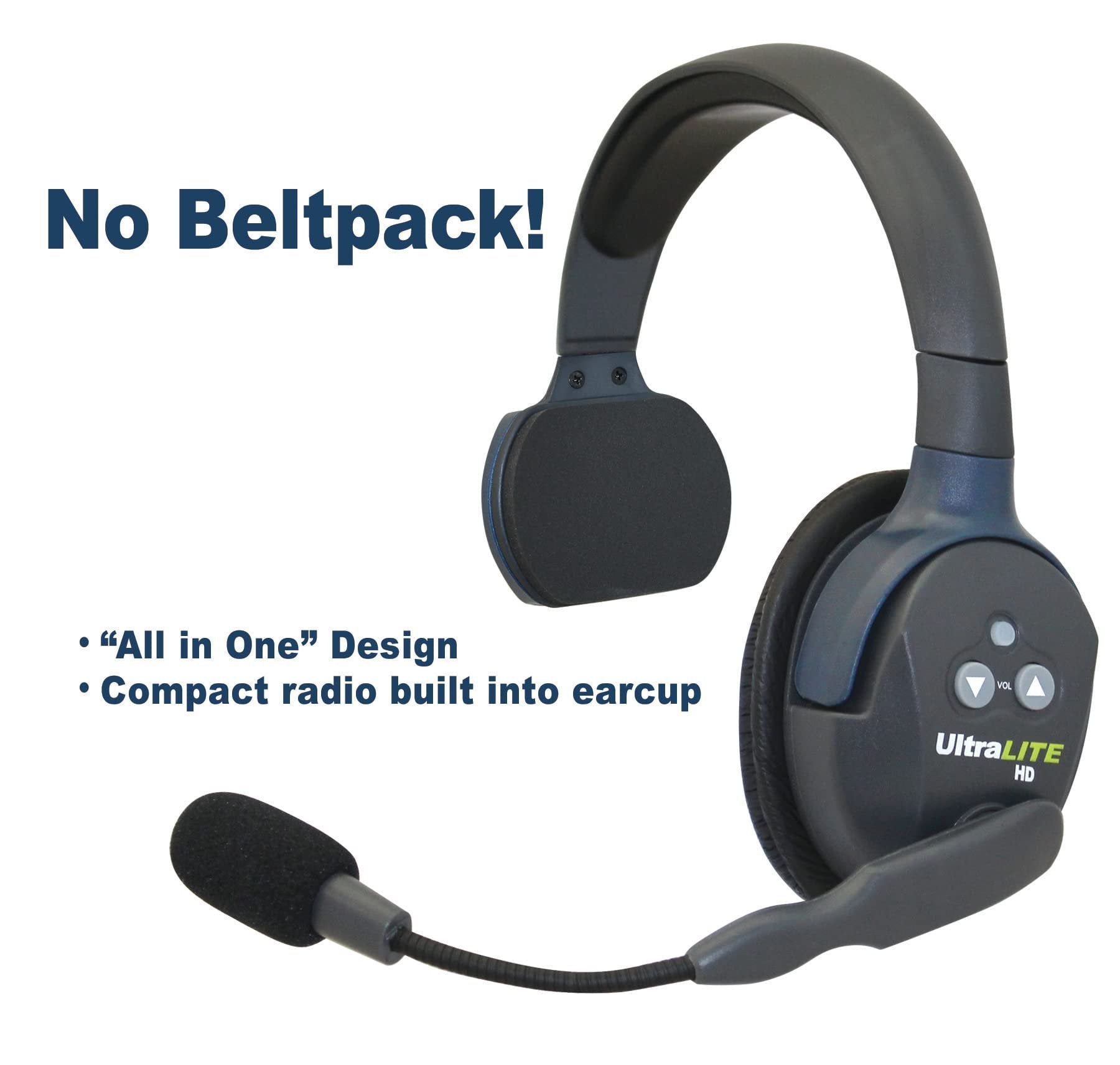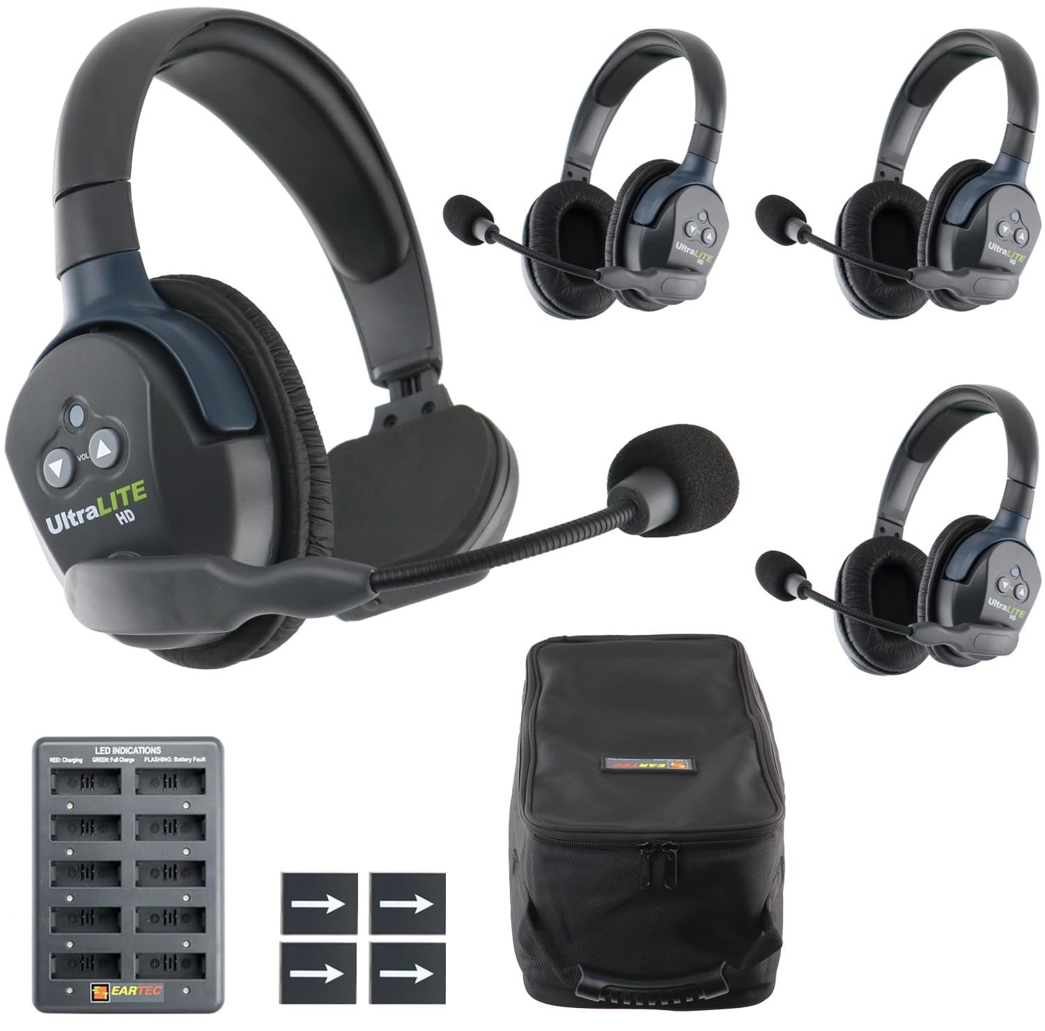 The Eartec UL422 is a professional full duplex intercom for four people that need to communicate and work with their hands. This compact system features four UltraLITE wireless headsets, one single-ear “Main” that sets the digital sequence, one single-ear "Remote" headset, and two dual-ear “Remote” headsets. UltraLITE utilize Digital Enhanced Cordless Technology (DECT) to provide professional, simultaneous wireless communication within a quarter mile range.The UltraLITE series are a breakthrough because all electronics, including the battery are built right inside the headset earcups, eliminating wires and belt worn radios. The system does not require a base station, and the headsets are field programmable, meaning that the system can be expanded at any time.No FCC License RequiredINCLUDES: 1 ULSM Single-Ear Main Headset, 1 Dual-Ear Remote Headset, 2 ULDR Dual-Ear Remote Headsets, 4 Rechargeable Lithium Batteries, 10 Bay Multi-port Charger and a Softside Carrying Case.HANDS-FREE FULL DUPLEX: Wireless headsets operate on 1.9 GHz frequency to avoid interference with other devices; allows for simultaneous communication for 4 users. System expandable for up to 5 users.EXCEPTIONAL PERFORMANCE: Up to 1,000 ft LOS wireless range; up to 6 hours of talk time on a single charge; pivoting microphone allows for the headsets to be worn on either left or right side.GREAT CLARITY: Noise-cancelling microphone that automatically mutes when pivoted upwards; high-quality voice communication even in high-noise environments.PERFECT FOR: video production, stage production, boat operators, drone operators, construction sites, RVs, UTVs and more!