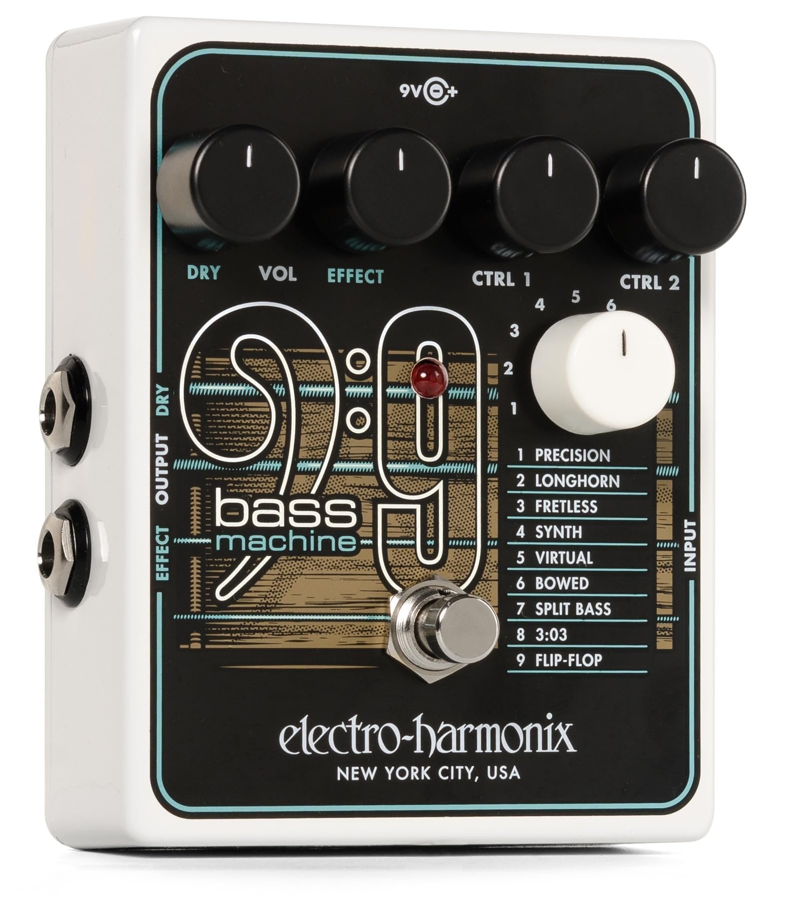 The polyphonic BASS9 Bass Machine transforms a guitar into nine different basses and requires no special pickups, MIDI or instrument modifications. It relies on the same technology powering all EHX 9 Series pedals, like the award winning MEL9 Tape Replay Machine, but features a new algorithm maximized for transposing one to two octaves down with superior dynamics and tracking. A rotary switch allows the user to select the sound of their choice, as follows: PRECISION: Pays homage to the iconic Fender P Bass LONGHORN: Emulates the Danelectro 6-string bass, ideal for baritone type tones FRETLESS: Features both electric and standup fretless basses. SYNTH: A tribute to the classic Taurus Synthesizer VIRTUAL: Lets the user adjust the bass’s body density and neck length for a variety of bass sounds BOWED: Classic bowed bass SPLIT BASS: Makes it possible for the guitarist to play bass on the lower strings (all notes below F#3) and chords or melody with the higher strings. 3:03: A polyphonic salute to the sought after Roland TB-303 vintage bass synth FLIP-FLOP: Inspired by EHX’s Octave Multiplexer, it provides a ’70s style logic driven sub-octave generator that tracks without glitches. The pedal is equipped with independent Effect and Dry volume controls so guitarists can precisely tune their mix at the Effects output jack, plus an always-active Dry output jack that outputs the input signal at unity gain. Controls 1 and 2 have been designed to adjust specific parameters for each of the nine programs. For example, in PRECISION, CTRL 1 controls the sub-octaves while CTRL 2 imitates the original instrument’s tone control. The BASS9 comes equipped with a standard EHX 9.6DC200mA power supply.