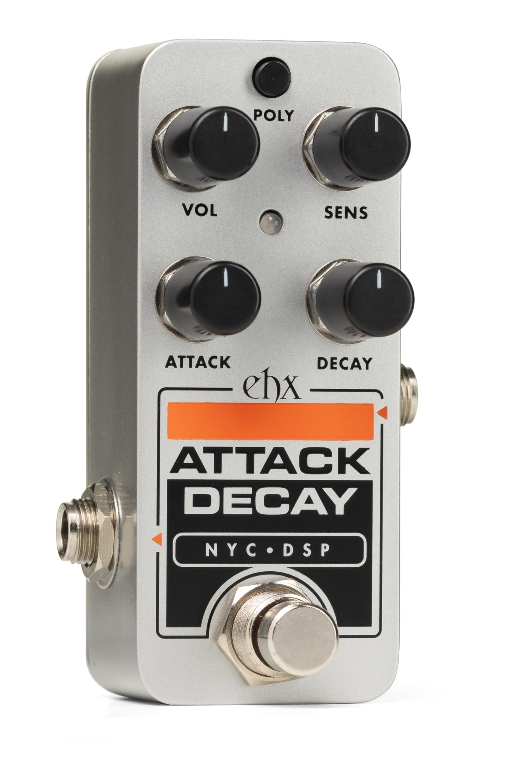 Seductive swells and reverse tape effects push the envelope on any pedalboard! The original Attack Decay Tape Reverse Simulator is known for producing volume and reverse swells, backward tape sounds, artificially short staccato notes, and bowed instrument effects. In 2019 the digital Attack Decay reissue was released, and now the Pico Attack Decay gives us volume envelope effects in a simplified, compact package. The Pico Attack Decay allows you to dial in volume swells and decays, both in Mono mode—one volume envelope for all notes you play—and the revolutionary Poly mode where each note to has its own volume envelope creating cascading swell effects and leads with agile attack smoothing. With intuitive functionality and simple controls, the Pico Attack Decay opens up creative avenues for any player interested in pushing the (volume) envelope. The Pico Attack Decay is both powerful and simple with four knobs and a mode button that let you create a wide variety of effects. The ATTACK knob sets the swell or fade-in speed of the volume envelope while the DECAY knob sets the fade-out speed of the volume envelope. Set the ATTACK higher for languid volume swells. Set the DECAY higher for artificially staccato notes for synth-like punches. SENS adjusts the threshold for triggering the envelope. VOL controls the overall output volume. A hidden BLEND control allows you to blend wet and dry signals for even more flexibility in tone.Volume envelope effects of the EHX Attack Decay ReissueMono Mode: single volume envelope for all notes you play each time envelope is triggedPoly Mode: Individual envelopes for each note playedVOL adjusts overall output volumeATTACK sets fade-in time of volume envelope