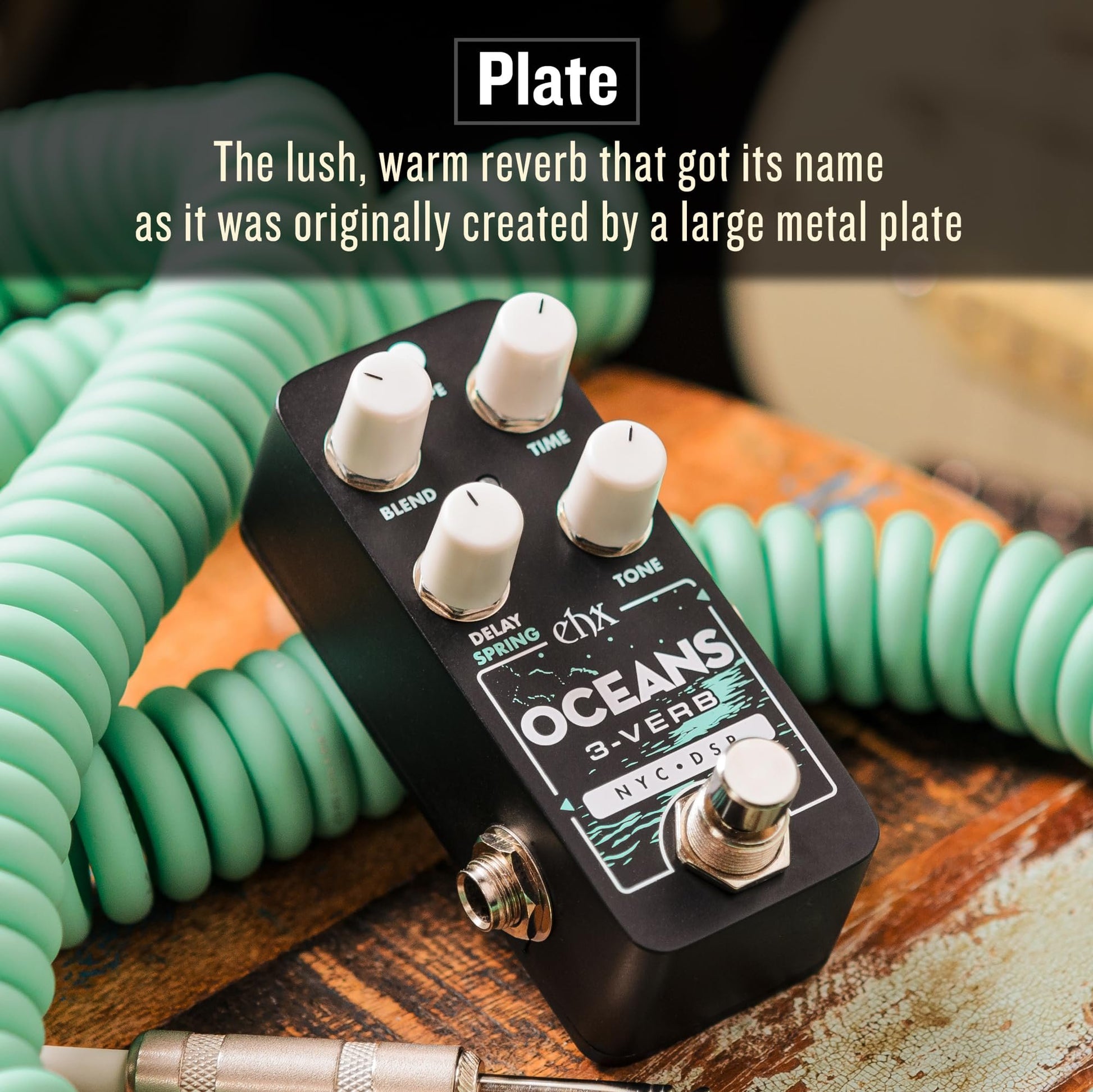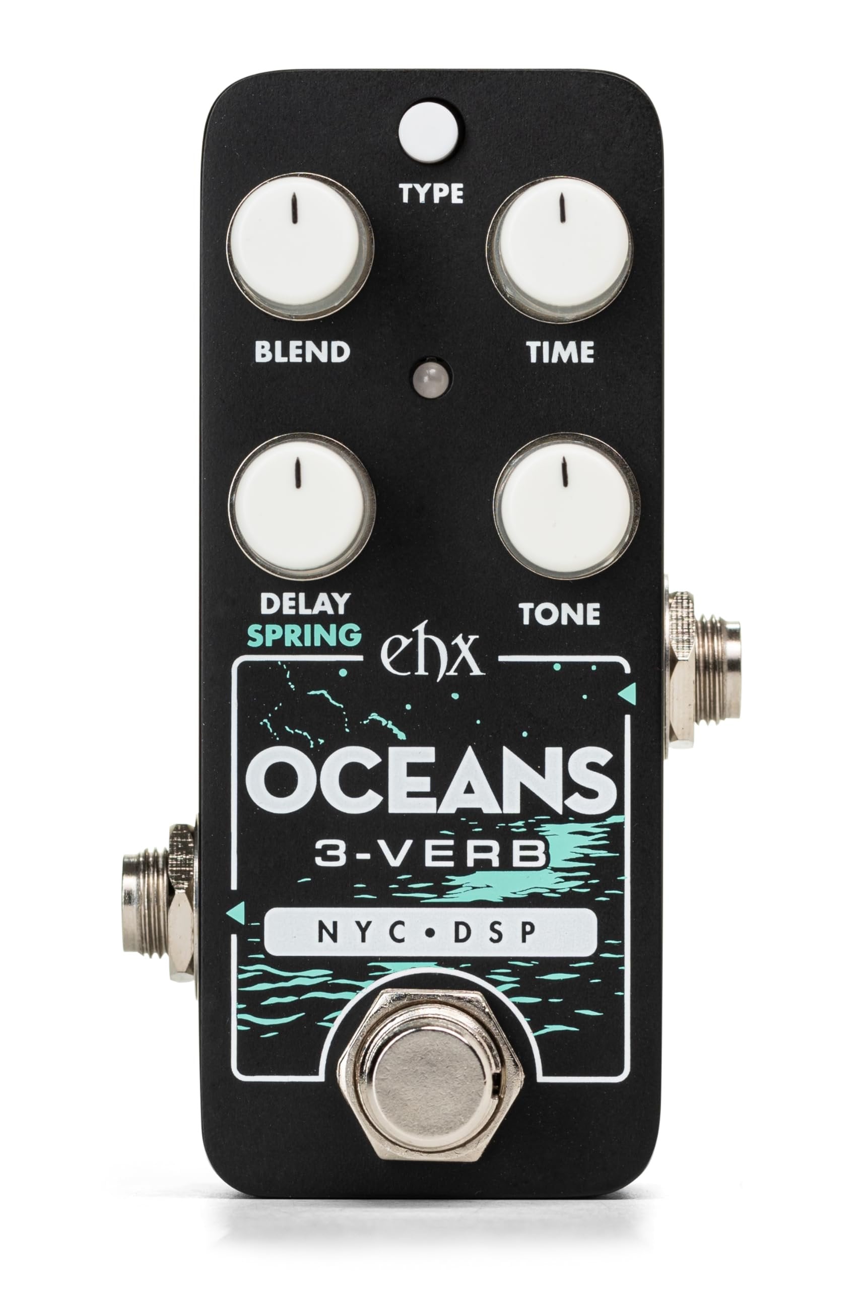 Ultra-compact ambience featuring the spacious sounds of Spring, Plate and Hall Reverb! The EHX Pico Oceans 3-Verb is an ultra-compact reverb pedal packed with the essentials of ambience with plenty of flexibility and control. This Pico-sized reverberator adds the huge sounds of Spring, Plate, and Hall reverb to any pedalboard while using minimal space. Adjustable decay time, pre-delay / spring length, and tone make the Oceans 3-verb able to create a plethora of spacious sounds. SPRING – pays homage to the classic Fender 6G15 tube spring reverb PLATE – the lush, warm reverb that got its name as it was originally created by a large metal plate HALL – the rich reverberant sound of a grand concert hall A comprehensive control set allows for tailored sound to any setup. BLEND adjusts from 100% dry to 100% wet. TIME controls the decay time of the reverb. DELAY/SPRING sets the pre-delay time in PLATE and HALL mode or selects between 3 springs lengths in SPRING mode. The TONE control adjusts the overall brightness of the reverb from bright and airy to warm and smoky. Additionally, TAILS bypass can be selected so the reverb continues to decay after the pedal is switched to bypass. This allows for a more natural sounding decay when turn the reverb off. Infinite Reverb can be achieved by maxing out the TIME control in both PLATE or HALL mode or by pressing and holding the footswitch. This creates a building ambient soundscape until you release the footswitch.3 different reverb types: SPRING, PLATE, & HALLAdjustable Decay, Pre-delay and Tone for flexibilitySPRING mode features 3 selectable spring lengthsInfinite Reverb function for creating ambient soundscapesPower supply included
