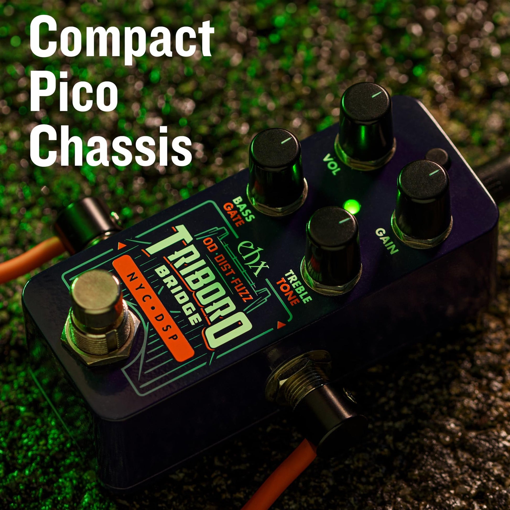 The EHX Pico Triboro Bridge is a tri-mode drive box with a wide range of tonal possibilities. Featuring Overdrive, Distortion, and Fuzz modes, it bridges any gap in your gain. With a powerful EQ, input contouring, and a pico-sized footprint, the Triboro Bridge can be your tonal keystone or a welcome change from the routine drive. Starting with Overdrive mode, the gain spectrum ranges from low to mid with an open voicing that can be used as a light always on drive or a solo boost. Engage the Triboro’s Distortion mode for additional gain-staging for a tone from crunchy rhythms to fully saturated leads. Transform the pedal into something completely different with the Fuzz mode’s over-the-top gain, Gate and Low Pass Filter. The Triboro Bridge controls features Volume and Gain knobs to control the overall output and saturation of the tone. In Overdrive and Distortion modes, the Treble and Bass knobs act as a Baxandall EQ for simple yet effective tone shaping. In Fuzz mode the Treble knob is now the gate more, controlling the Fuzz’s noise gate threshold, and the Bass knob controls a Low Pass Filter for extreme tonal variations. Additionally, the Triboro Bridge features an Input Contouring EQ which can be applied to your tone at the input, for a more modern, sculpted tone in all modes.Wide range of saturation with Overdrive, Distortion, and Fuzz modesTreble control boosts or cuts high end in OD and Dist modeBass control boosts or cuts low end in OD and Dist modeFuzz mode features Gate and Low Pass FilterPower adapter included