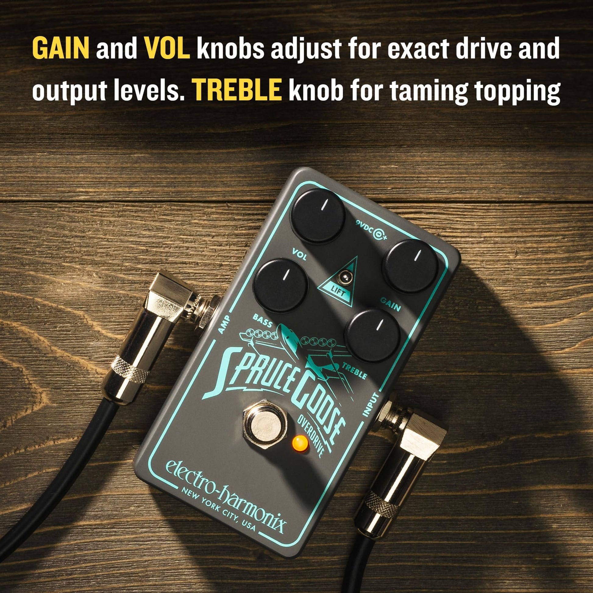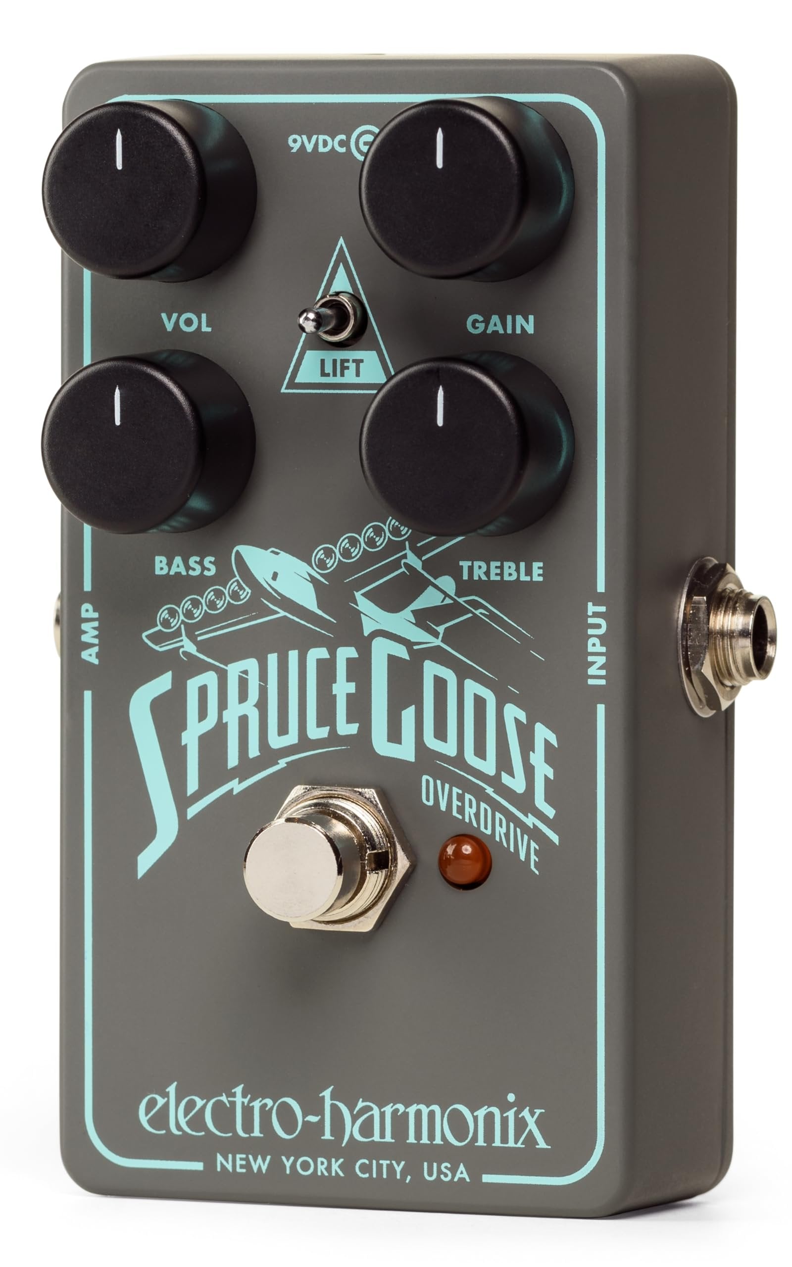 Liftoff with the EHX Spruce Goose Overdrive, an elevated take on a Bluesbreaker-style OD with a smooth, rich breakup that retains clarity and dynamics. The Spruce Goose soars with a host of new features including a LIFT switch accessing 3 input gain settings, additional output, and expanded EQ to send you tone flying! From meaty boost to smooth singing leads, the Spruce Goose steers your tone into a variety of inspiring and musical directions. The engine of the Spruce Goose is an overdrive circuit renowned for its natural breakup and amp-like response. This circuit is then elevated to new heights by the LIFT switch which selects between 3 levels of input gain. LIFT effectively works as an input boost, goosing the front end of the drive circuit hitting harder and producing a more compressed, saturated tone while still retaining its dynamic feel and transparent tone. GAIN and VOL knobs adjust for exact drive and output levels. EQ of the pedal consists of a TREBLE knob for taming topping and an active BASS knob to cut or boost bass frequencies. BASS is especially helpful for adding girth to single coil guitars or tightening the low end on warmer humbucker guitars. The Spruce Goose also features mechanical relay true bypass switching with latching and momentary action. Tap the footswitch for a normal latching toggle or press and hold the footswitch for a momentary blast of gain and boost! Great for stepping out in front of the mix for pulling quick lick or moment of sonic chaos.Enhanced output rangeLIFT Switch adds gain to push saturationActive BASS Knob sets low end responseVOL, GAIN and TREBLE knobs9V battery included (9V adapter optional)