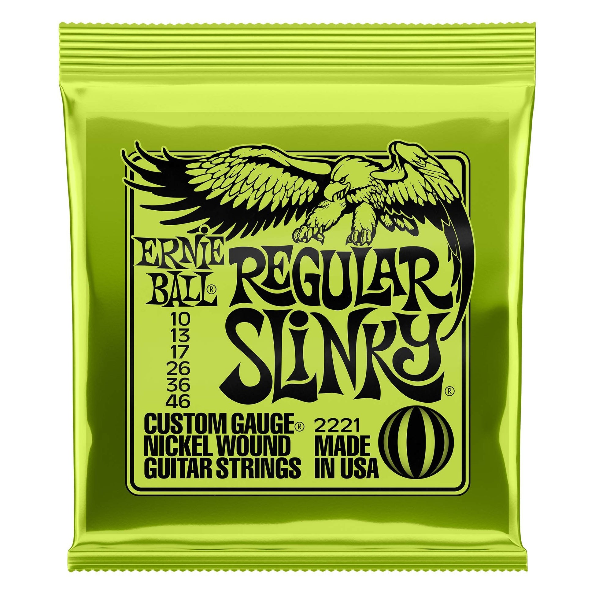 Ernie Ball Electric Regular Slinky Guitar Strings Sizes 10 to 46 Free Shipping! 4 Sets of Strings Ernie Ball Regular Slinky Electric Strings are our top selling set, and are favored by many musicians around the globe. Regular Slinky strings are played by Eric Clapton, John Mayer, Steve Vai and legions of guitar players worldwide. These strings are precision manufactured to the highest standards and most exacting specifications to ensure consistency, optimum performance, and long life. Regular Slinky wound strings are made from nickel plated steel wire wrapped around a hex shaped steel core wire. The plain strings are made of specially tempered tin plated high carbon steel; producing a well balanced tone for your guitar. Gauges .010 .013 .017 .026 .036 .046