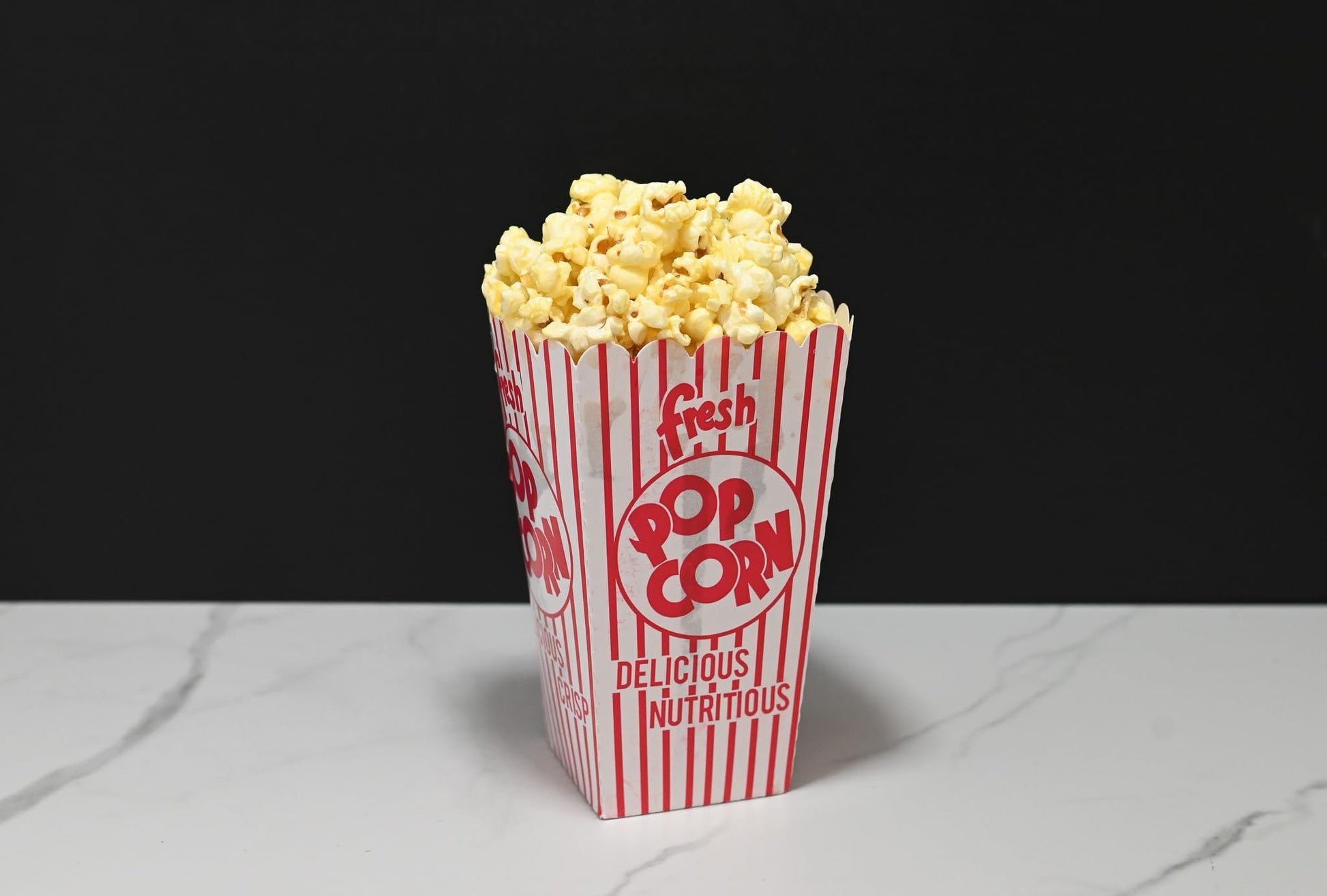 Popcorn mounted into a red and white cardboard popcorn box. (Product is made with real popcorn sealed with resin)Fake Popcorn